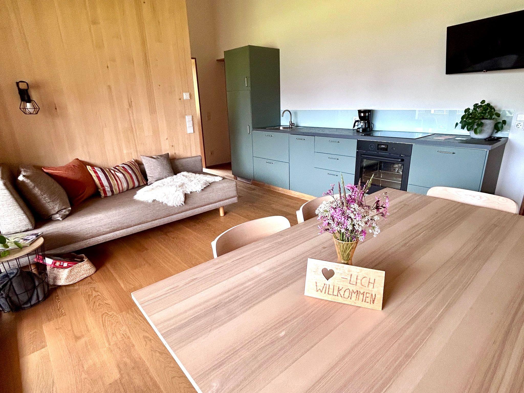 Unsere gemütliche Ferienwohnung (60 m²) bietet Platz für 2-4 Personen und ist der perfekte Rückzugsort für eine Auszeit in den Bergen. Sie verfügt über zwei Schlafzimmer, ein Bad mit Dusche sowie ein separates WC. Die offene Wohnküche mit Balkon lädt zum Kochen, Entspannen und Genießen ein und bietet dabei einen atemberaubenden Blick auf die wunderschöne Bergwelt des Bregenzerwaldes.