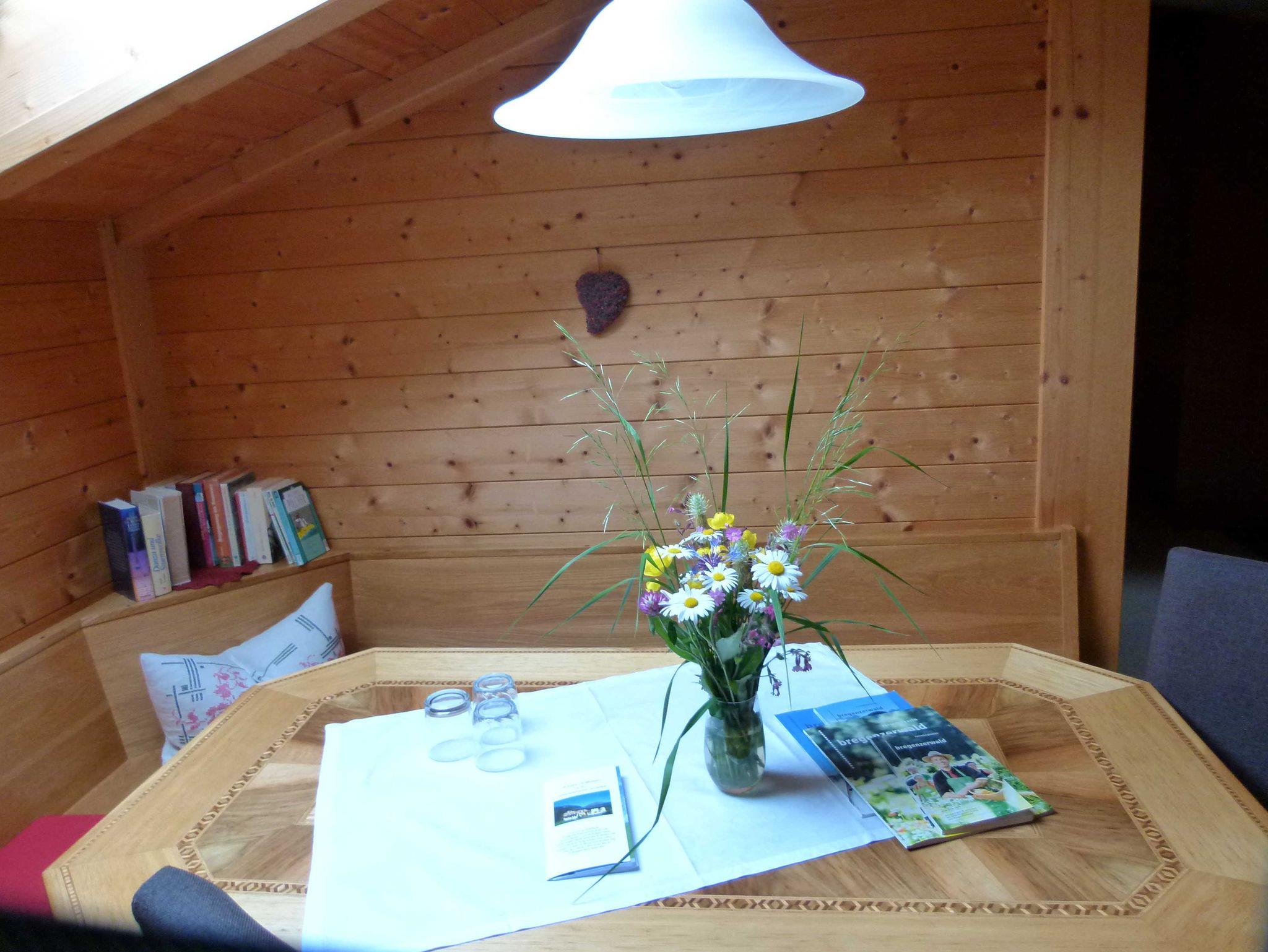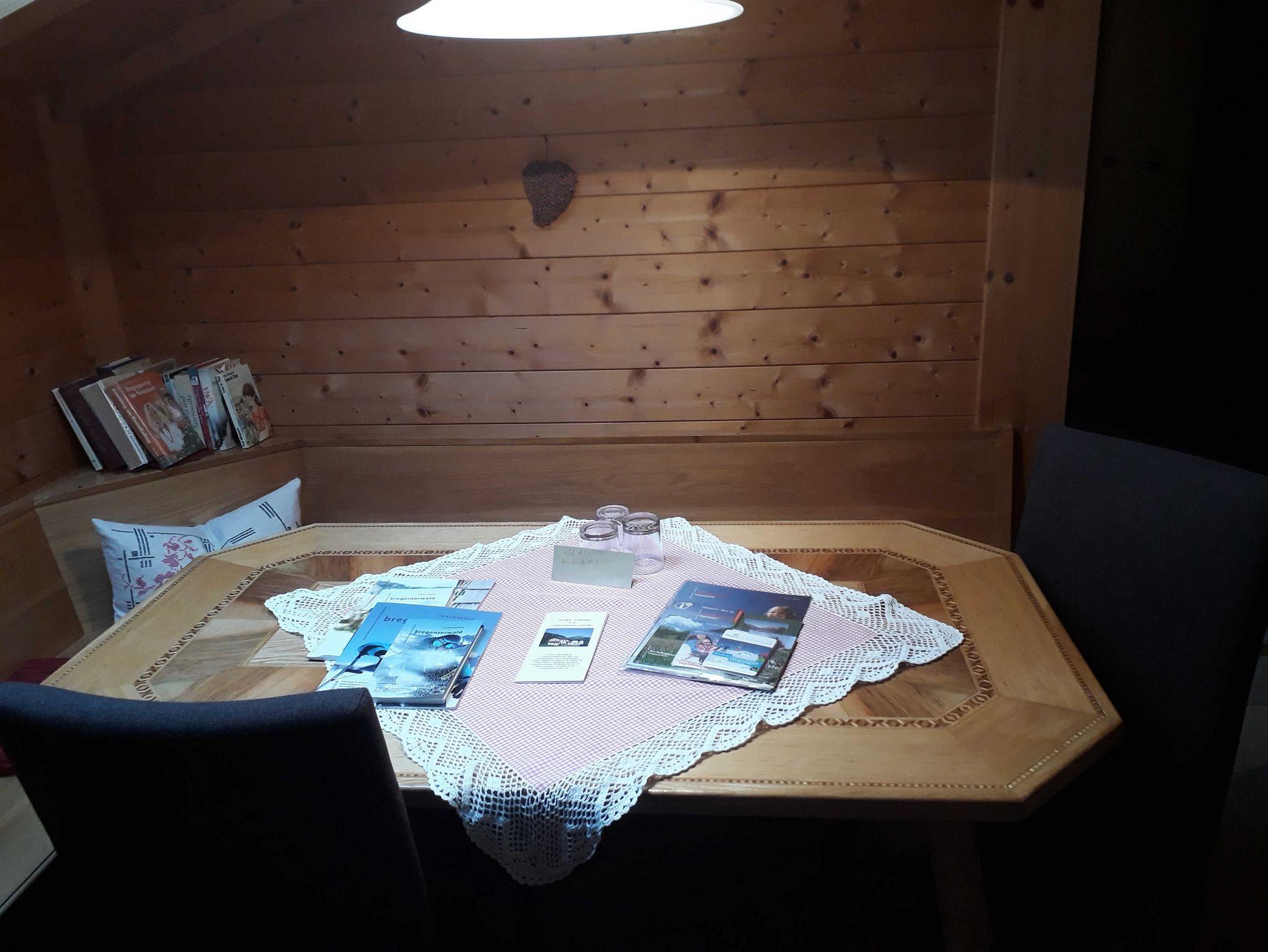 Das 3-Bettzimmer oder Familienzimmer KANISFLUH befindet sich im Dachgeschoß auf der Westseite unseres Hauses. Somit haben Sie am späteren Nachmittag bzw. am Abend die Sonne im Zimmer. Sie haben einen wunderbaren Blick auf die Bergwelt und auf die Gemeinde Au. In der hellen Ecke unter dem Dachfenster ist ein großer Tisch mit Prospekter von SchoppernAU und vom Bregenzerwald. Auf einer großen Eckbank können Sie gemütlich Spiele