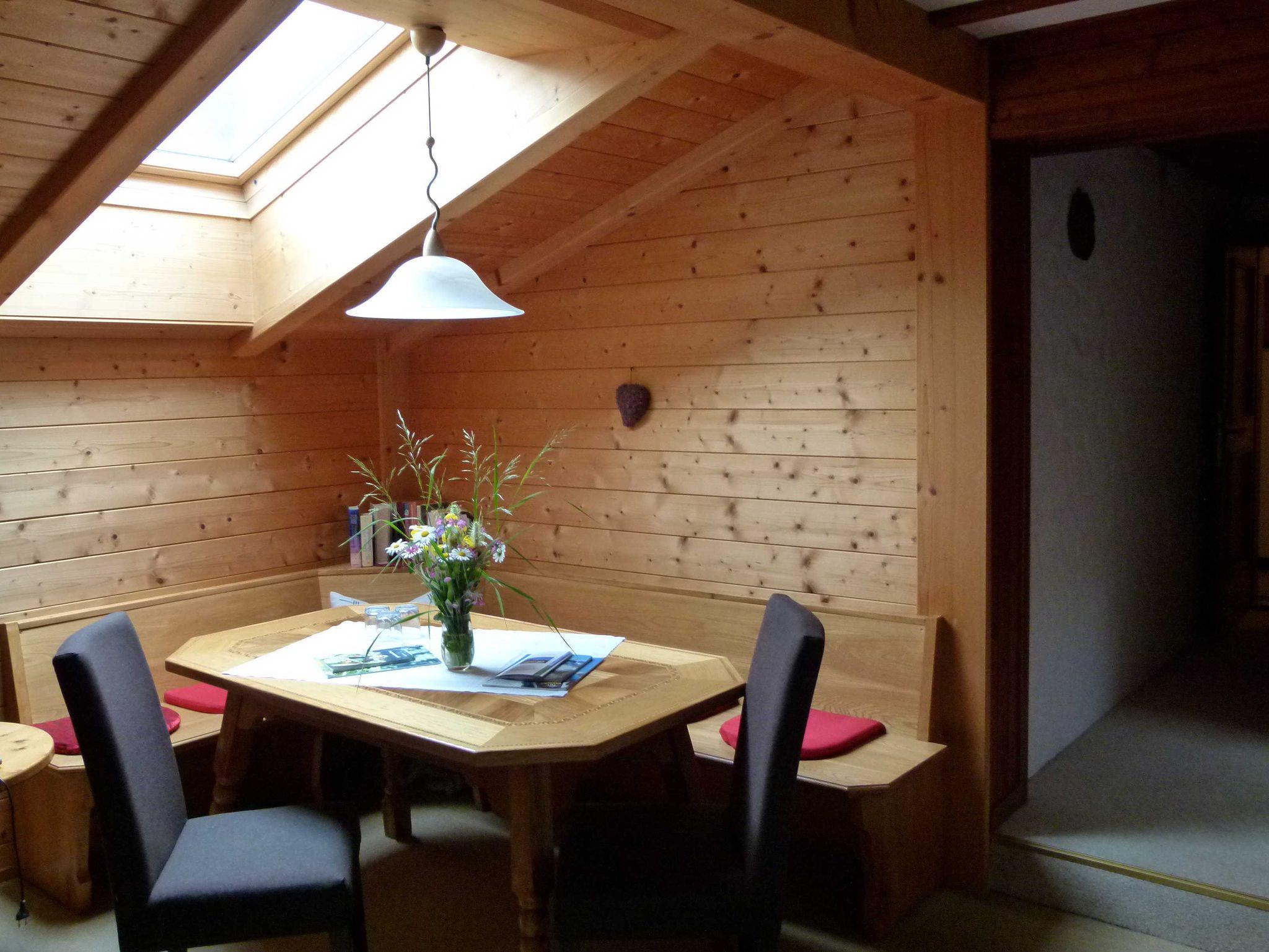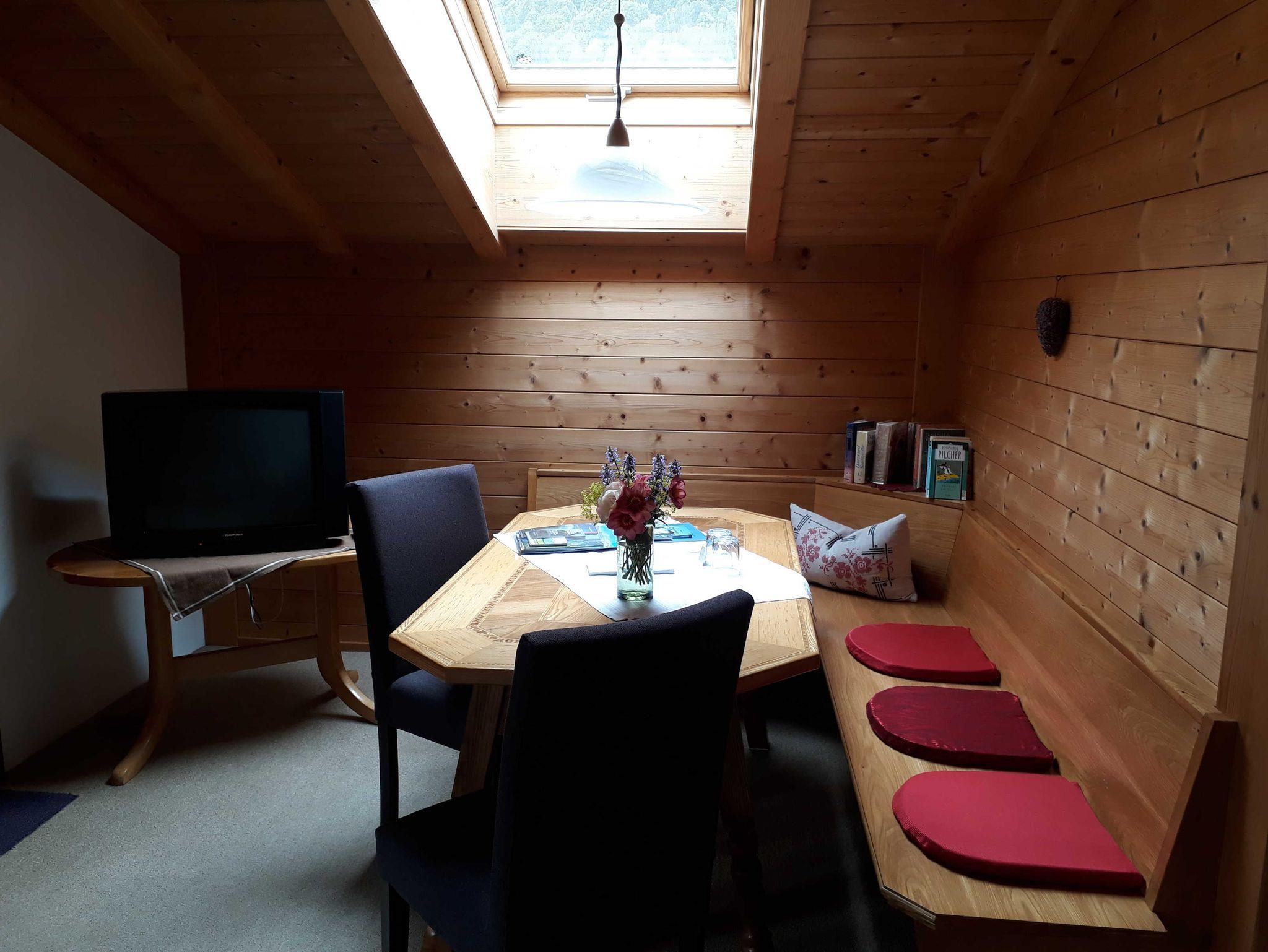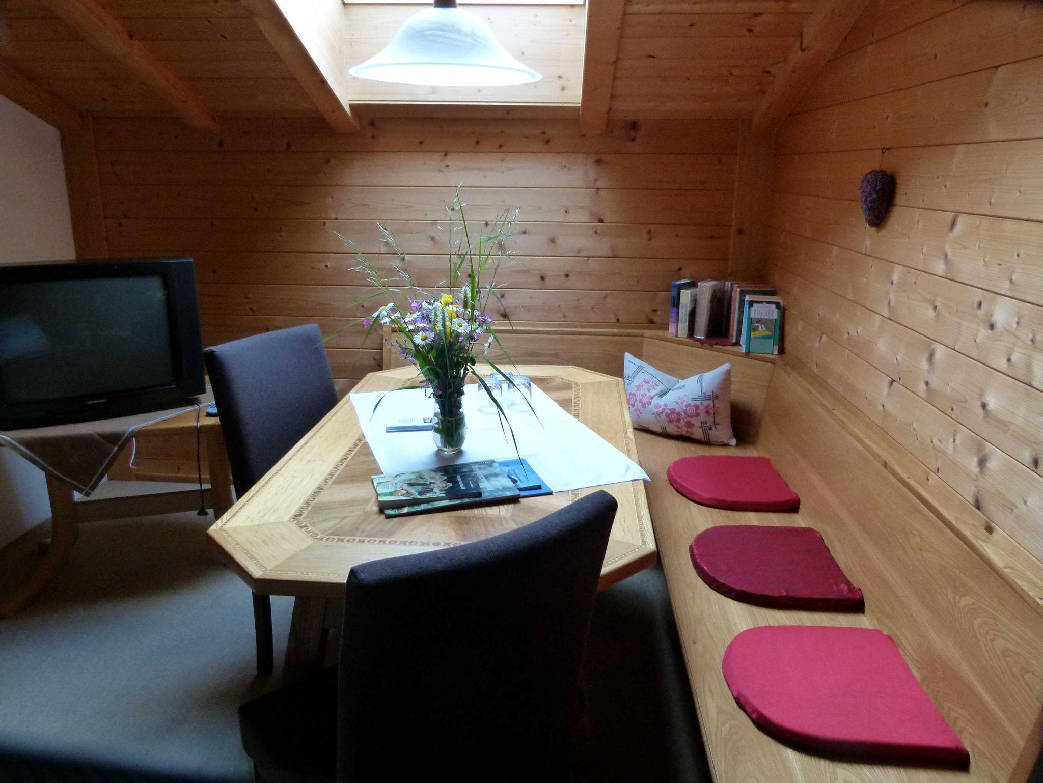 Balkon ist keiner beim Zimmer. Aber vor dem Haus neben den Dahlien- und Sonnenblumengarten können Sie auf der Sitzgruppe aus Holz oder auf der Rundbogenbank verweilen. Südseitig können Sie unter der Zirbe ausruhen und träumen.