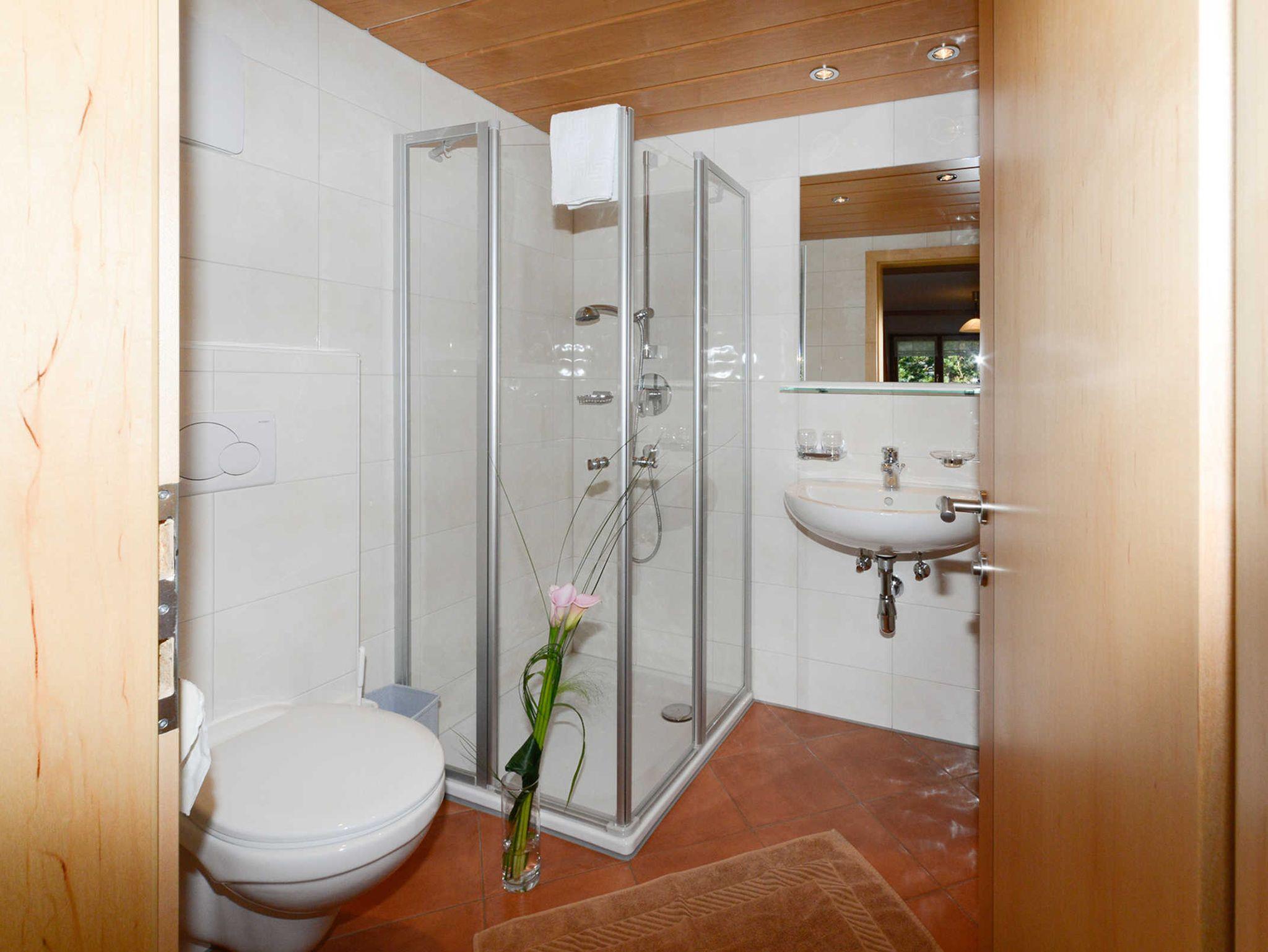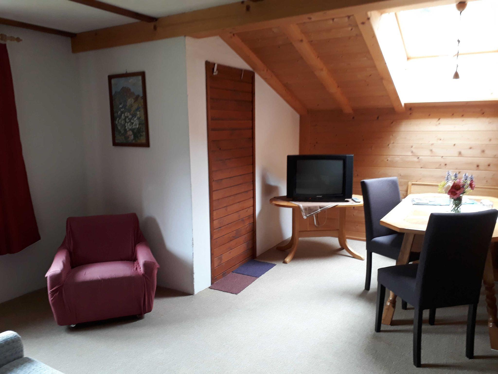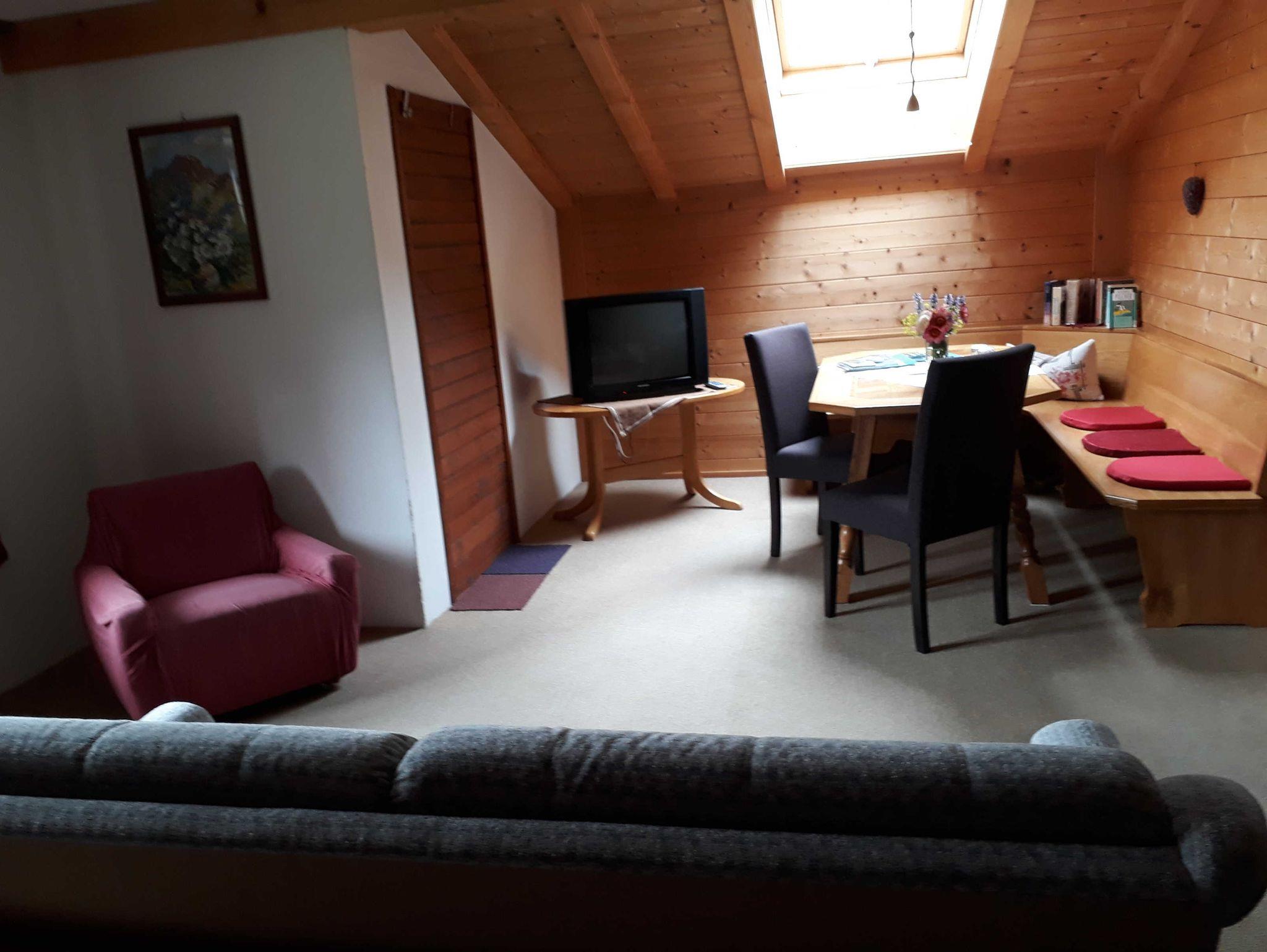 Balkon ist keiner beim Zimmer. Aber vor dem Haus neben den Dahlien- und Sonnenblumengarten können Sie auf der Sitzgruppe aus Holz oder auf der Rundbogenbank verweilen. Südseitig können Sie unter der Zirbe ausruhen und träumen.