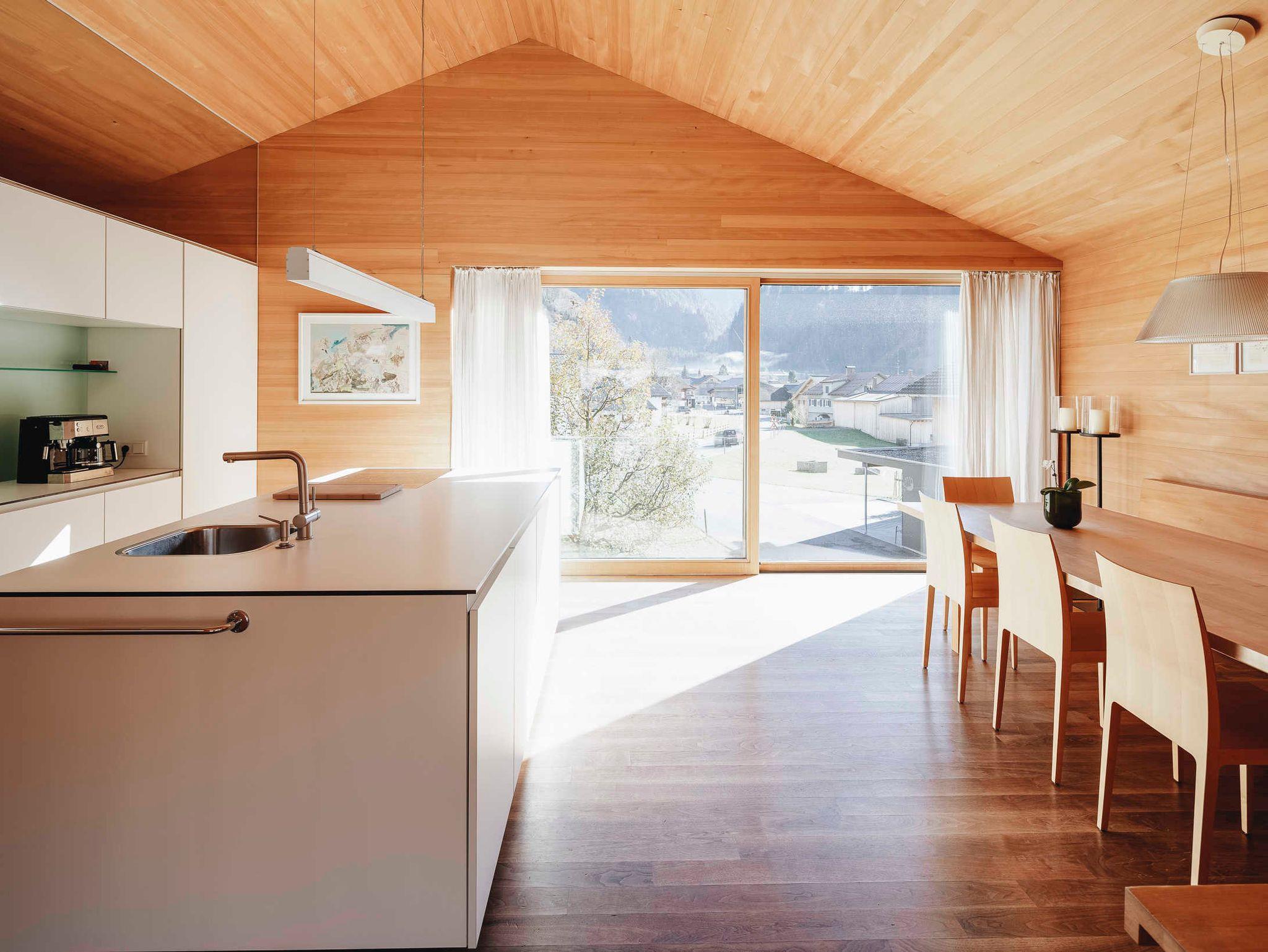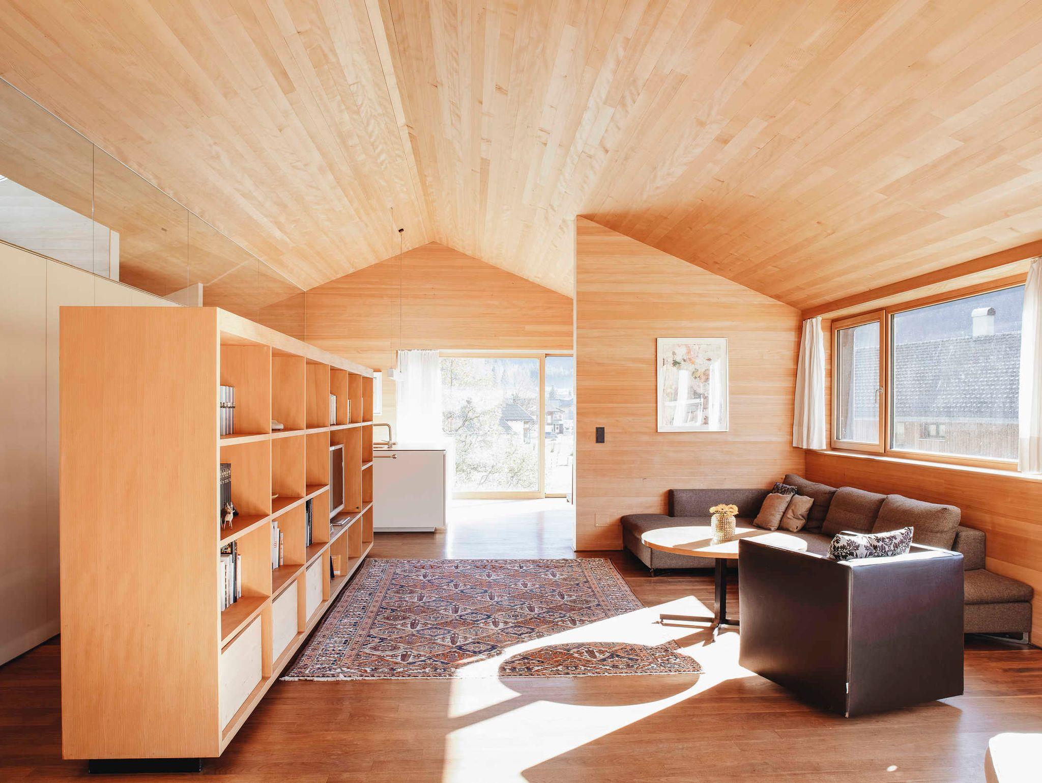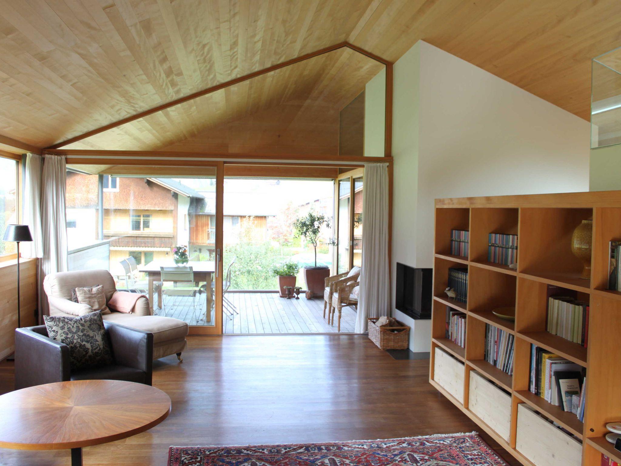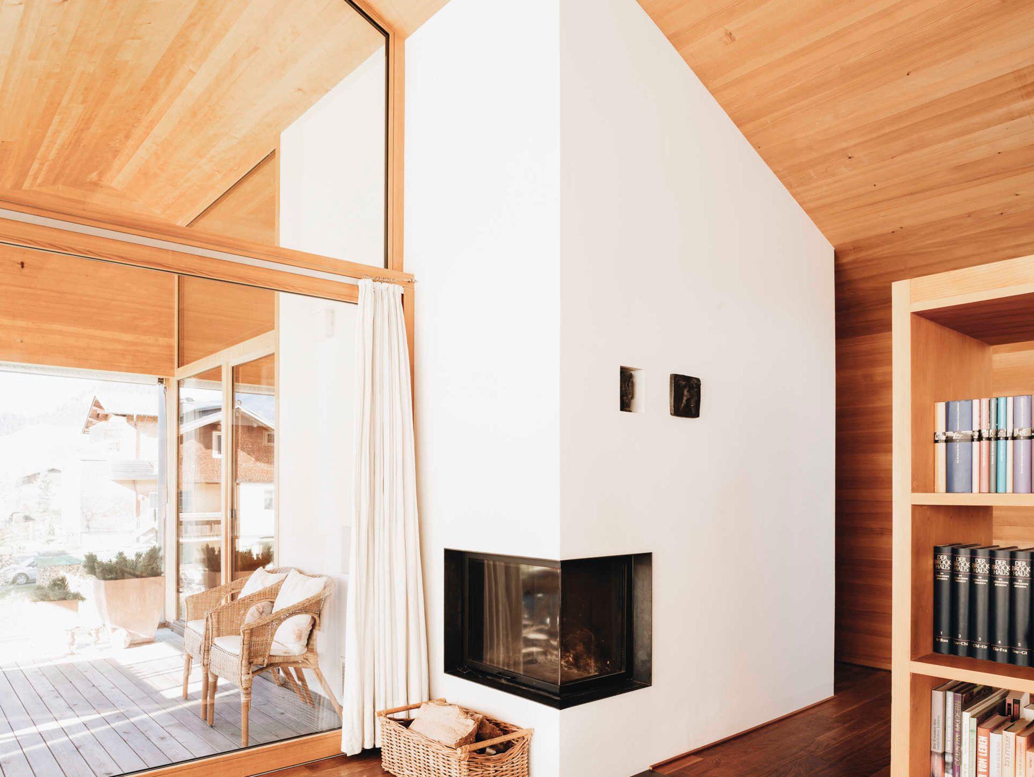 Das Haus-Innere lebt im ersten Obergeschoß von einem großzügigen offenen Wohnraum, der einen Küchenblock, einen Esstisch sowie komfortable Sofamöbel umfasst. Der holzverkleidete Raum öffnet sich bis zum Giebel und gibt nach drei Seiten den beeindruckenden Blick in die Landschaft frei. Im Wohnzimmer findet sich in einem freistehenden Holzbücherregal Annettes Hausbibliothek (Flachbildschirm integriert), die zum Schmökern und Genießen einlädt. Im gleichen Stock ist zudem ein WC, ein kleines Büro (WLAN) und eine charmante Leseecke für den Rückzug ins Private. Zusätzlich kann dabei jederzeit ein Feuer im offenen Kamin für Gemütlichkeit sorgen. Das Innere ist stilvoll eingerichtet, mit ausgewählten Möbeln und Kunstwerken, und einer Liebe fürs Detail. Für Koch-Fans ist die hochwertig ausgestattete Küche (mit Gaggenau-Dampfgarer und -Induktionsherd) ein Highlight. Die überdachte Terrasse im ersten Obergeschoß bietet genügend Platz für ein gemeinsames Essen.