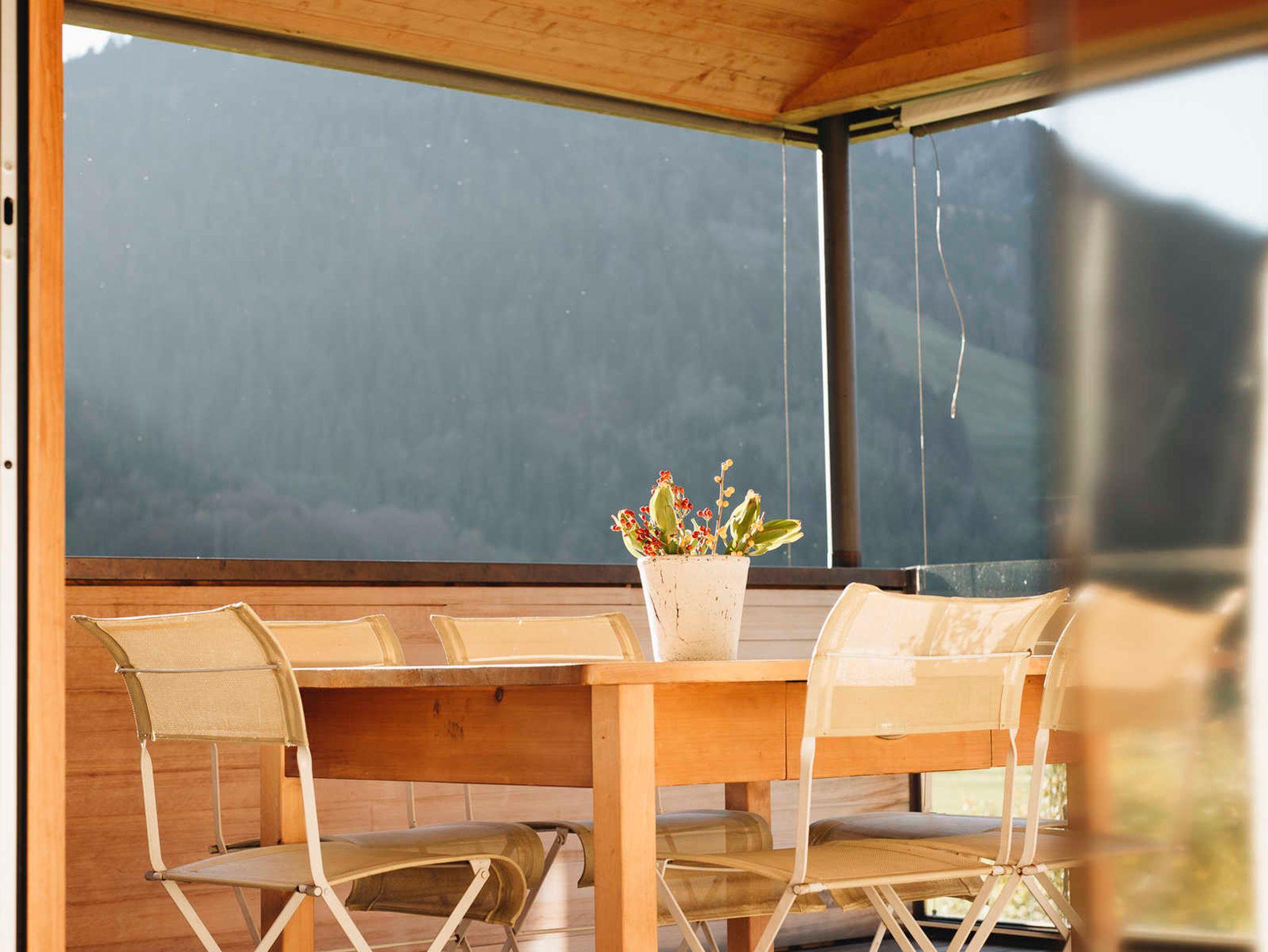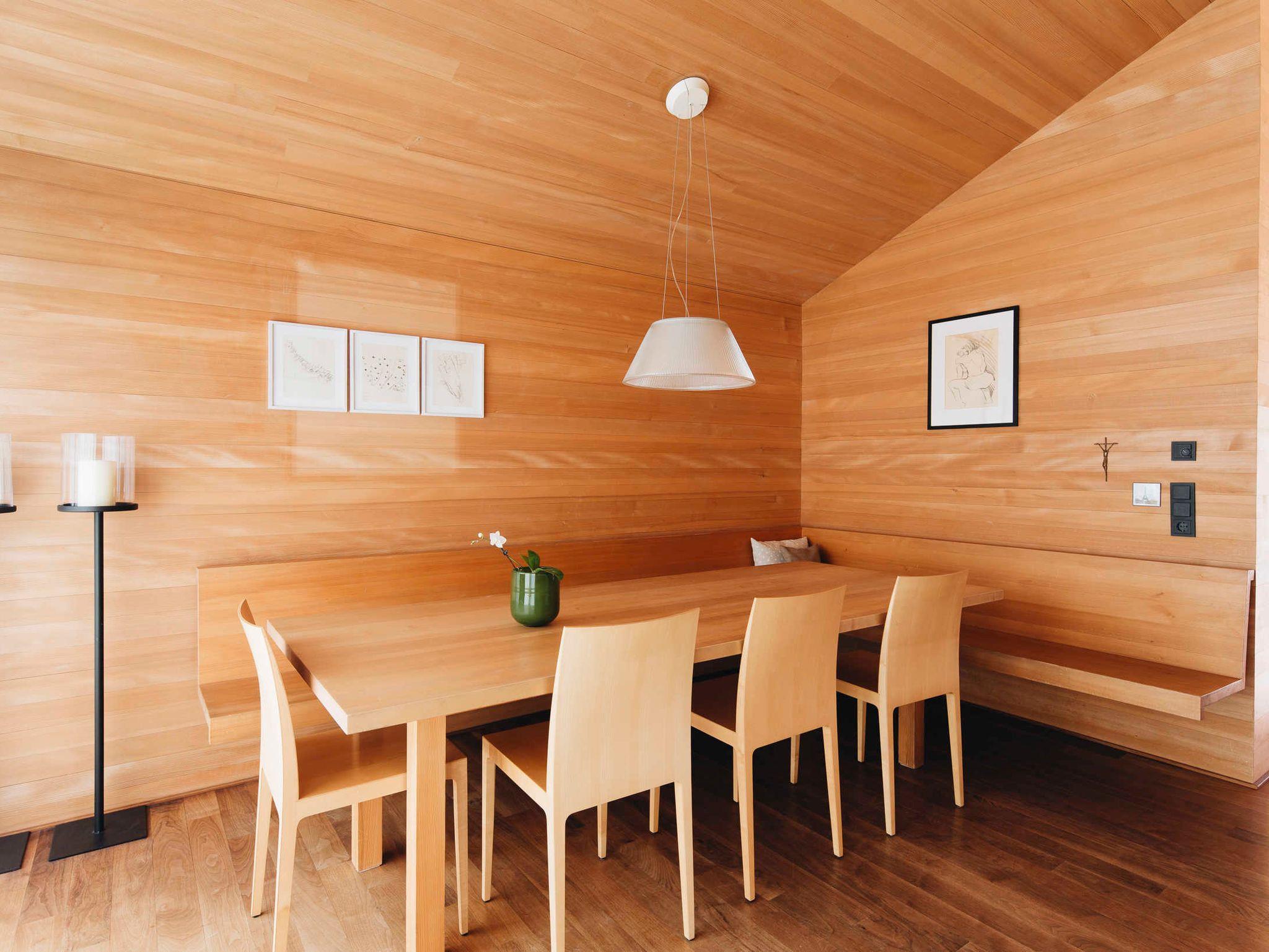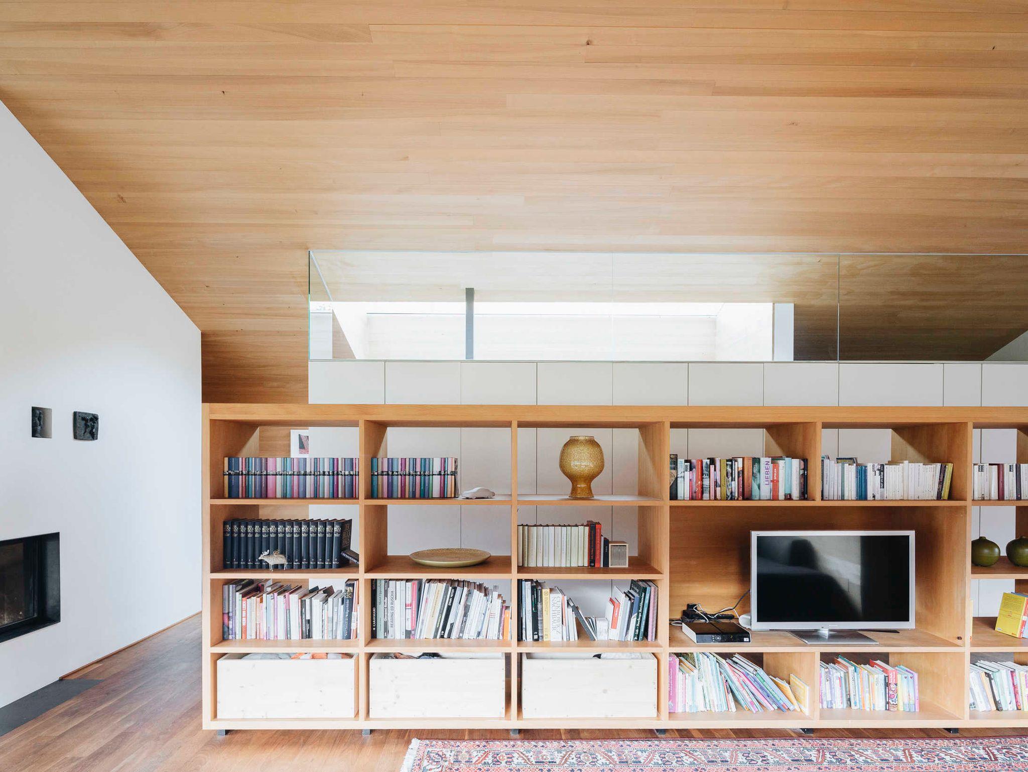 Das Haus-Innere lebt im ersten Obergeschoß von einem großzügigen offenen Wohnraum, der einen Küchenblock, einen Esstisch sowie komfortable Sofamöbel umfasst. Der holzverkleidete Raum öffnet sich bis zum Giebel und gibt nach drei Seiten den beeindruckenden Blick in die Landschaft frei. Im Wohnzimmer findet sich in einem freistehenden Holzbücherregal Annettes Hausbibliothek (Flachbildschirm integriert), die zum Schmökern und Genießen einlädt. Im gleichen Stock ist zudem ein WC, ein kleines Büro (WLAN) und eine charmante Leseecke für den Rückzug ins Private. Zusätzlich kann dabei jederzeit ein Feuer im offenen Kamin für Gemütlichkeit sorgen. Das Innere ist stilvoll eingerichtet, mit ausgewählten Möbeln und Kunstwerken, und einer Liebe fürs Detail. Für Koch-Fans ist die hochwertig ausgestattete Küche (mit Gaggenau-Dampfgarer und -Induktionsherd) ein Highlight. Die überdachte Terrasse im ersten Obergeschoß bietet genügend Platz für ein gemeinsames Essen.