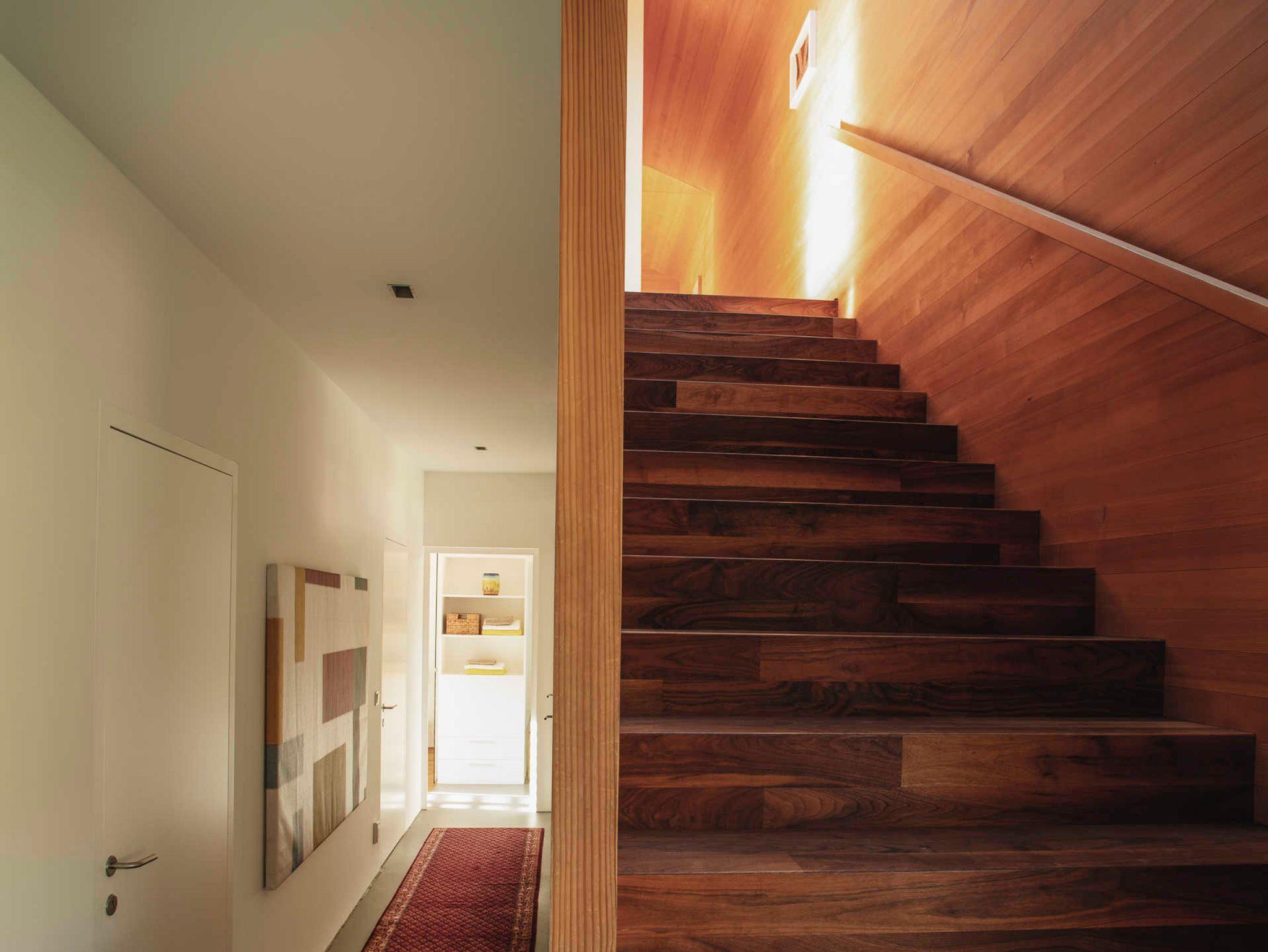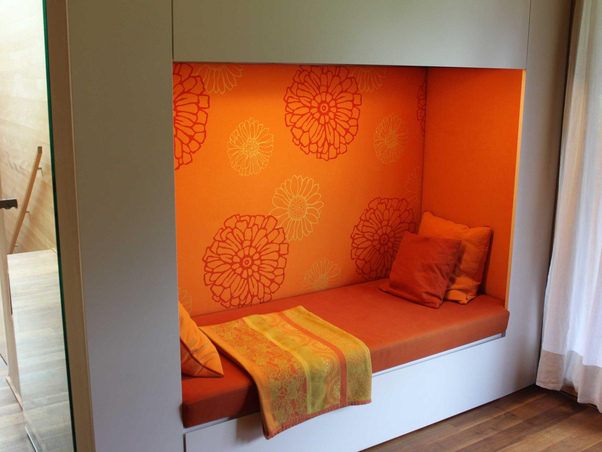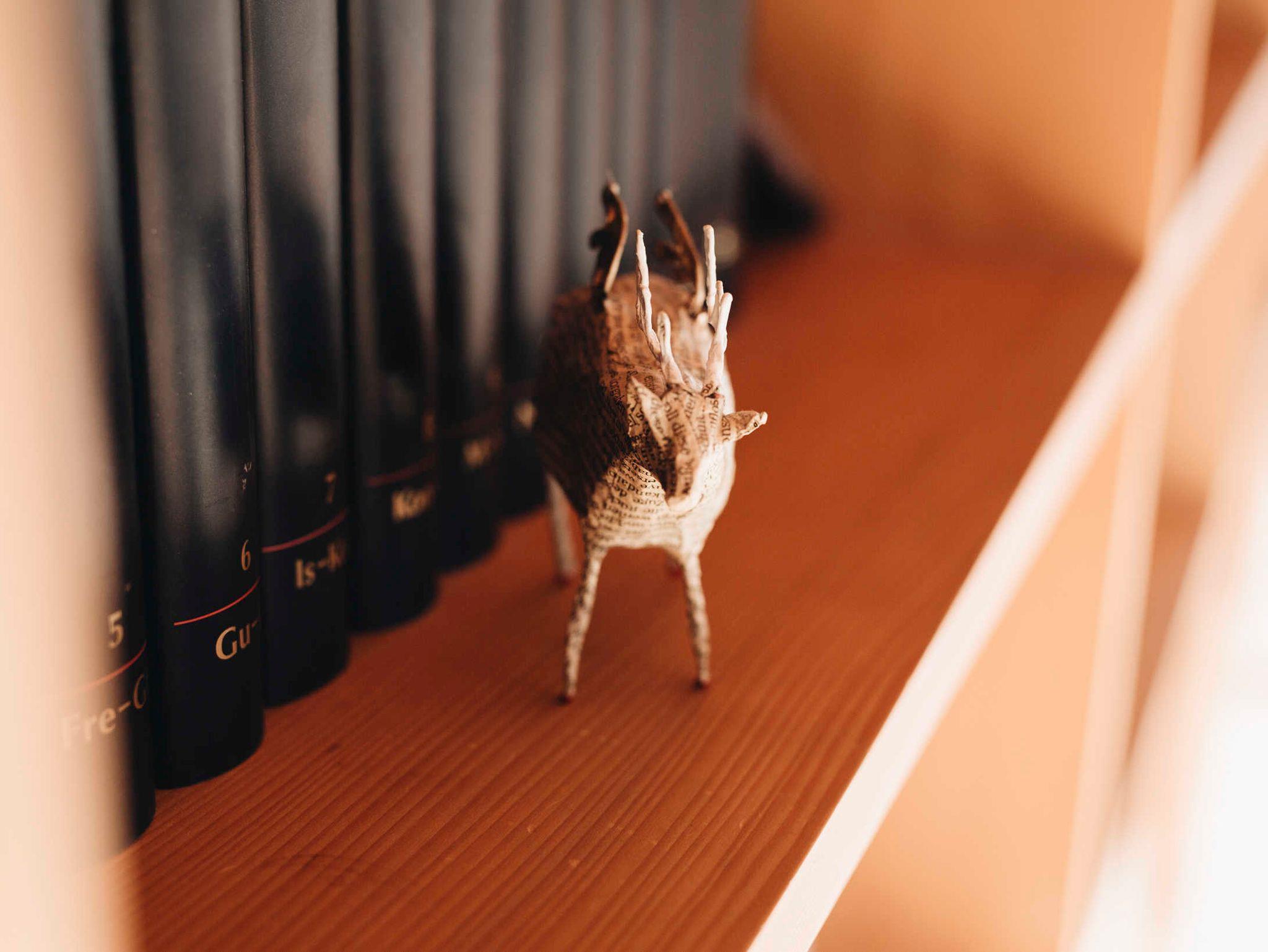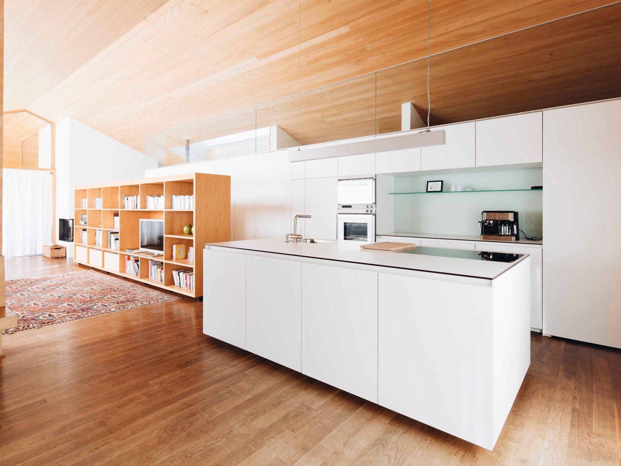 Das Haus-Innere lebt im ersten Obergeschoß von einem großzügigen offenen Wohnraum, der einen Küchenblock, einen Esstisch sowie komfortable Sofamöbel umfasst. Der holzverkleidete Raum öffnet sich bis zum Giebel und gibt nach drei Seiten den beeindruckenden Blick in die Landschaft frei. Im Wohnzimmer findet sich in einem freistehenden Holzbücherregal Annettes Hausbibliothek (Flachbildschirm integriert), die zum Schmökern und Genießen einlädt. Im gleichen Stock ist zudem ein WC, ein kleines Büro (WLAN) und eine charmante Leseecke für den Rückzug ins Private. Zusätzlich kann dabei jederzeit ein Feuer im offenen Kamin für Gemütlichkeit sorgen. Das Innere ist stilvoll eingerichtet, mit ausgewählten Möbeln und Kunstwerken, und einer Liebe fürs Detail. Für Koch-Fans ist die hochwertig ausgestattete Küche (mit Gaggenau-Dampfgarer und -Induktionsherd) ein Highlight. Die überdachte Terrasse im ersten Obergeschoß bietet genügend Platz für ein gemeinsames Essen.