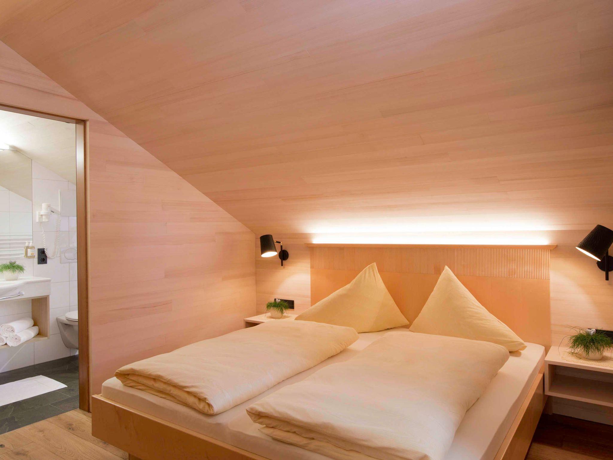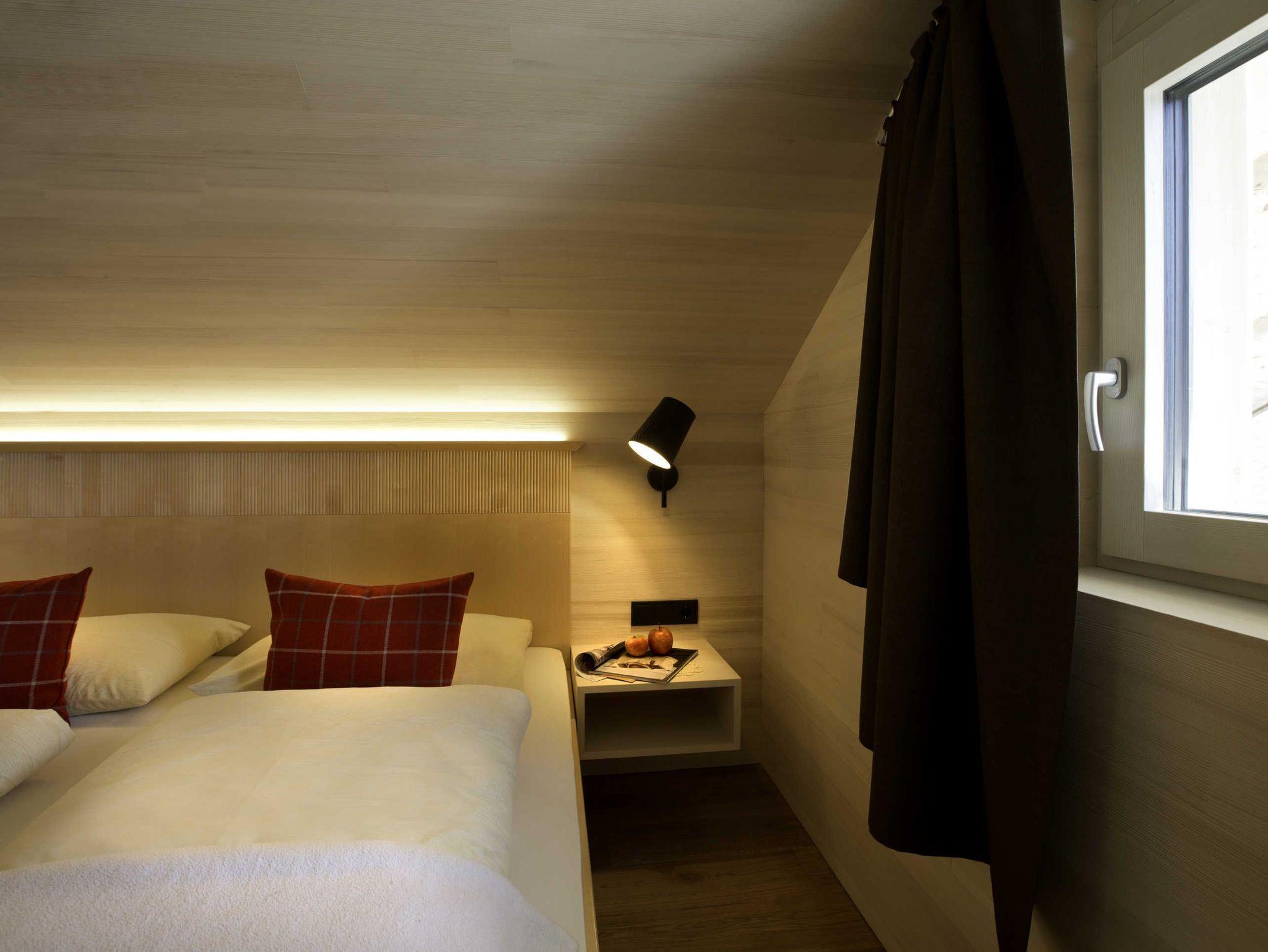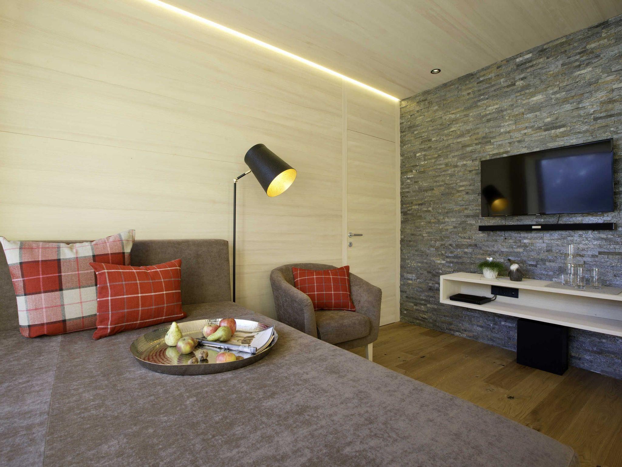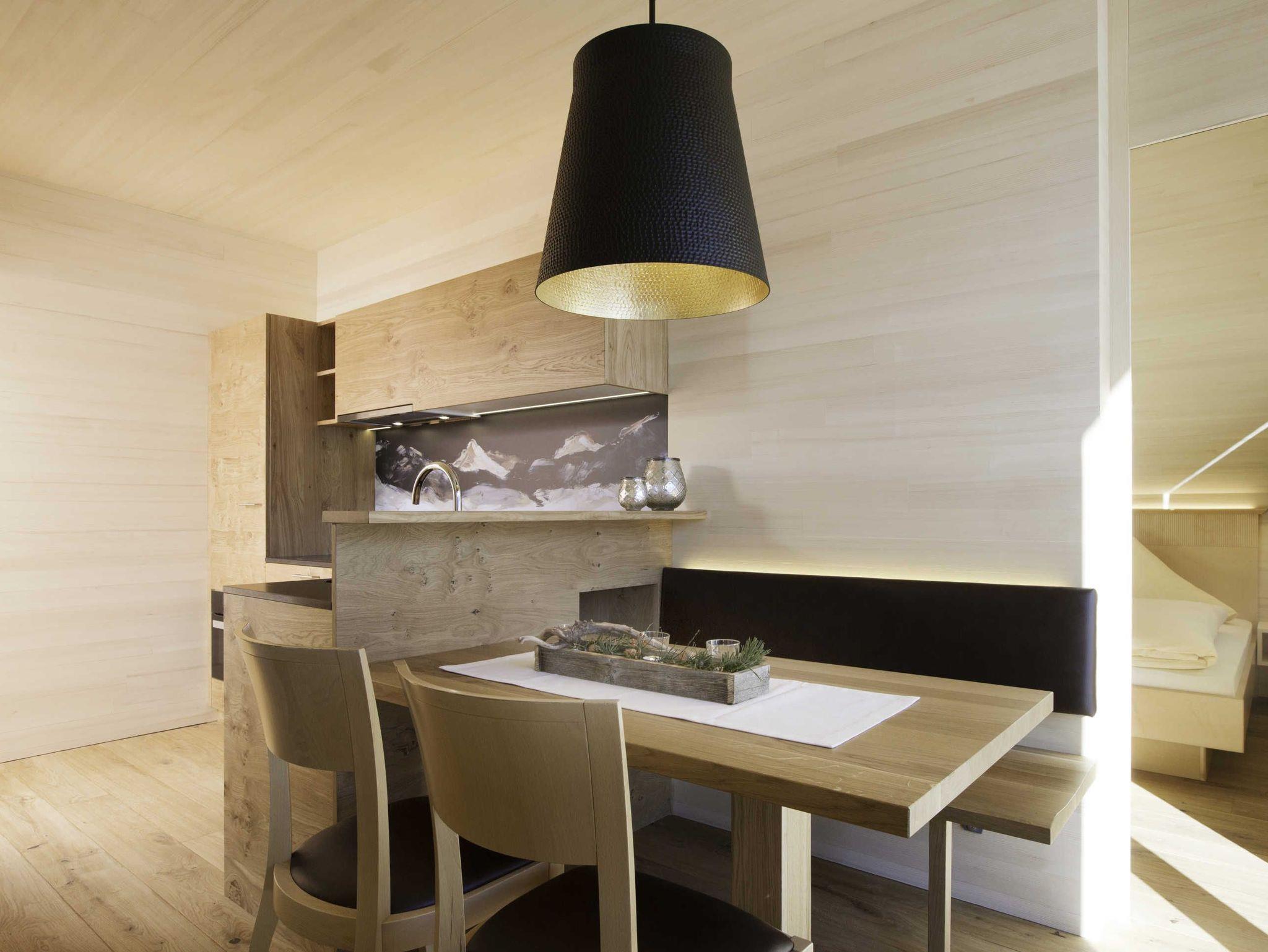 Alle Apartments sind mit hochwertigen Holzböden (Eiche Parkett), Wandvertäfelungen aus heimischer Weißtanne, Decken aus heimischer Weißtanne und Lehmputz ausgestattet.