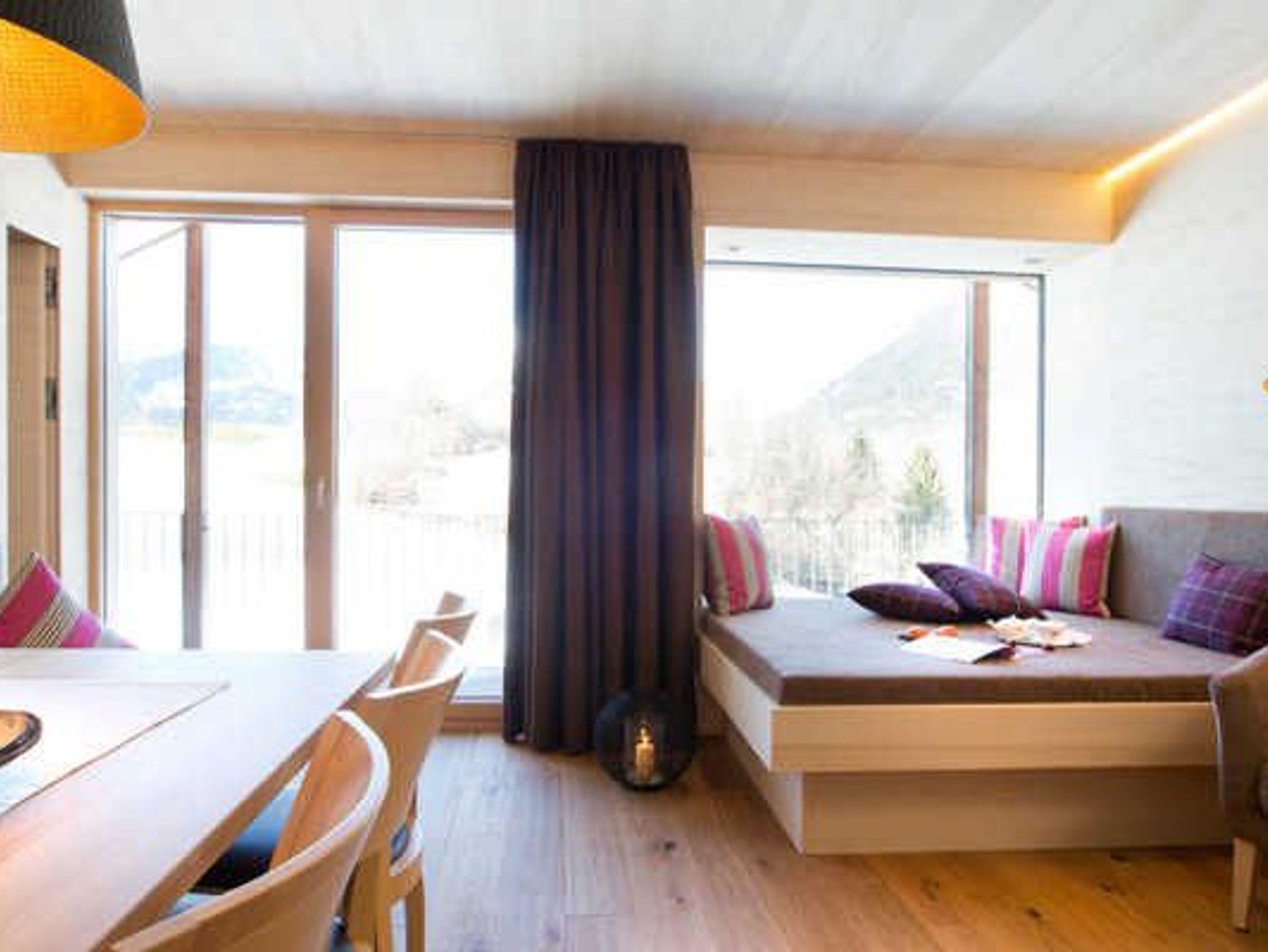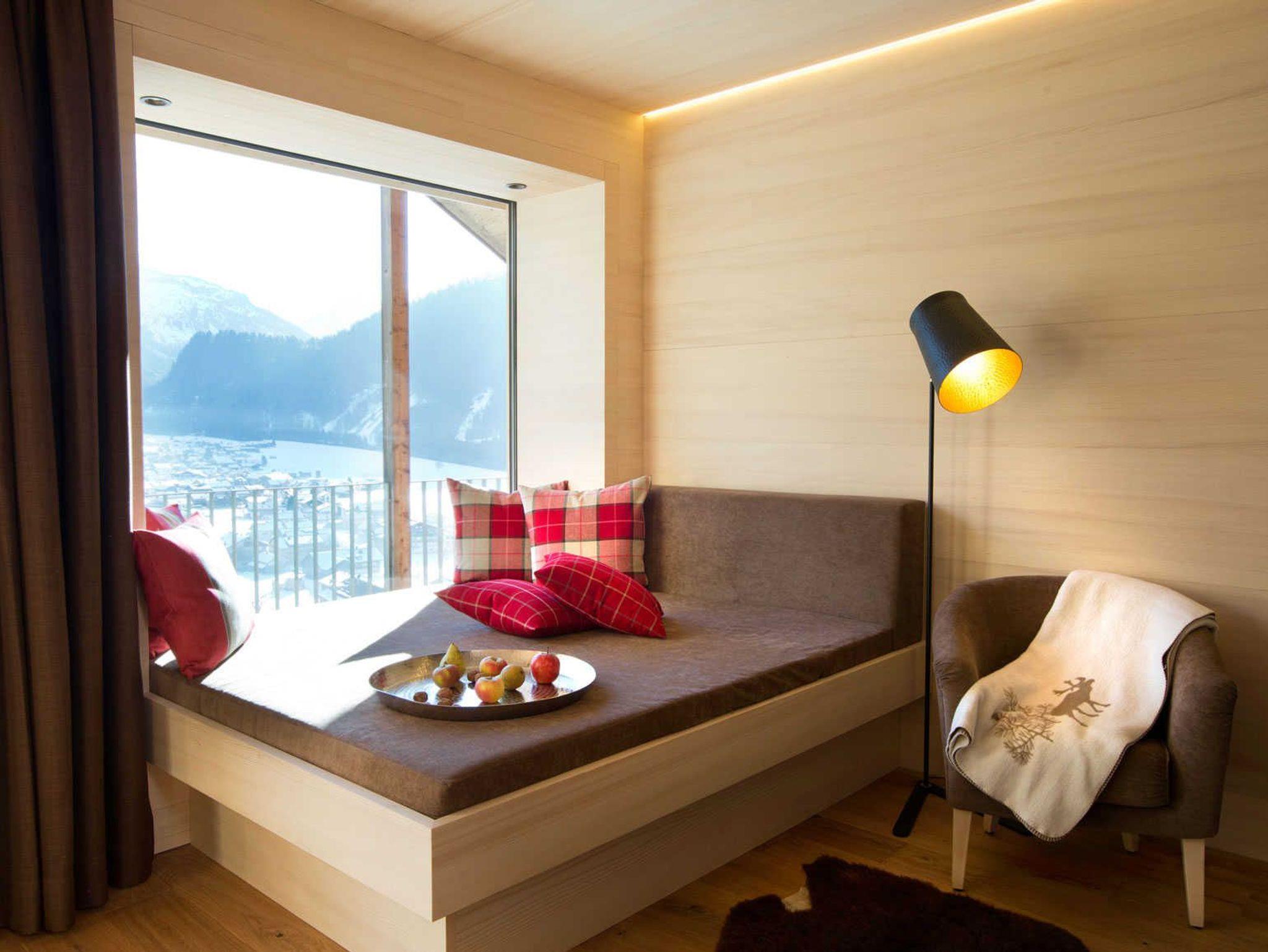 Ein Apartment mit herrlicher Aussicht! 190 x 190 cm große Panoramacouch mit Traumblick auf Schoppernau. Rustikaler Eichenholzboden (ideal für Allergiker) ? Decken und Wände aus heimischer Weißtanne!