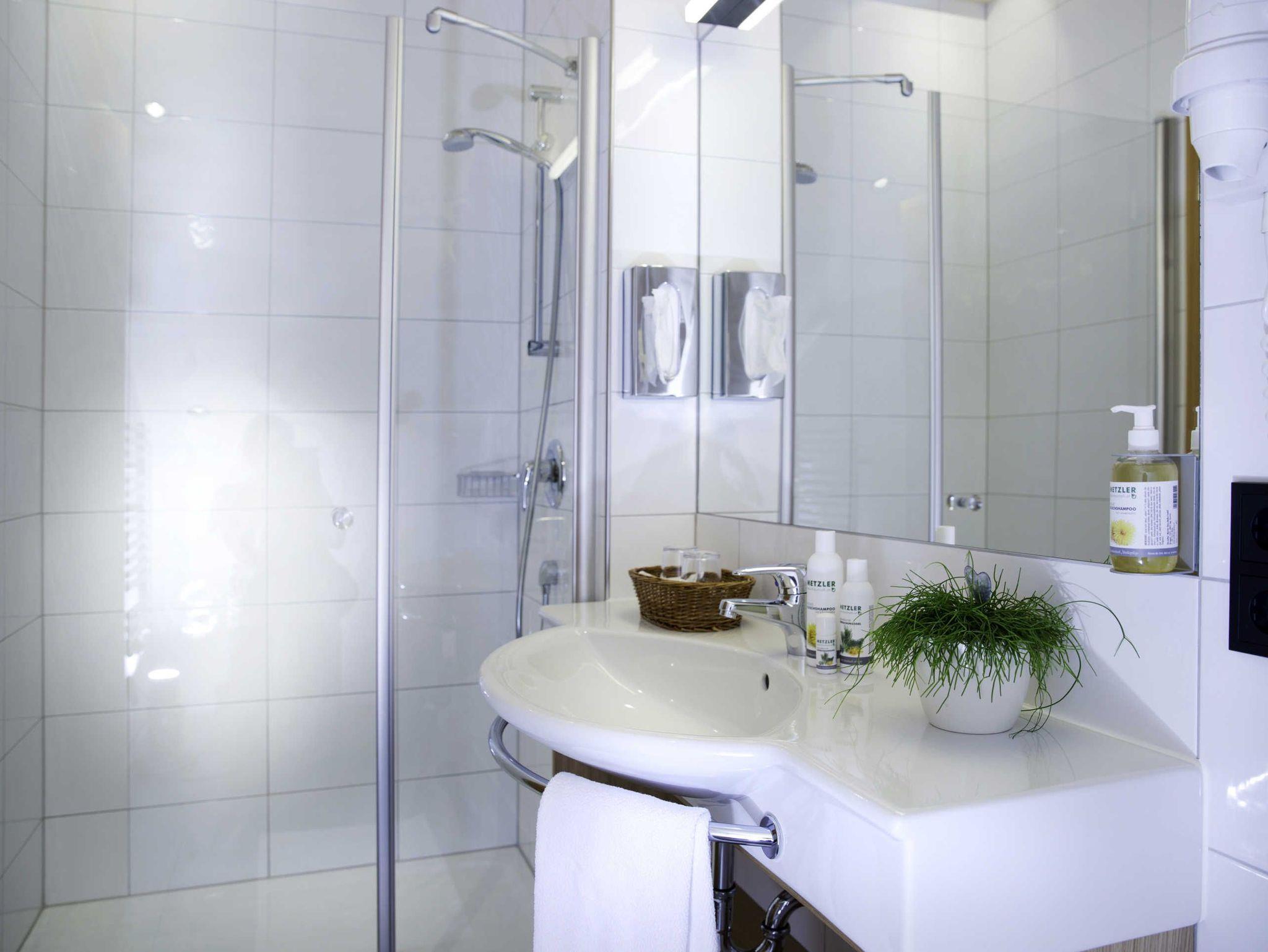 • Die Badezimmer sind ausgestattet mit großen Waschtischen, Dusche, WC, Schminkspiegel, Fön …