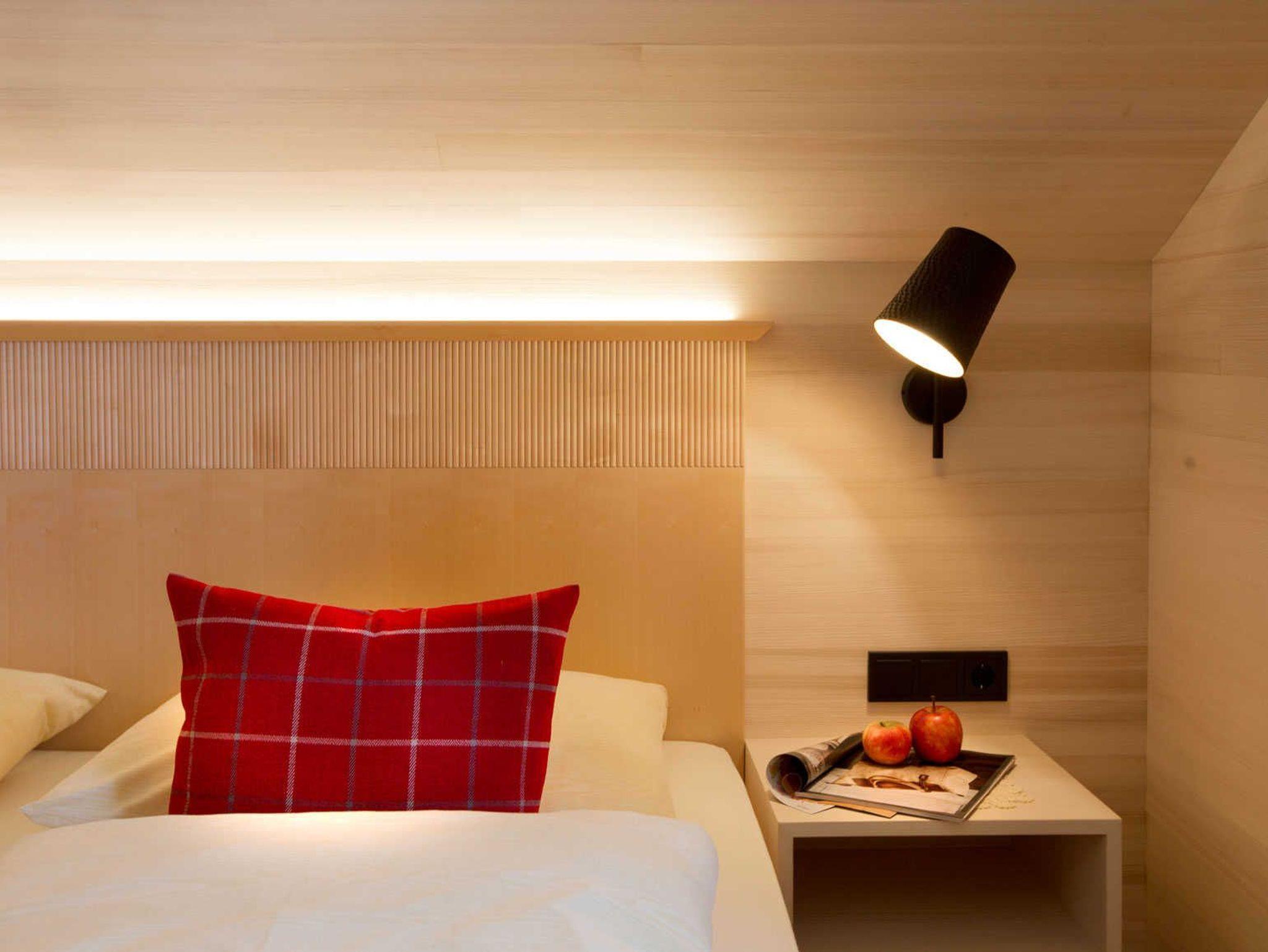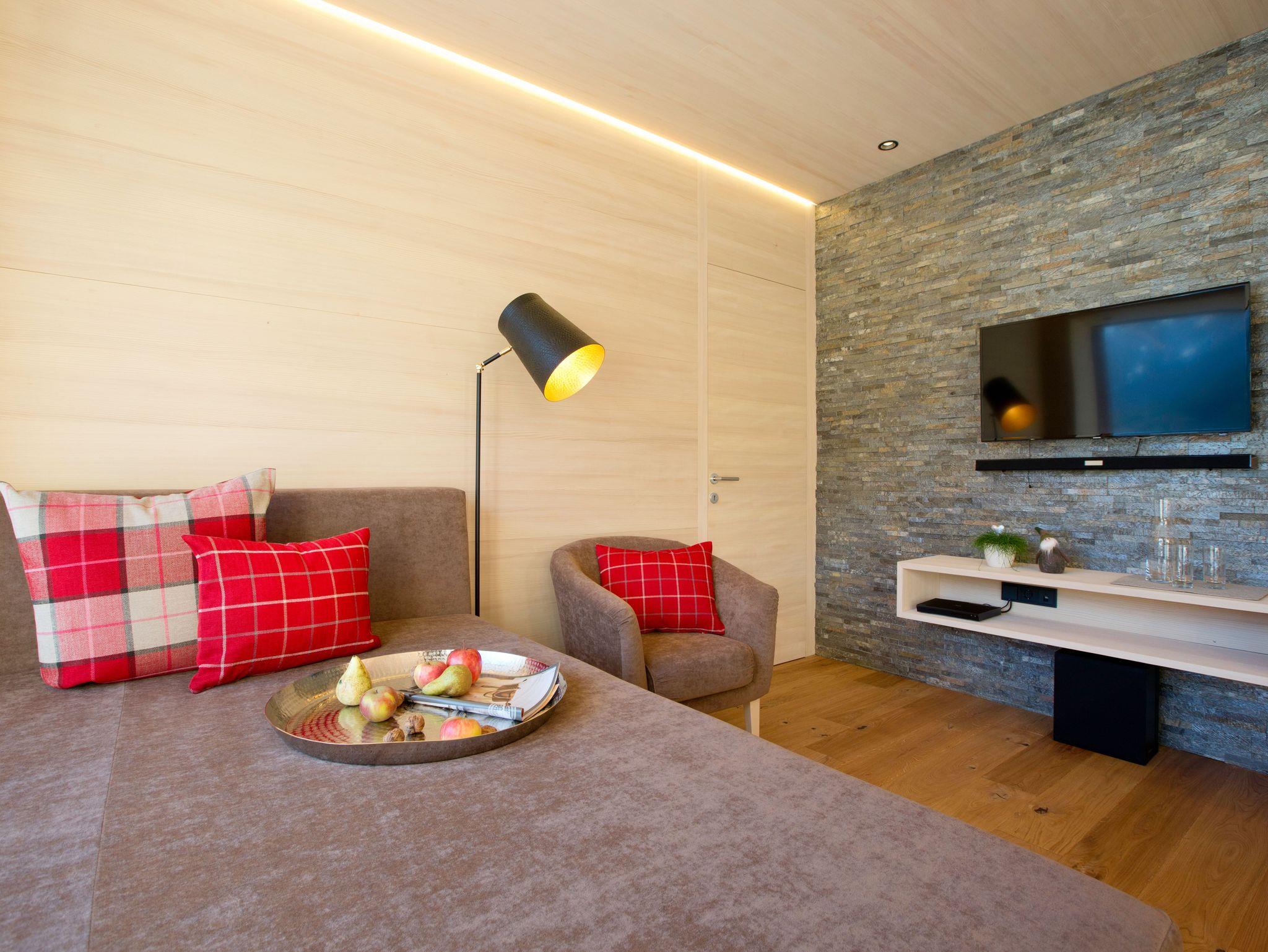 Alle Apartments sind mit hochwertigen Holzböden (Eiche Parkett), Wandvertäfelungen aus heimischer Weißtanne, Decken aus heimischer Weißtanne und Lehmputz ausgestattet.