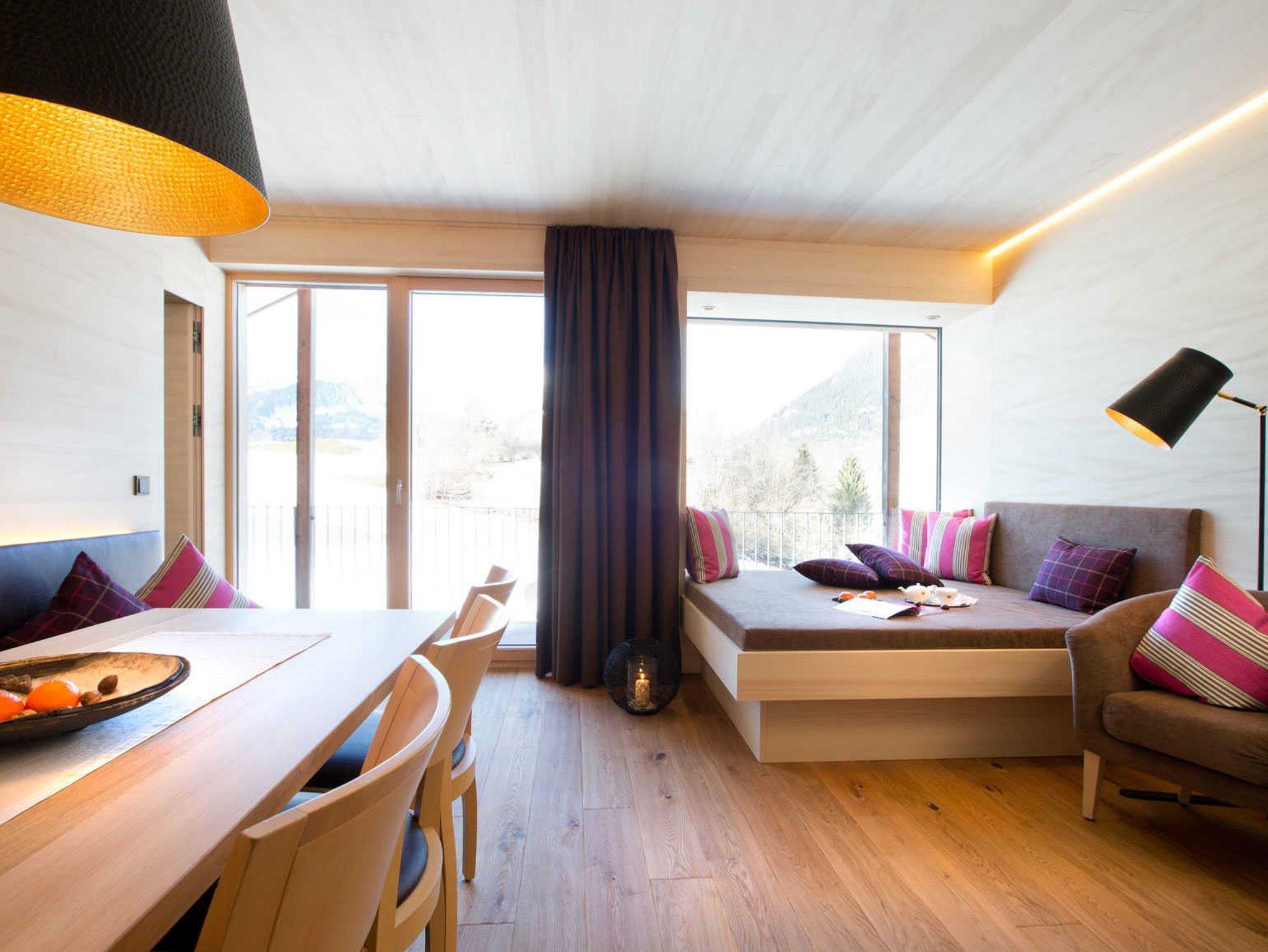 • Die großen Panoramafenster mit Wohlfühlcouch 190 x 190 cm (in Apartment 2, 3, 4, 5, 7, 8) ermöglichen einen unvergleichlichen Ausblick …