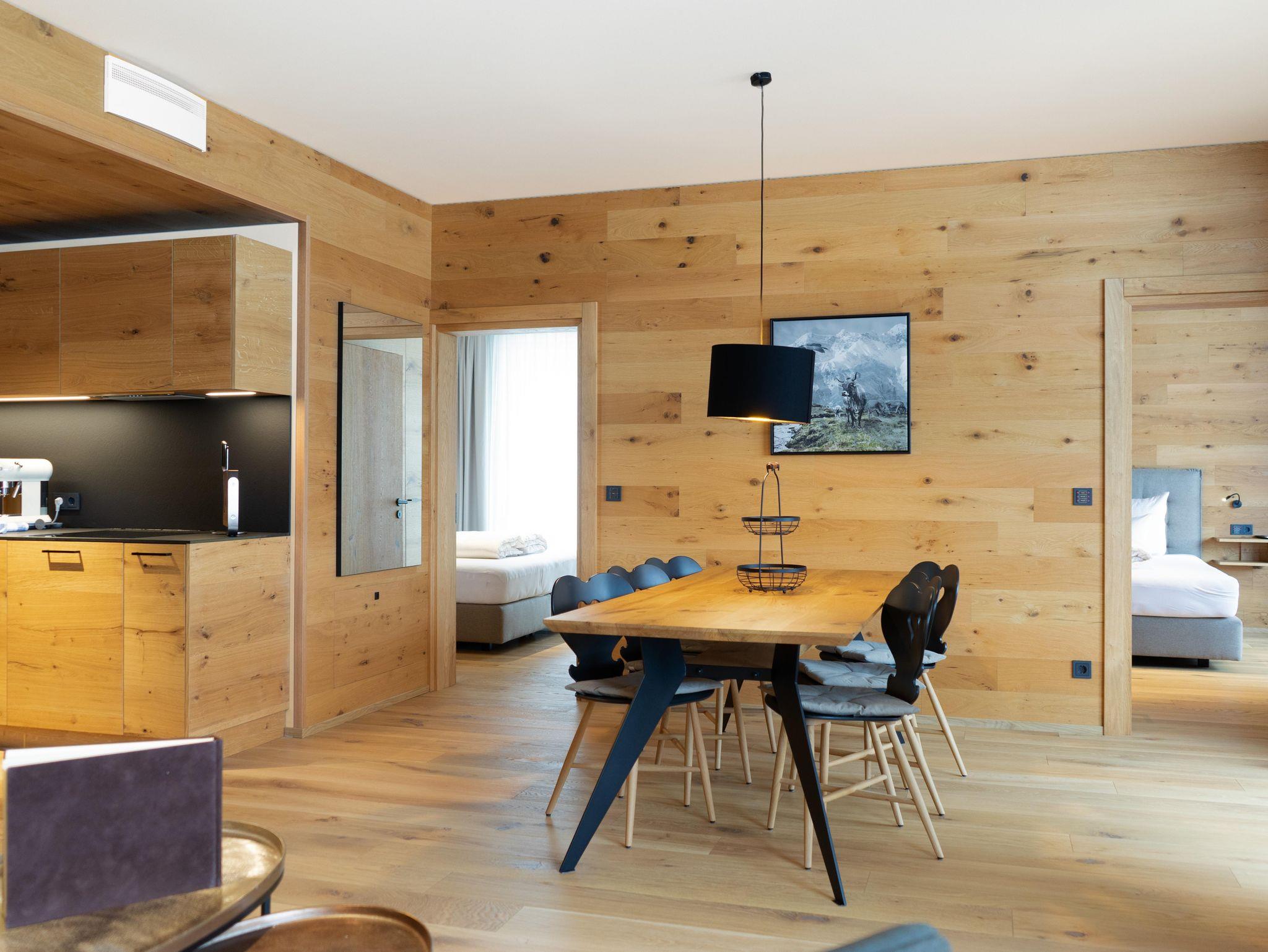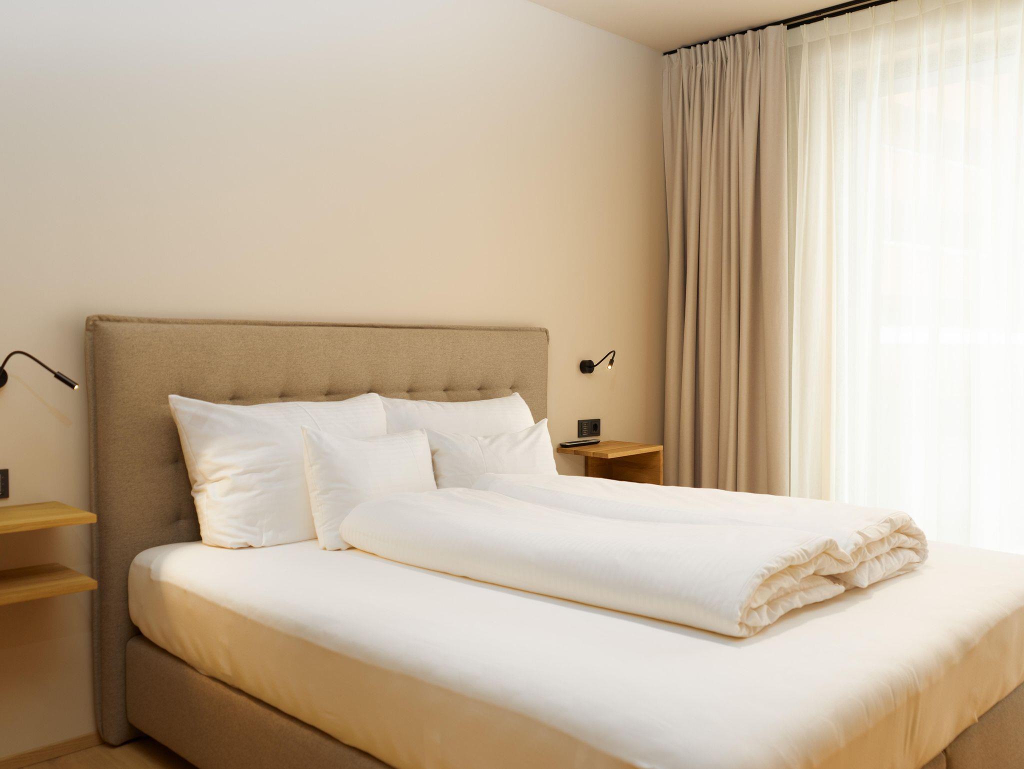 Auf großzügigen bis zu 85 m 2 Wohnfläche verfügen die Apartments über 2 Schlafzimmer, kostenloses WLAN, min. einen Smart-TV und einen Schranktresor. Die Küche ist mit Backofen, Induktions-Kochfeld, Geschirr, Koch-Utensilien, Kaffeemaschine, Wasserkocher und Toaster voll ausgestattet. Die Suites haben Zugang zu min. einem Balkon/einer Terrasse. Das Badezimmer ist mit einer Regendusche ausgestattet. Eine Gästetoilette ist in in einem separaten Raum untergebracht. Ihr Auto stellen sie sicher in der dazugehörigen Tiefgarage ab, wo auch Ladestationen für E-Autos zur Verfügung stehen. Im Resort befindet sich ein Lift, sowie eine Waschküche mit Waschmaschine und Trockner. Kulinarisch umsorgt werden unsere Gäste mit unserem Frühstücksangebot, Brötchen- und Kühlschrankservice, sowie über den Automatenshop, der regelmäßig mit frischen Speisen unseres Haubenkochs A. Shala befüllt wird.