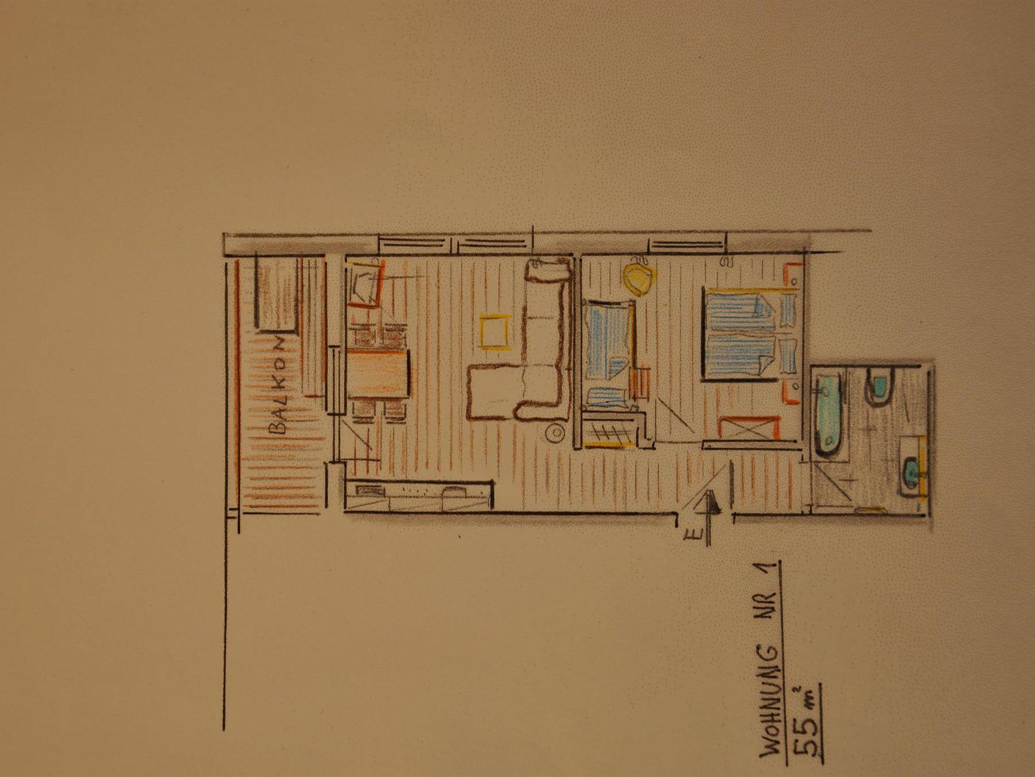 Das Appartement 2 in schlichtem Design und gemütlichen Ambiente hat 70 m² und ist für 4 -6 Personen, es verfügt über einen großen Wohn - und Essraum mit Küche, zwei getrennten Schlafzimmern, Bad und Balkon. Die großzügigen hellen Räume bestehen aus unbehandelten natürlichen Massivholz und schaffen ein gemütliches, gesundes wohnen.