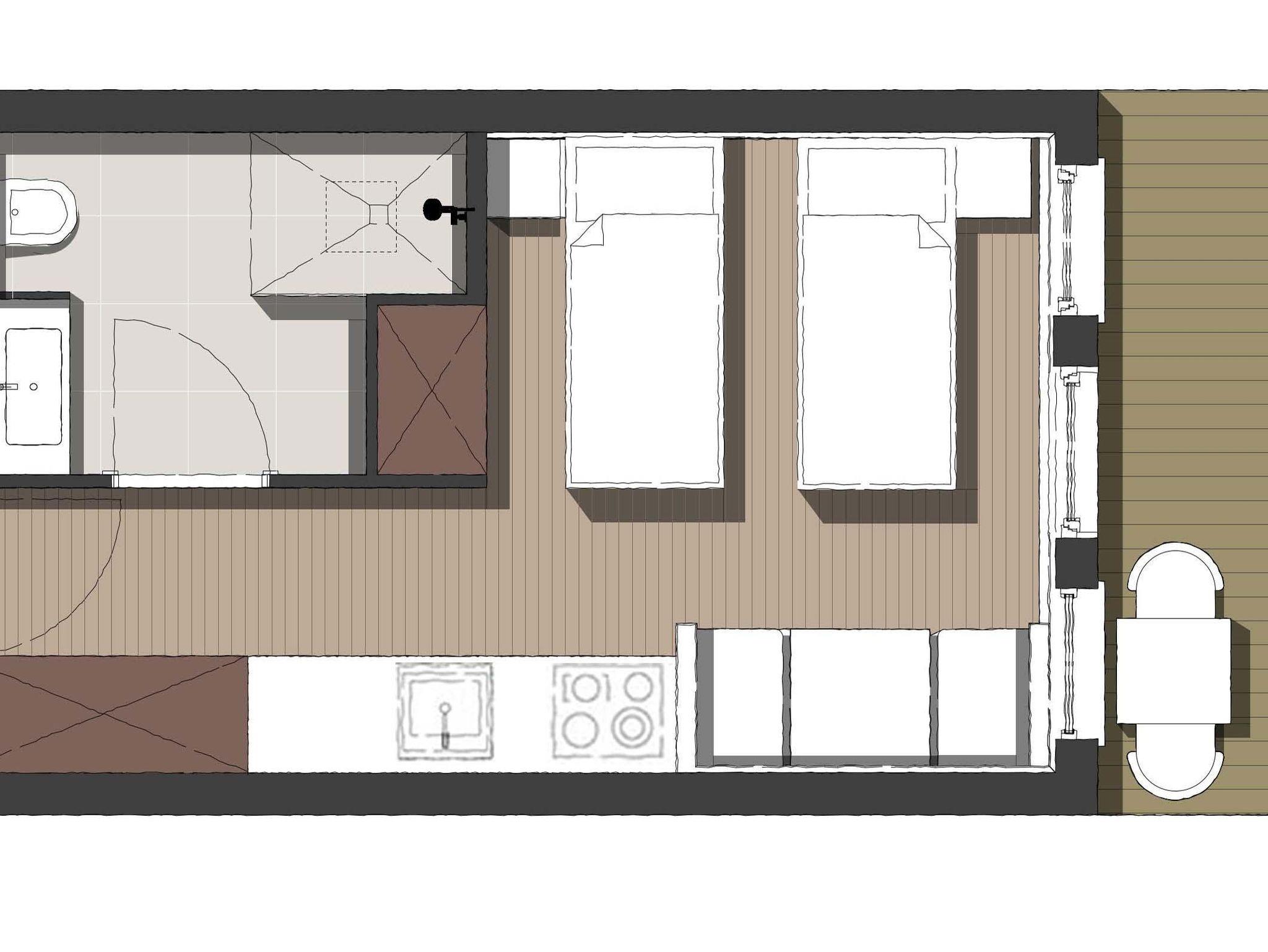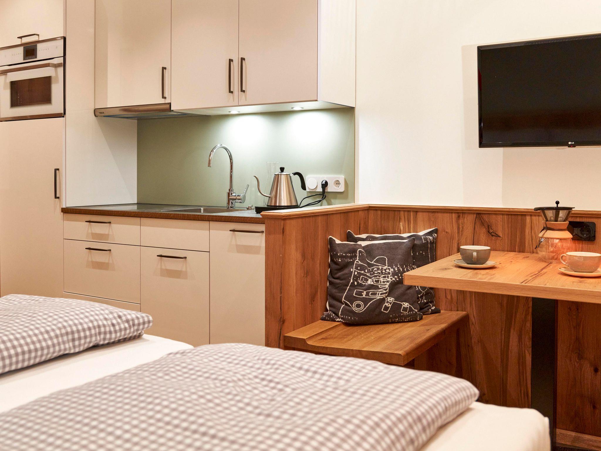 25m² stylisches Studio mit Terrasse; teilbare Boxspringbetten (2 x 90x200cm) dienen tagsüber als Sofa mit Kuscheldecken; top ausgestatte Küchenzeile: mit zwei Cerankochfeldern, Geschirrspülmaschine, Kombi-Dämpfer; sollte trotzdem was fehlen für die Zubereitung eines tollen Menüs: an der Rezeption gibt es fast alles zum Ausleihen! Esstisch mit zwei Sitzbänken; Flachbildschirm-TV und Safe; dazu separates, geräumiges Bad mit Dusche/WC inkl Fön und Duschseife;