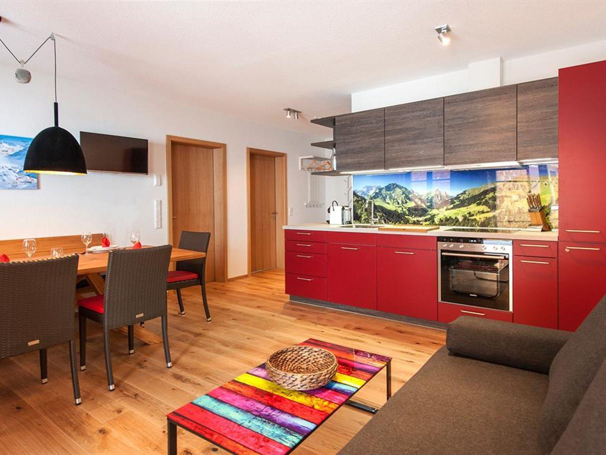 Ein Panoramabild als Hintergrund der Küchenzeile lässt sie die Schönheit des Ortes und seiner Bergwelt auch beim Kochen genießen.