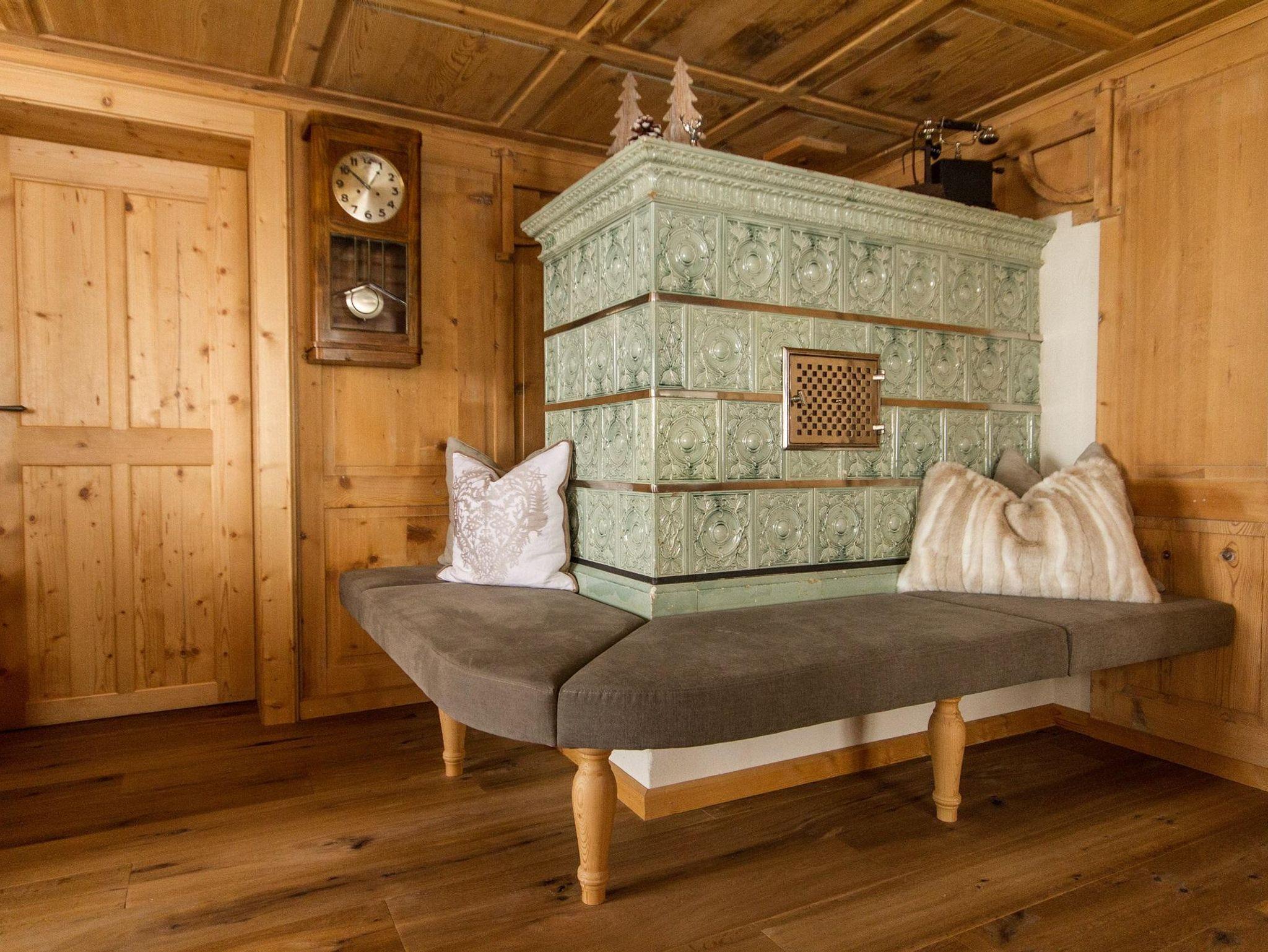 originale Walser Altholzstube mit schönem Ess- und Wohnzimmerbereich mit perfekt ausgestatteter Küche, Eckbank, Sofa, Kachelofen mit traditionellem Ofenbänkle (keine Schalfsofas!)
