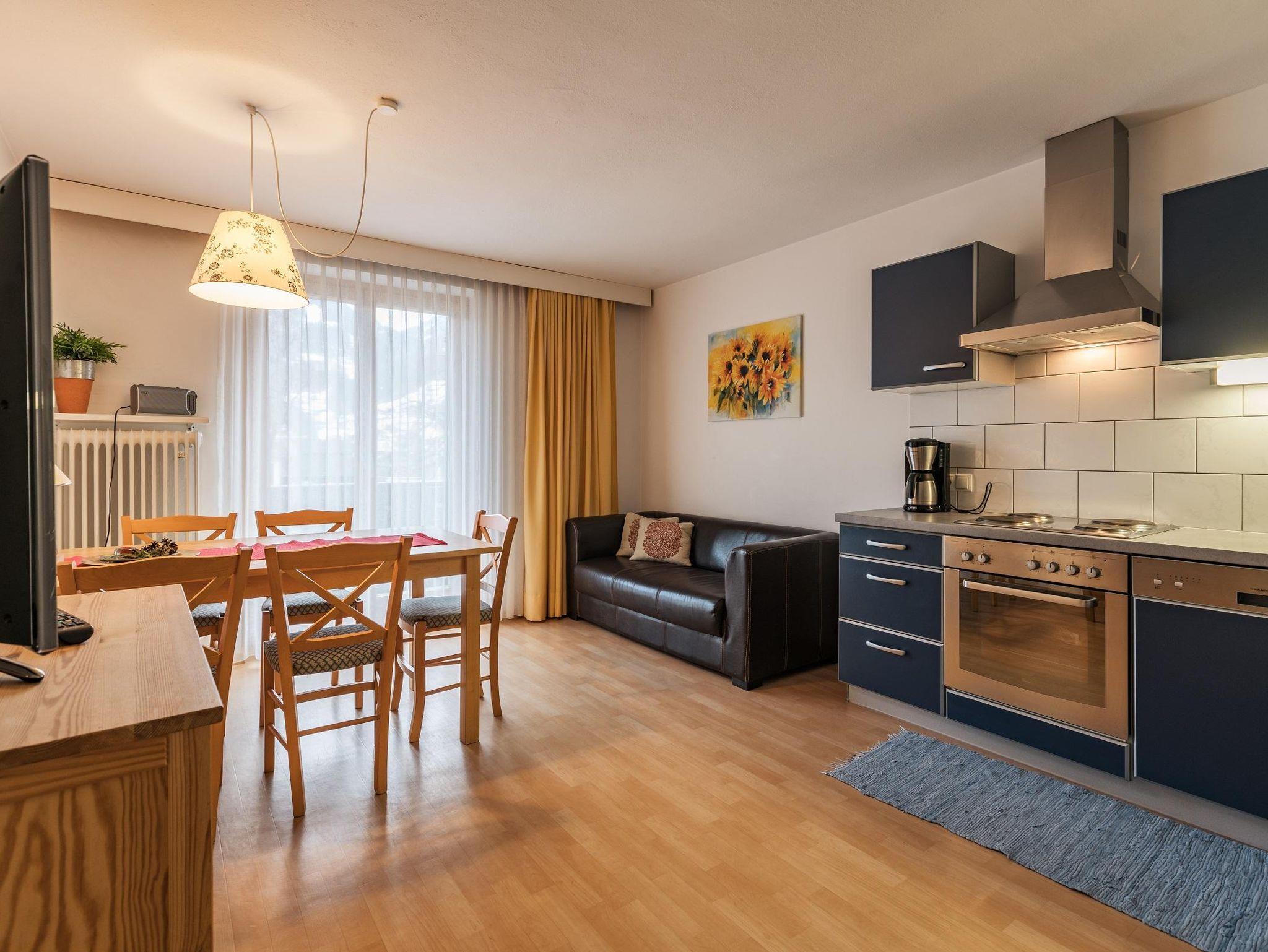 Das Appartement Maximilian“, 64 m² für 4-5 Personen ist neu renoviert, Wohnraum mit abgesetzter Küche (Geschirrspüler, Backrohr, Mikrowelle, ), und gemütlichem Esstisch sowie Kombi-Sofa, 2 Schlafzimmer, jedes mit eigener DU/WC, Süd-Balkon, Kabel-TV, Radio und gratis Wlan.