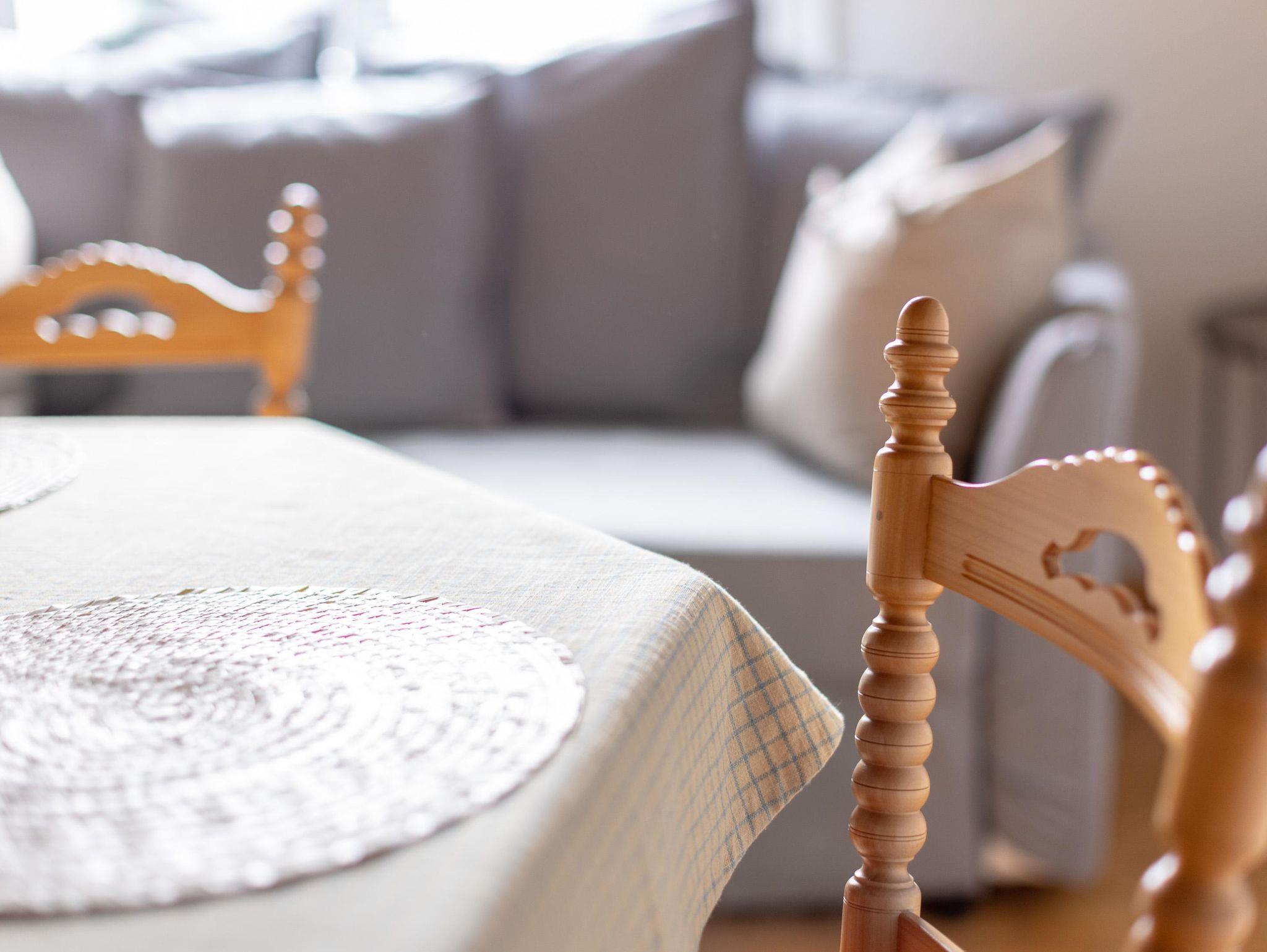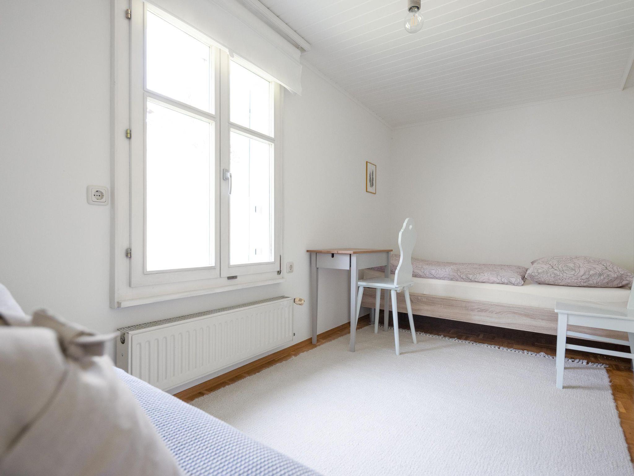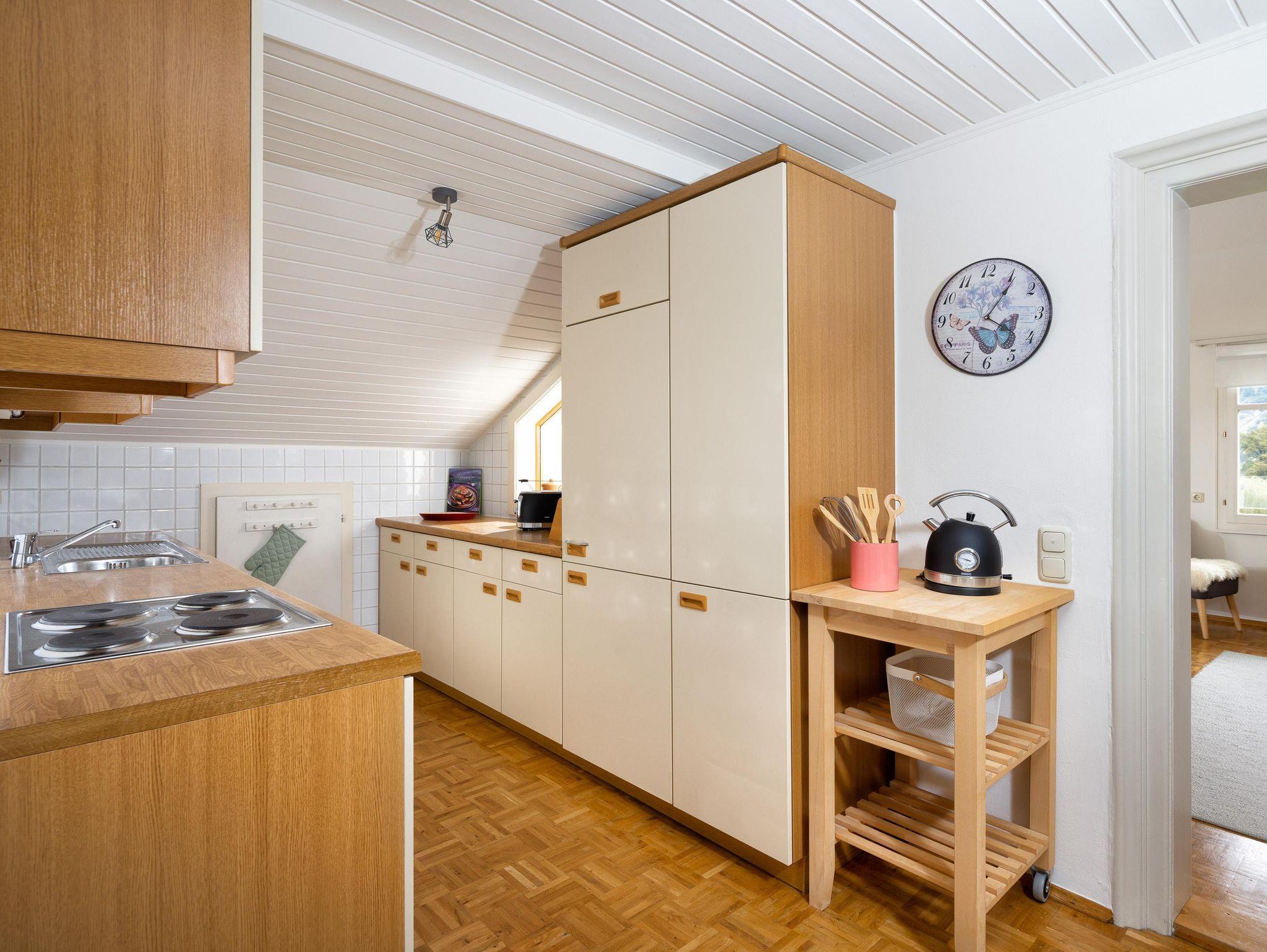 Ferienwohnung in 1. OG mit 117 m² Wohnfläche plus 30 m² Terrasse. 2 Doppelbetten plus 1 Schlafsofa. Küche mit Ceranherd, Backrohr, Kühlschrank, Kapsel-Kaffeemaschine, Kaffeekocher für gem. Kaffee, Wasserkocher, Toaster, Geschirr, Gläser usw. komplett ausgestattet. Geräumiges Bad mit Dusch-Badewanne, Waschtisch, Föhn, Waschtrockner und WC. Zusätzlich separates WC.