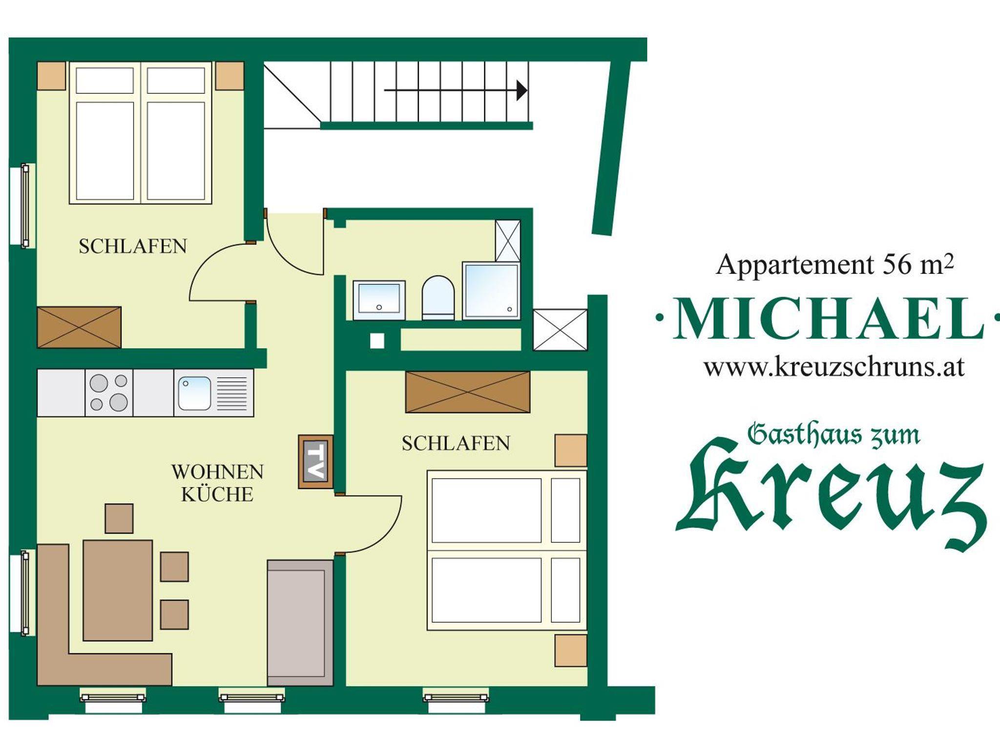 Appartement Michael mit 56 m² ist traditionell und gemütlich eingerichtet für 4-5 Personen, Wohnraum mit Küchenzeile( Backrohr,Mikrowelle,Geschirrspüler),Sitzecke, Kabel-TV,Radio, 2 Schlafzimmer mit Doppelbett, DU/WC. Zentral gelegen,Dorfmitte in der Fußgängerzone, 3 Gehmin. zum Lift, unmittelbar alles zum Einkauf.