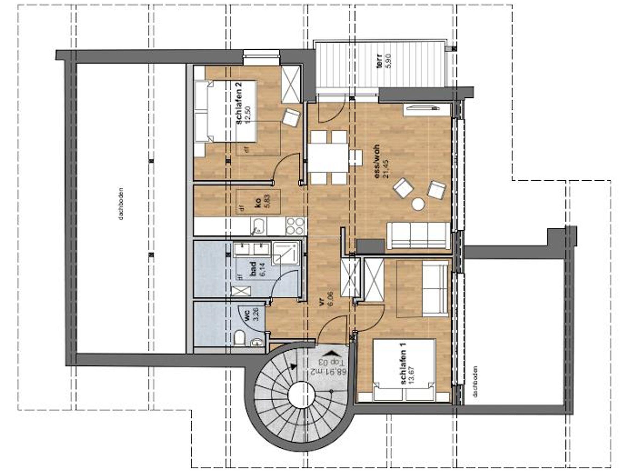 Neue Ferienwohnung im Dachgeschoß für 2-6 Personen. 2 SZ, Kochen/Essen/Wohnen, Badezimmer, Balkon.