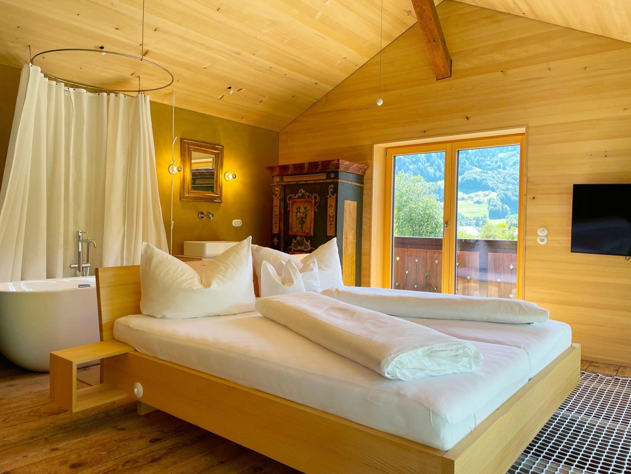 • „Die Betten scheinen zu schweben und die Aussicht in die Bergwelt ist fabelhaft.“ (Artikel: Leben und Wohnen)