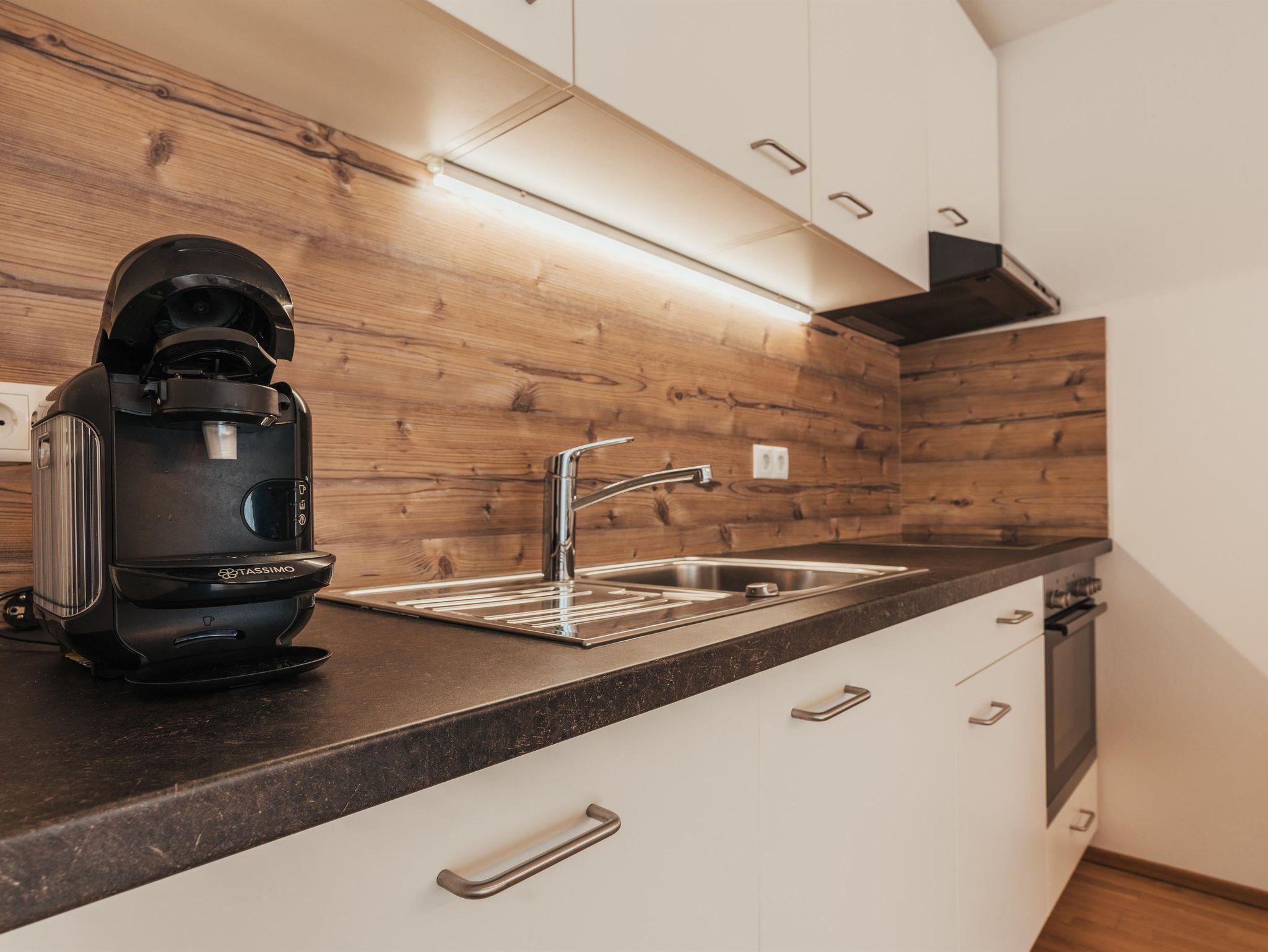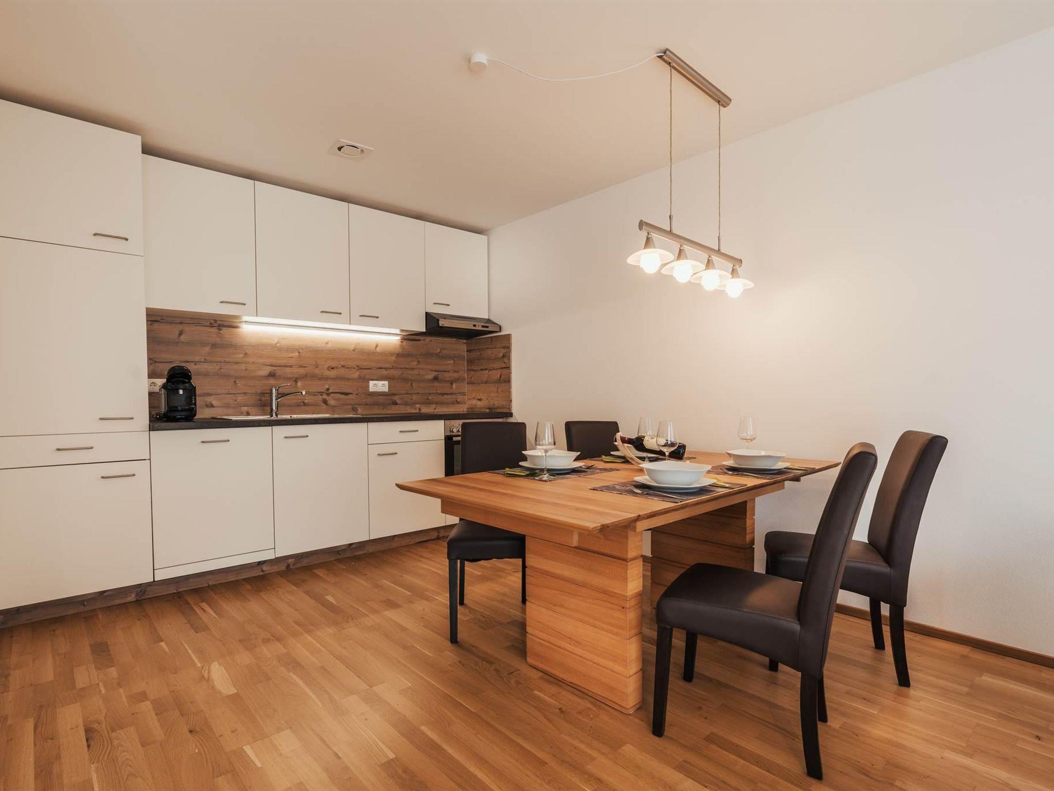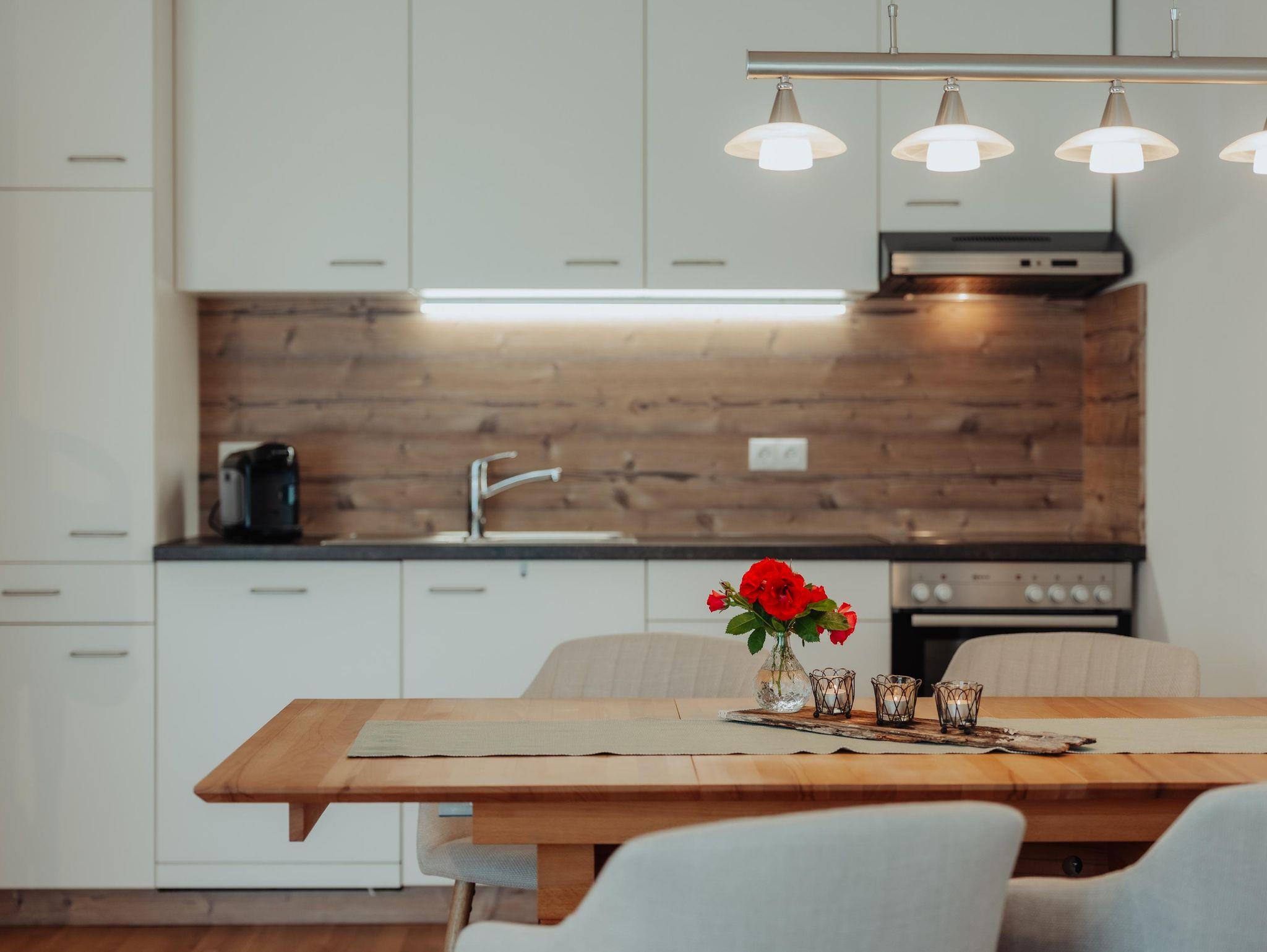 Die gemütliche Wohnküche lädt mit ihrer Essecke und dem großen Wohnzimmer zum Verweilen und Entspannen ein. Hier findest du alles was du benötigst.