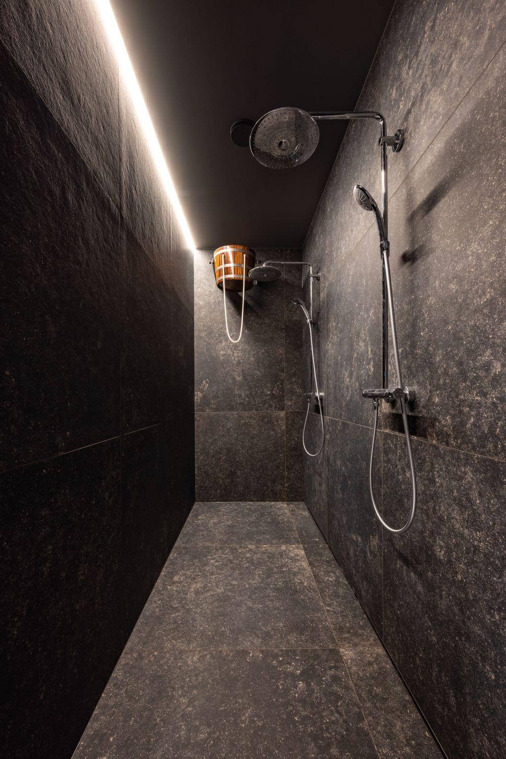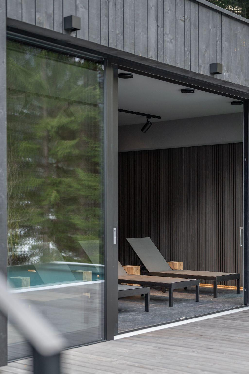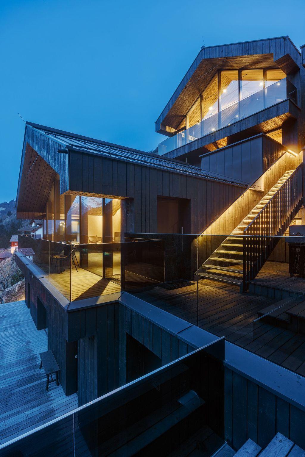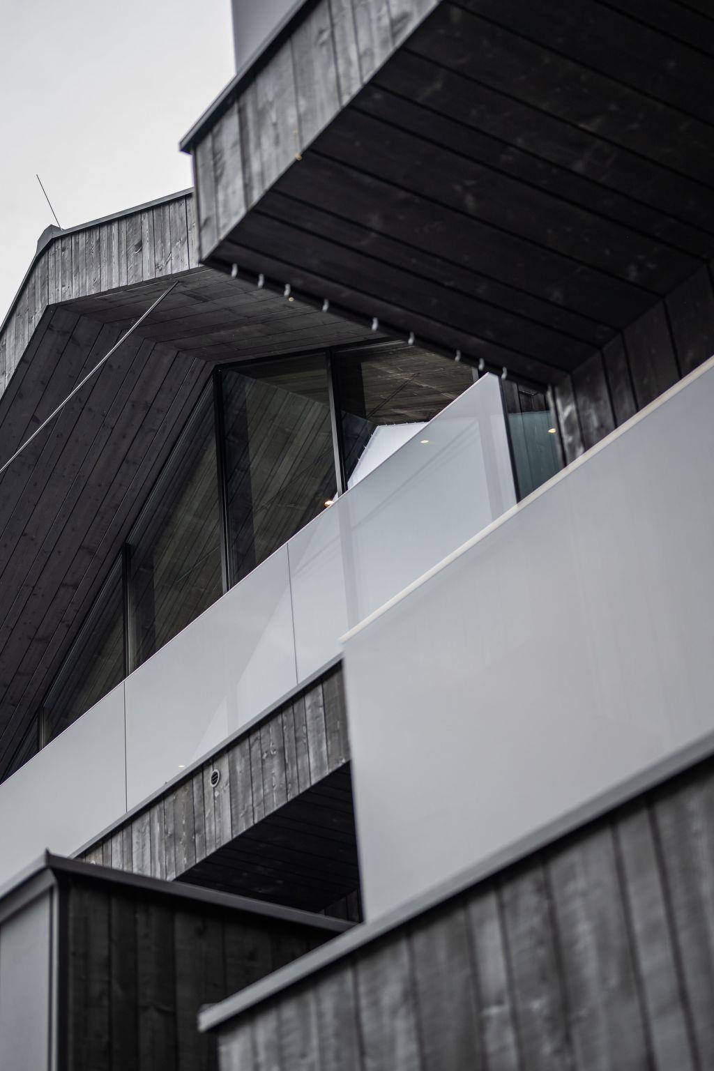 The roofs imitate the mountain silhouette on the other side of the valley. The black wood blends naturally into the deep forest and the structure of the buildings is in perfect balance with their natural surroundings.