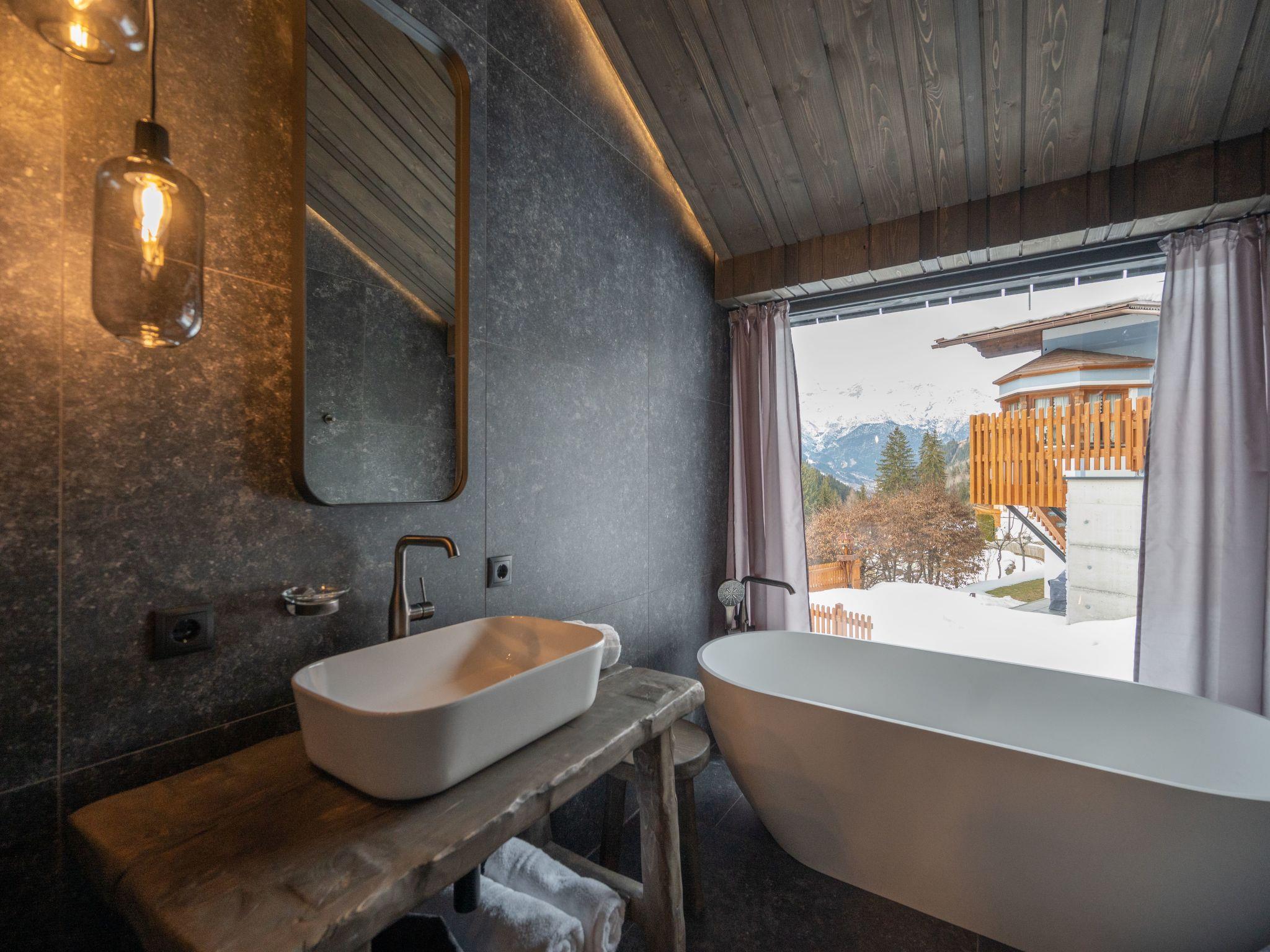 The marvellous view can also be enjoyed from the bathroom, which is equipped with a free-standing bathtub and looks directly onto the Alpine peaks.