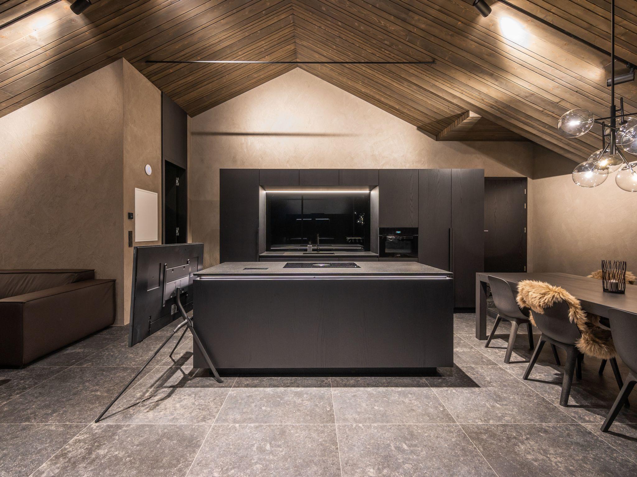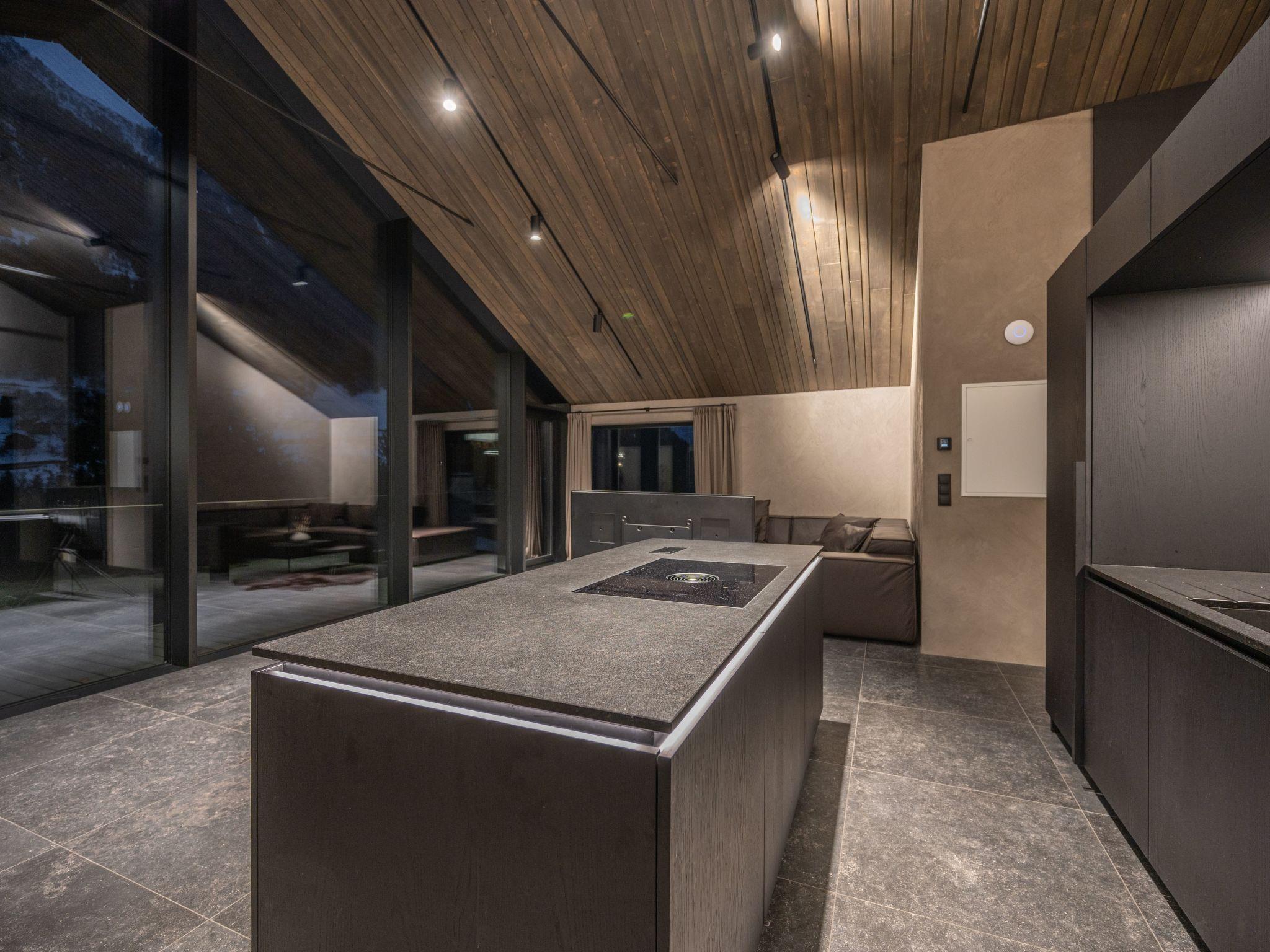 The mountain villa offers a living room and dining area that are very comfortable and spacious. The dining area is located at the top of the chalet and has high wooden ceilings. The glass walls open onto the large balcony, where you can enjoy a breathtaking panorama over the mountains and feel connected to the alpine nature. Outdoor seating furniture makes the balcony an attractive place for a "sundowner". You can also make yourself comfortable on a cosy sofa in the living area. Opposite the living room is the open-plan kitchen with high-quality Miele appliances.