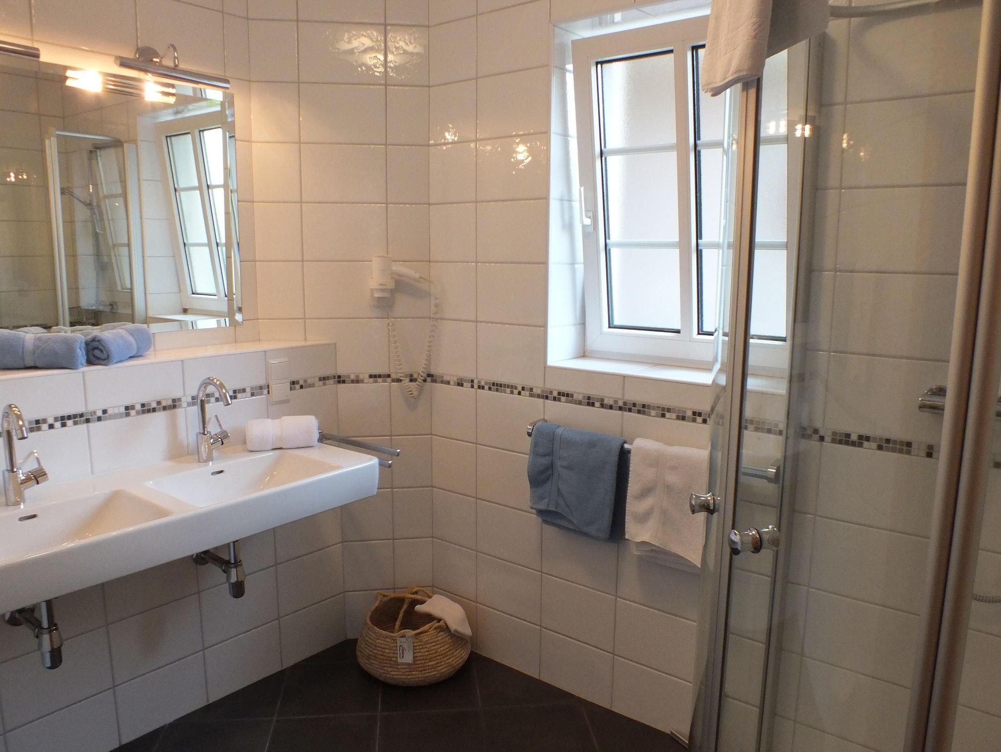 neue Bäder mit Doppelwaschbecken, Dusche und Föhn, separates WC
