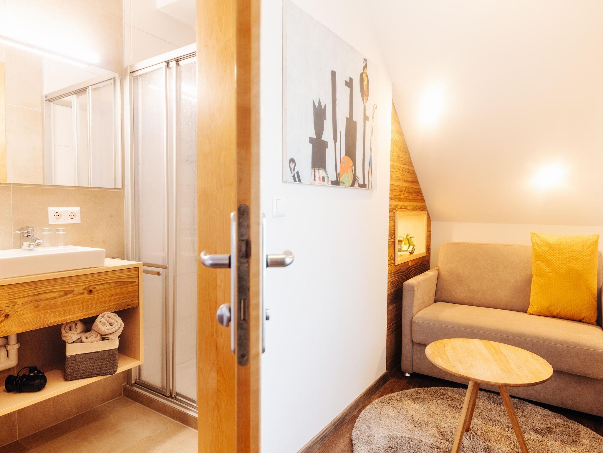 Schlafzimmer, Verbindungstüre Schlafraum oder Sitzmöglichkeit, DU/WC, Flat - Sat-TV (Digital, 90 Programme),Radio, Wecker, Minibar - Kühlmöglichkeit, Sitzecke, Schreibtisch - WLAN kostenlos, Zentralheizung