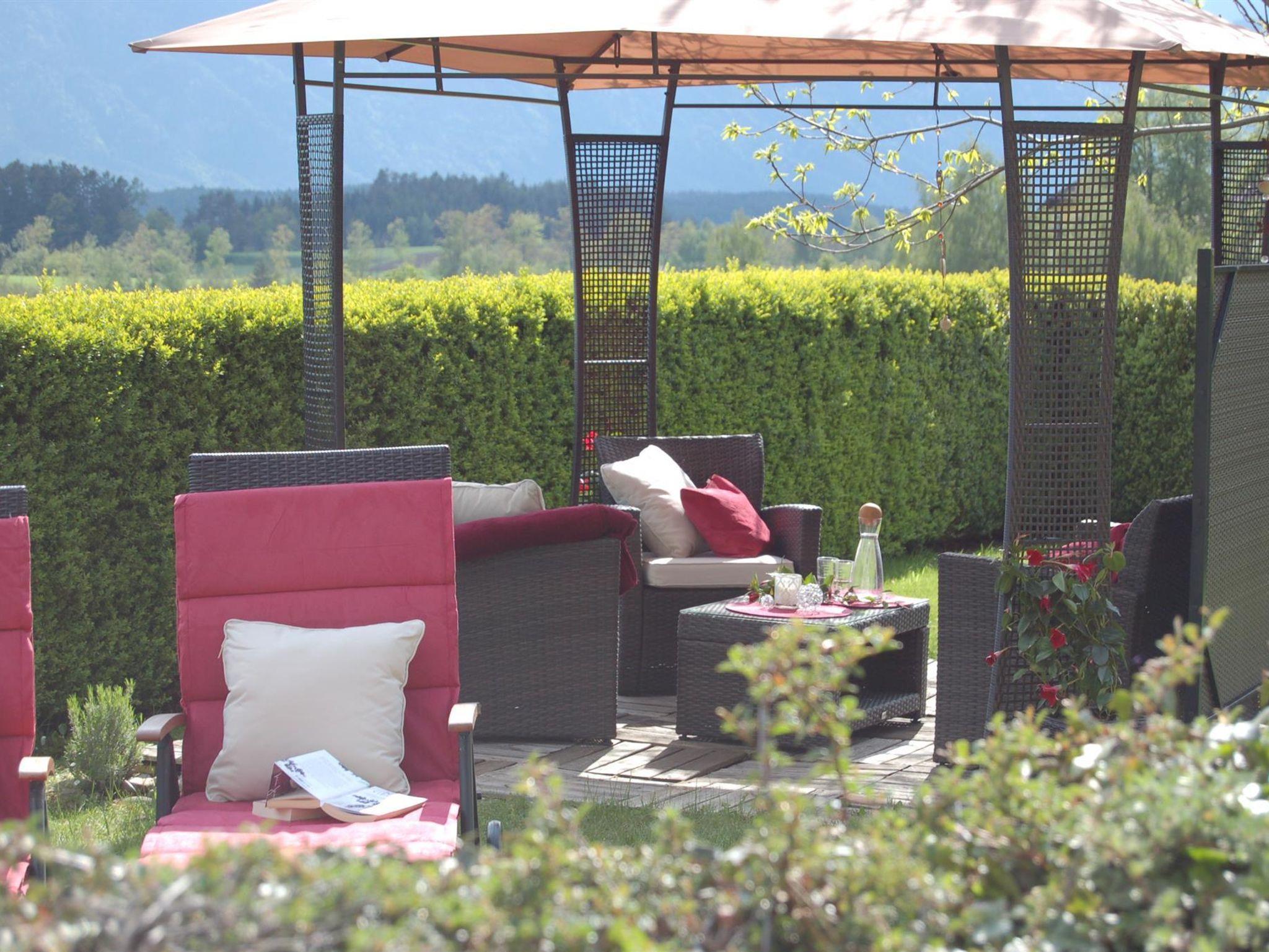 Auf der großen Terrasse befinden sich unser Lieblingsplatzl, das mobile Kräuterwagerl, die Millstätter See Liege und unser Grillkamin. Wenns schnell gehen soll können wir auf unseren großen Gasgriller ausweichen. Im Garten können Sie im Pavillon unter dem großen Kastanienbaum oder auf den Liegen entspannen und die Ruhe genießen.