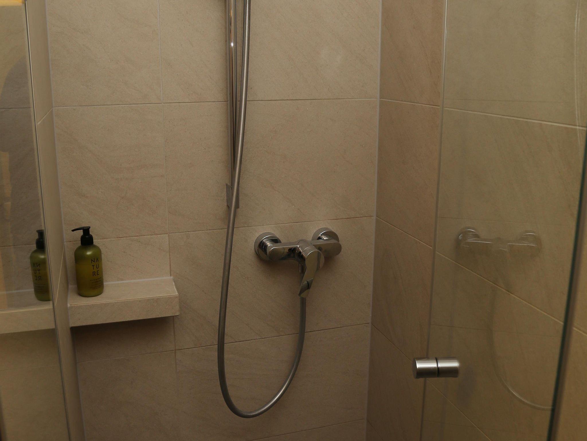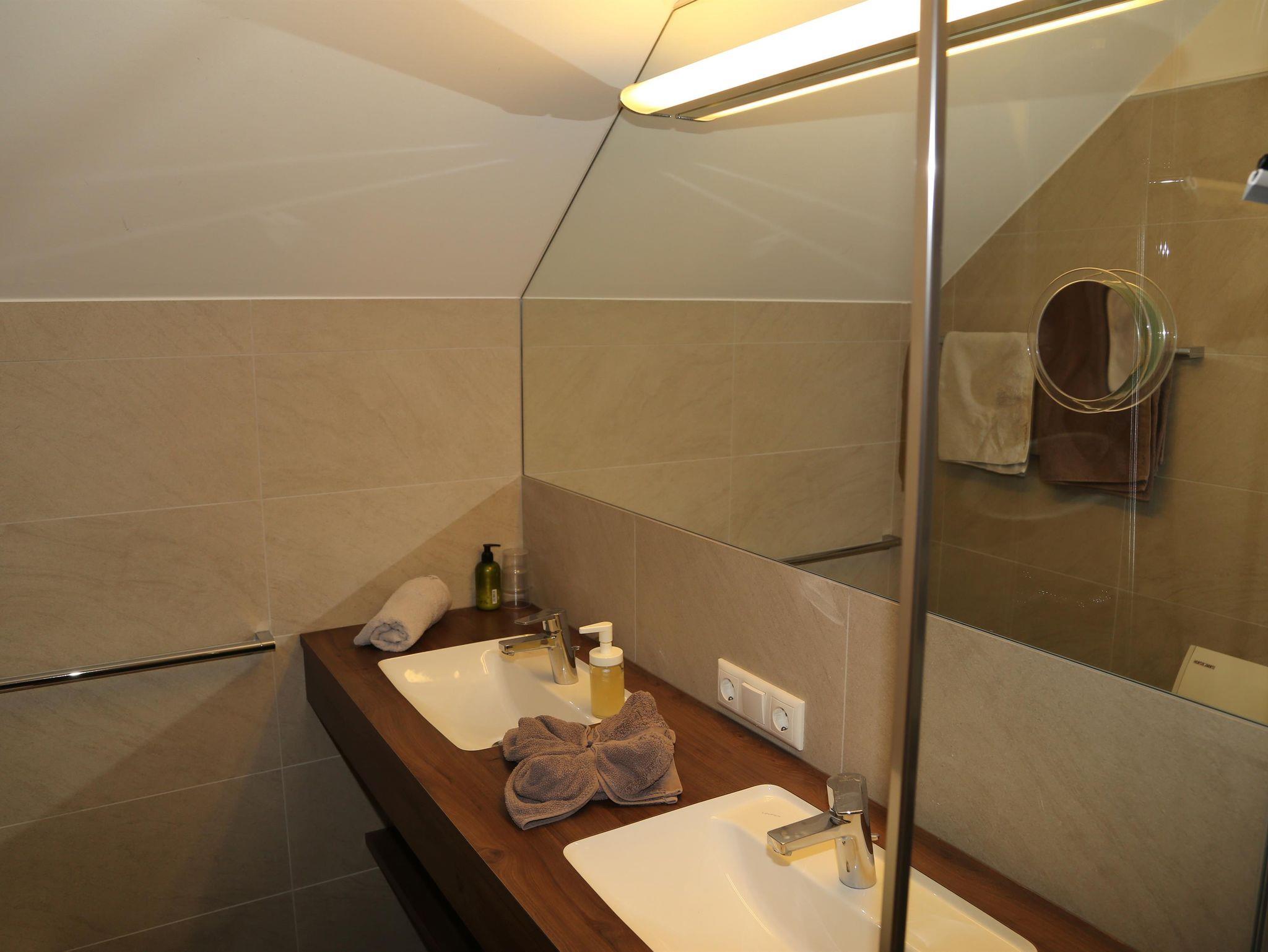 Bad mit Doppelwaschbecken, Dusche und Föhn, separates WC.