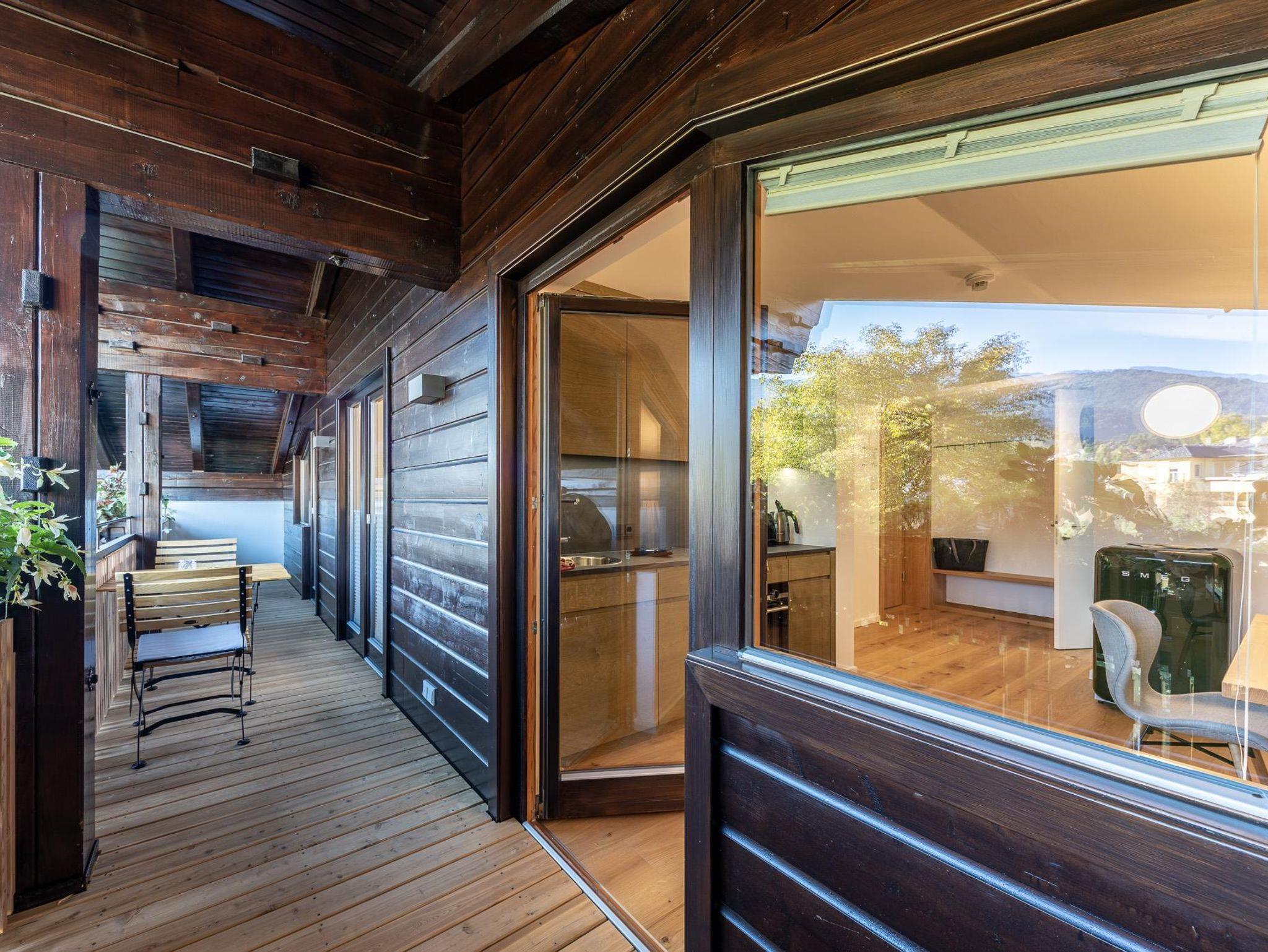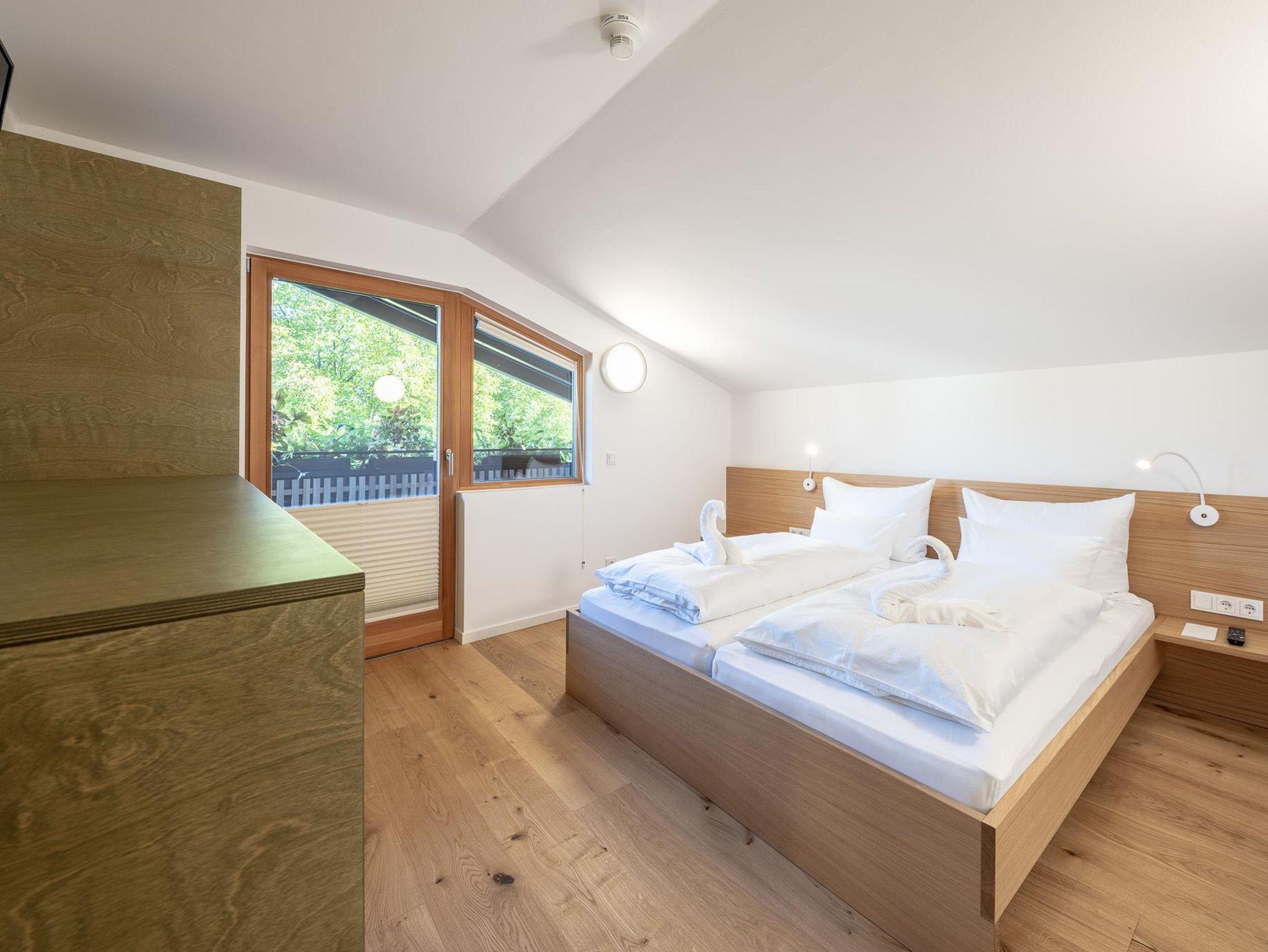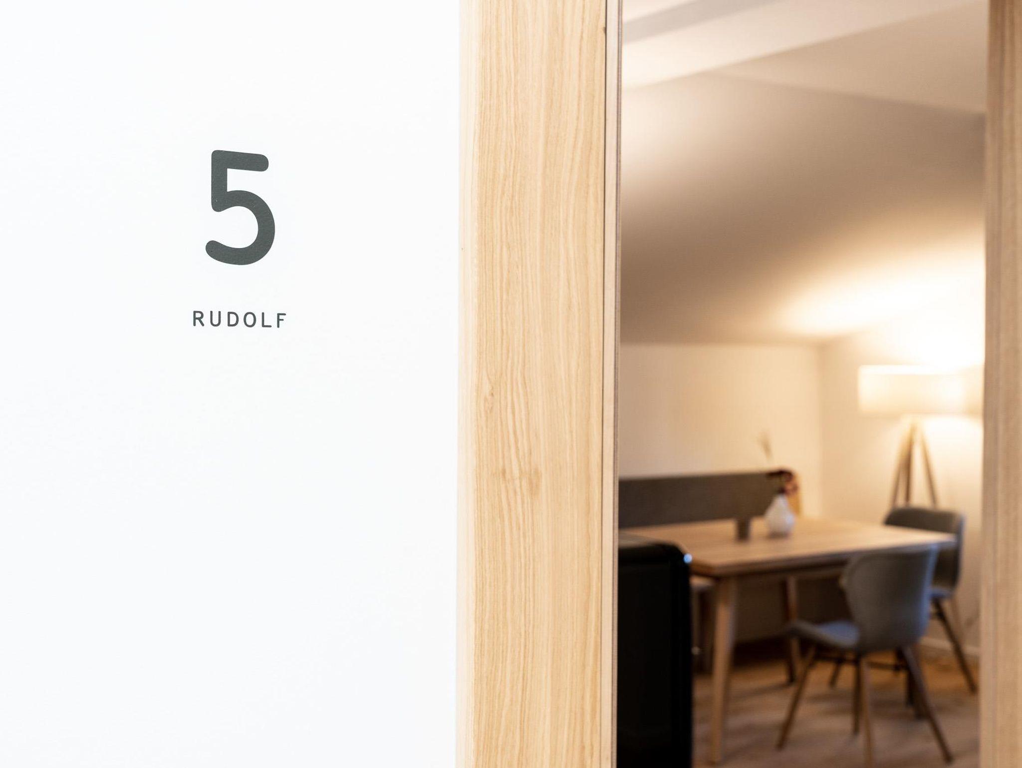 Klein aber fein – zum Appartement Rudolf im Dachgeschoss gelangt man mit dem Lift (bis zum 2.OG) und dann über ein paar letzte Stufen unters Dach. Mit dem großem Balkon, getrenntem Wohn- und Schlafraum, voll ausgestatteter Küche und einer Badewanne mit Blick auf die Berge ist dieses Appartement der ideale Ort für den Rückzug zu Zweit.