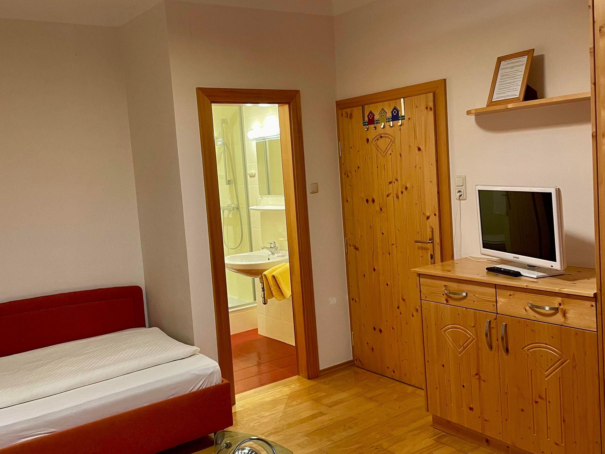 Das Einzelzimmer ist im Haus Frühauf. Es ist komfortabel groß, mit Vollholzmöbel und Holzboden.