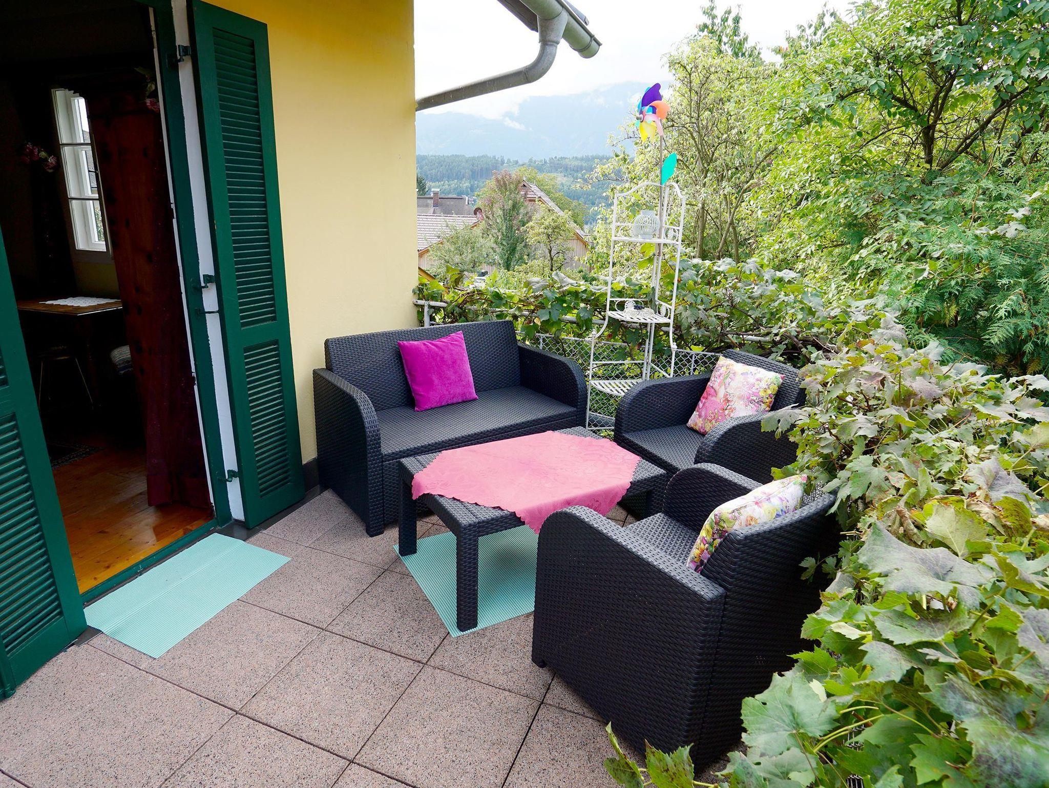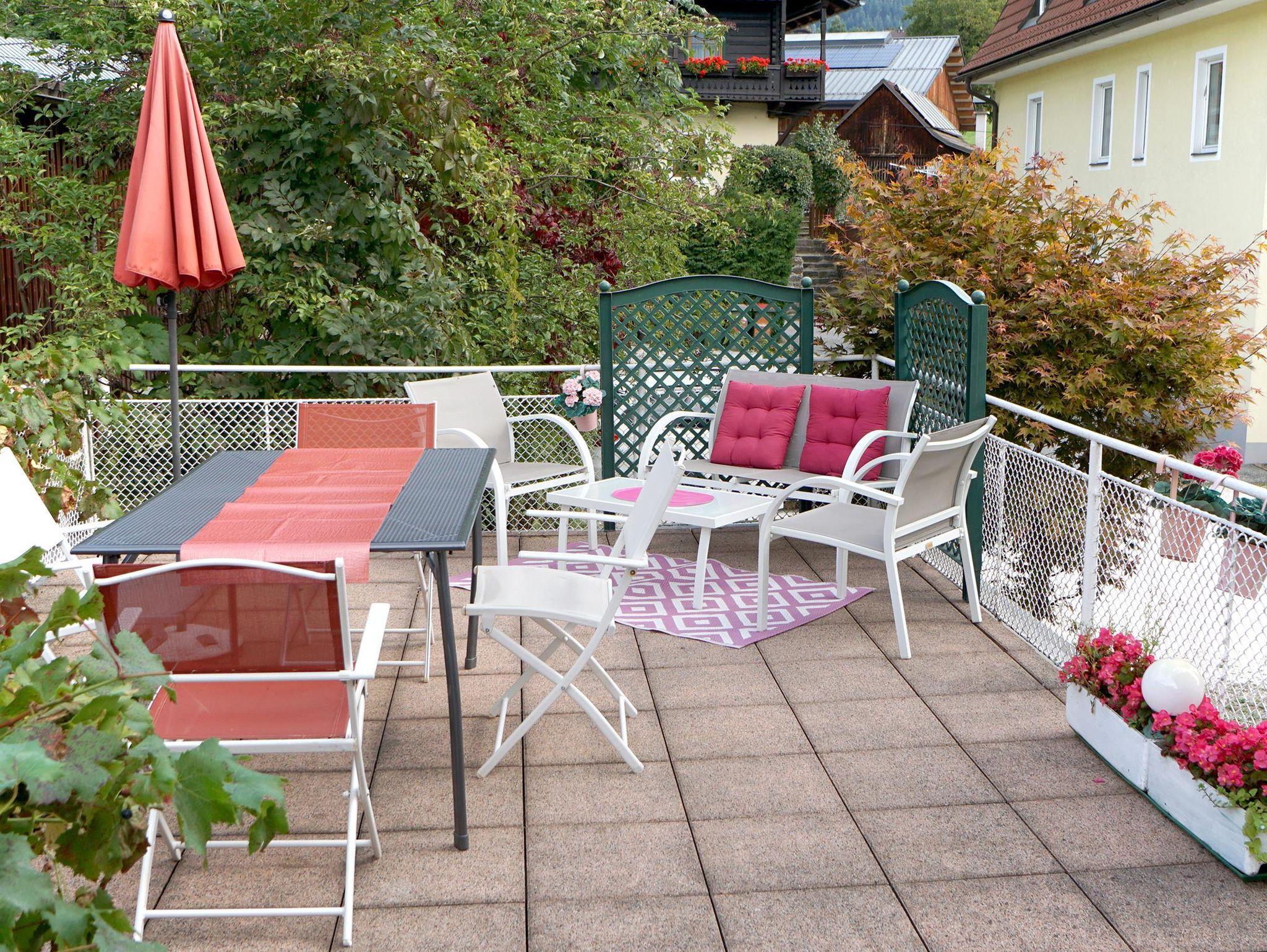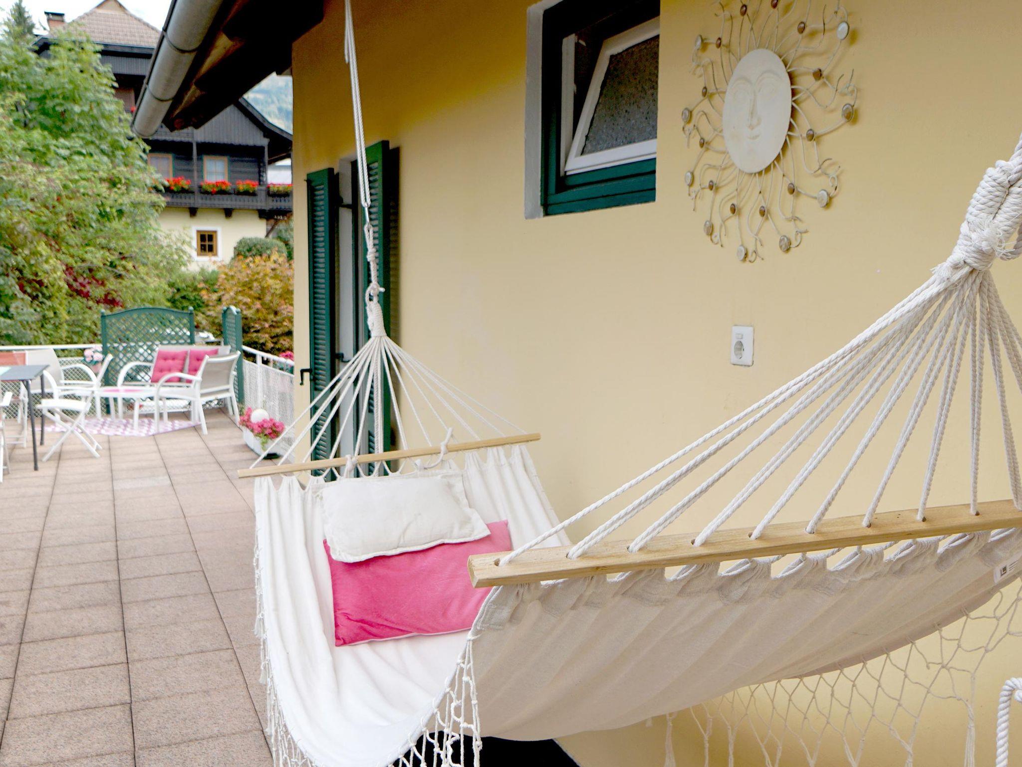 Besonders einladend ist die 40 m² große Terrasse mit Morgen- und Abendsonne, Gartenmöbeln, Hängematte, Sitzgarnitur und Esstisch – ideal zum Frühstücken im Sonnenschein oder Entspannen am Abend.