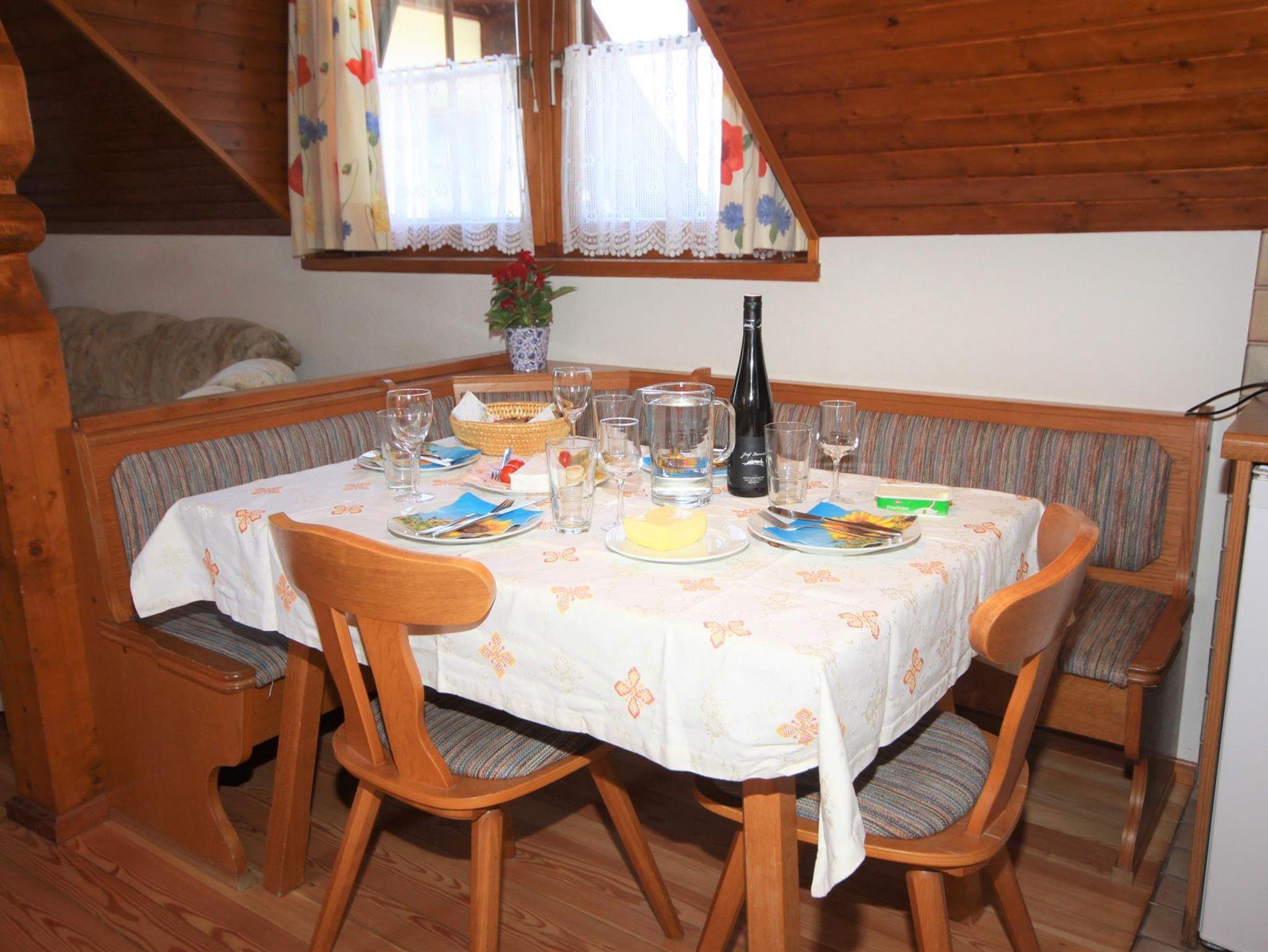 Sie besteht aus einer Wohnküche, welche komplett mit E-Herd, Backofen, Kaffee- und Brotmaschine sowie einem Toaster ausgestattet ist. Die gleich angrenzende große, bequeme Essecke lädt zum gemeinsamen Abendessen und Verweilen ein.