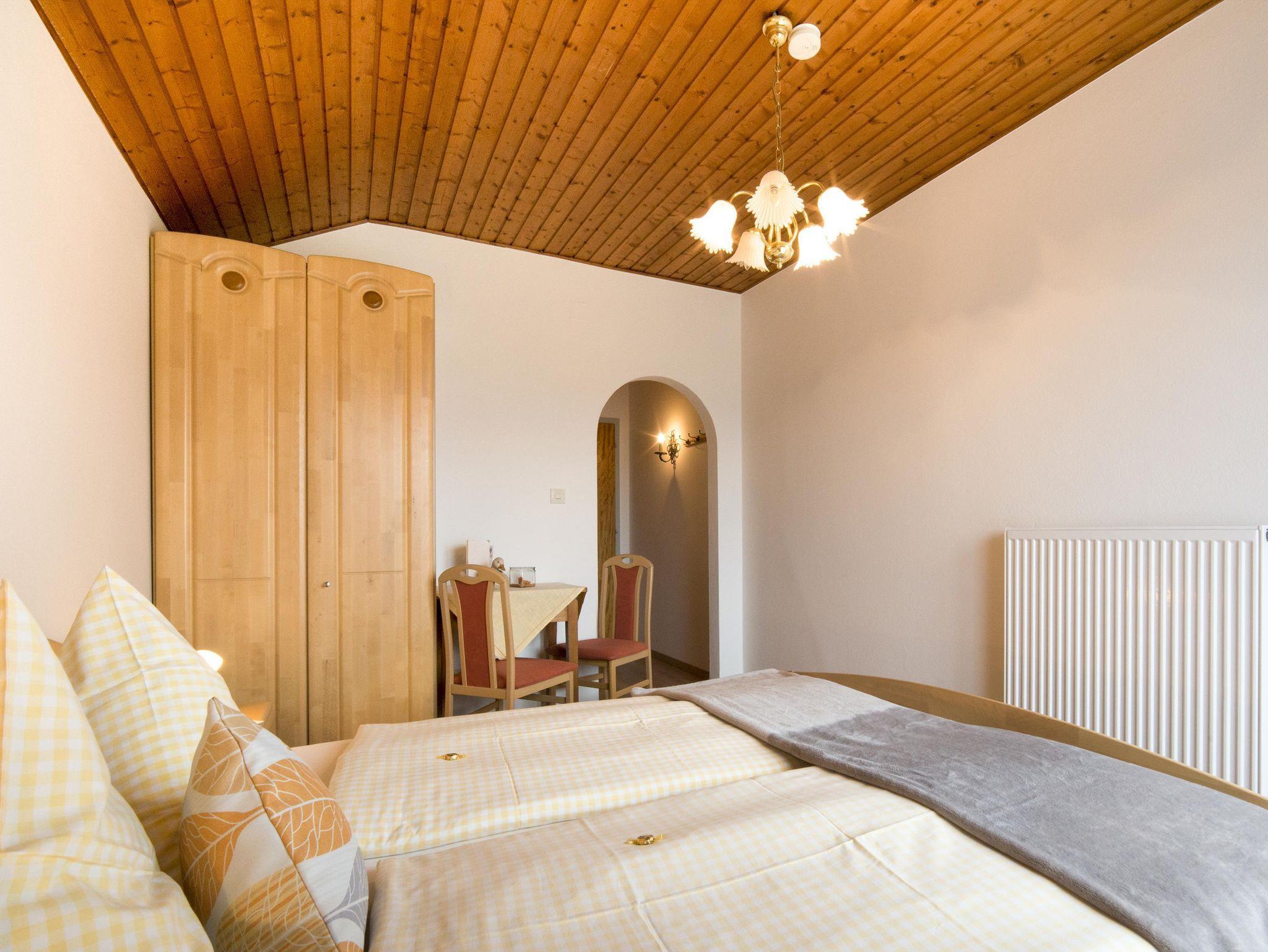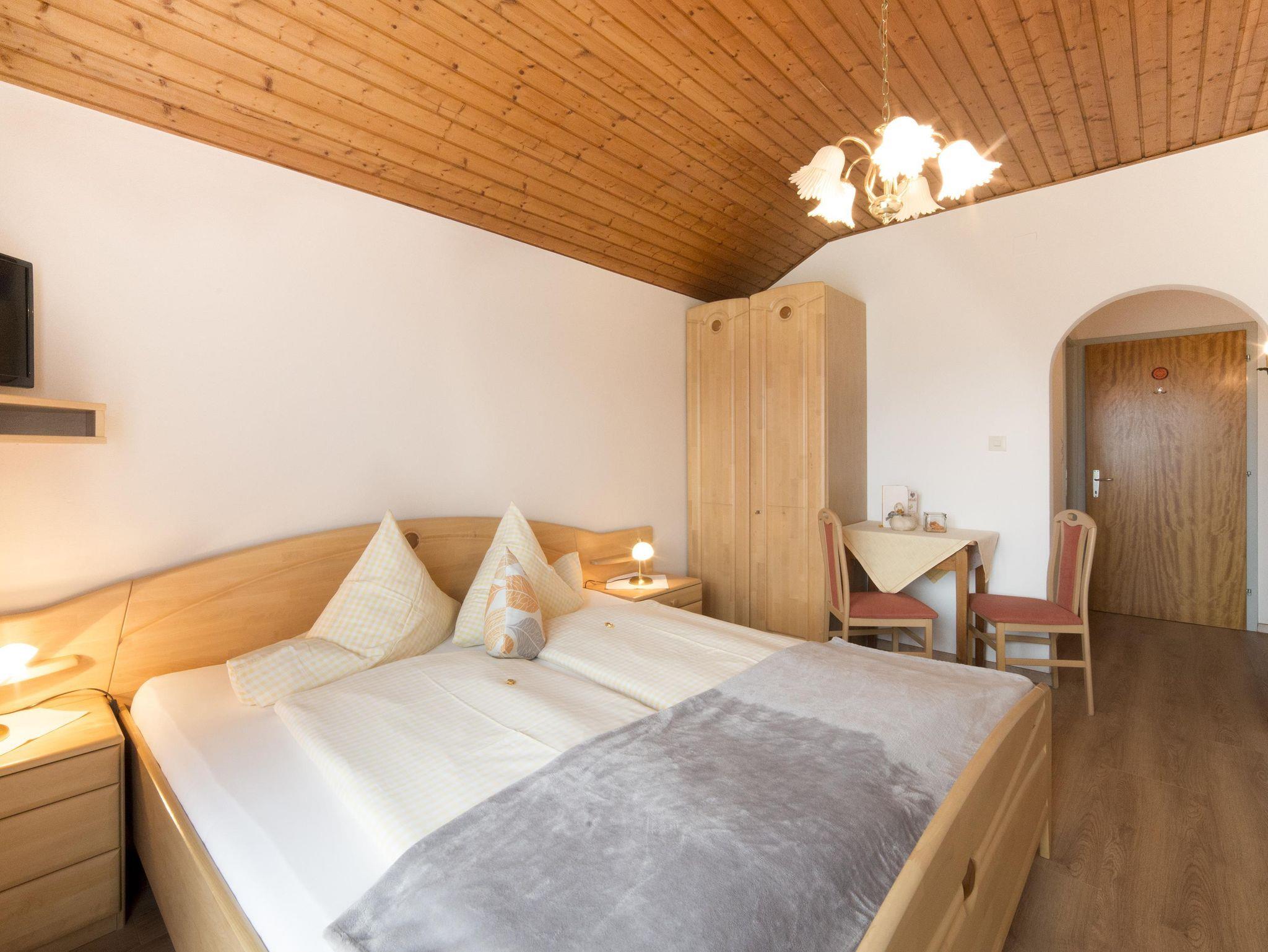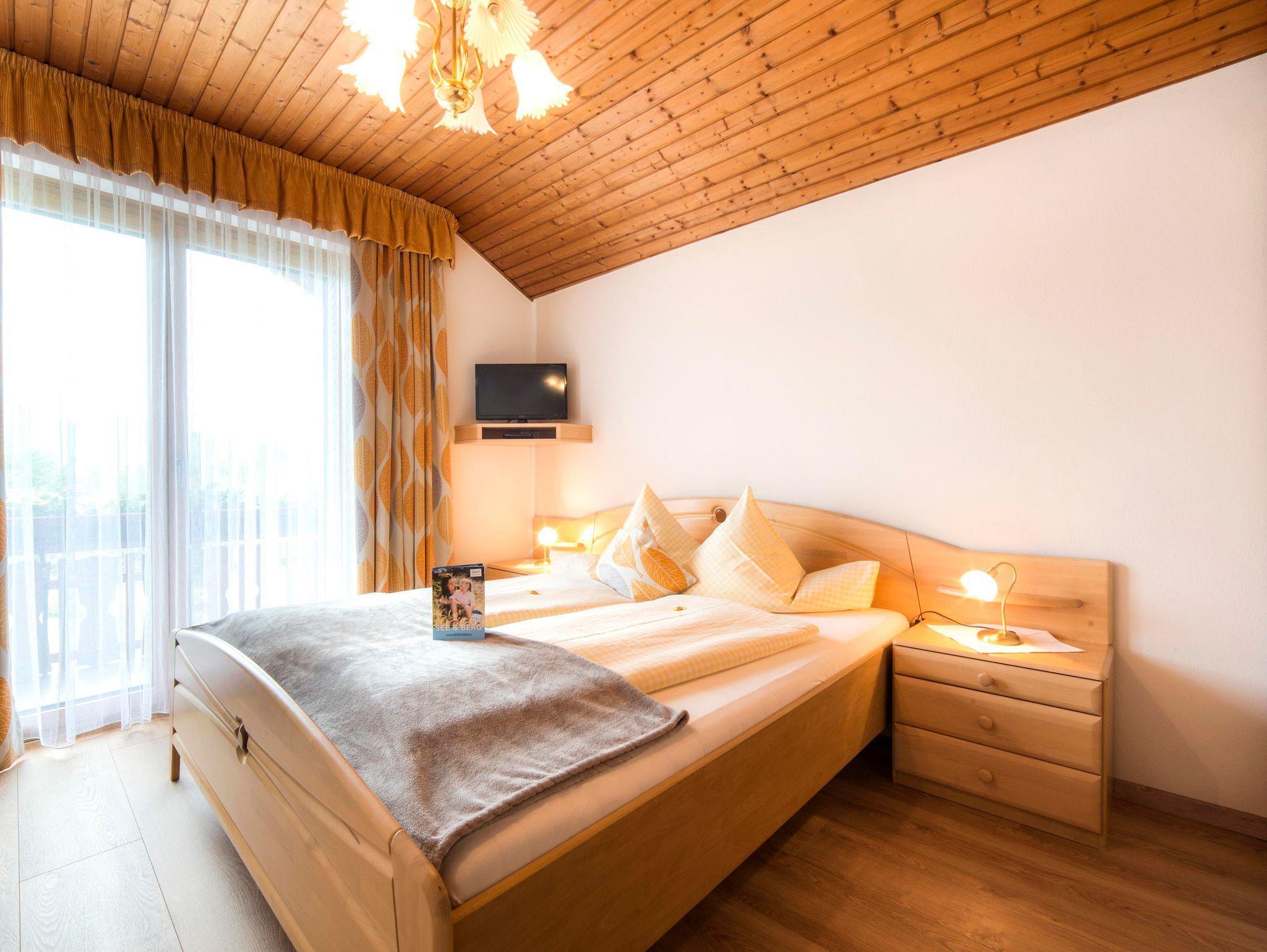 Helles freundliches neues komfortables RELAXzimmer mit Vollholz-Naturmöben 2m Betten m Gesundheitsmatratzen, SAT-TV an der Wand, mit Bogen zum VORRAUM wo D-WC und Garderobe sind. Balkon mit Tisch, zum Süden mit Panoramablick zum Goldeck und der umliegenden Bergwelt,Ponsaigarten,Streichelzoo.NATUR -PUR