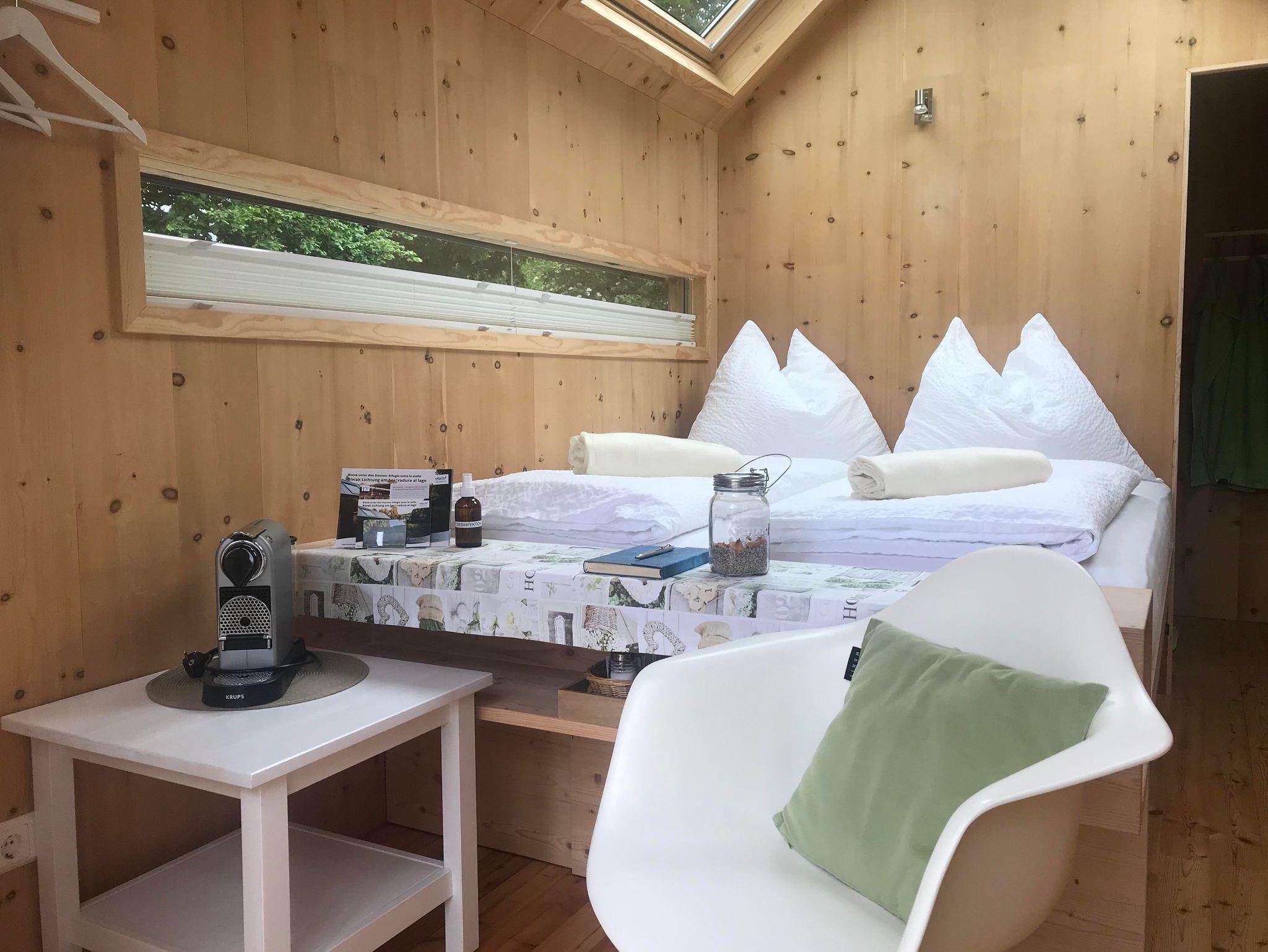 Das refugium am see ist der ultimative Rückzugsort für zwei Personen. Es liegt direkt am See, inmitten einer naturbelassenen Wiese. Obwohl so minimalistisch muss man auf den Komfort nicht verzichten. Im refugium gibt es Warmwasser und eine Warmwasser-Außendusche sowie einen Kühlschrank auf der Terrasse. Nespressomaschine und Wasserkocher gehören auch zur Ausstattung. Sonnenschirm und Liegen befinden sich ebenso beim refugium.