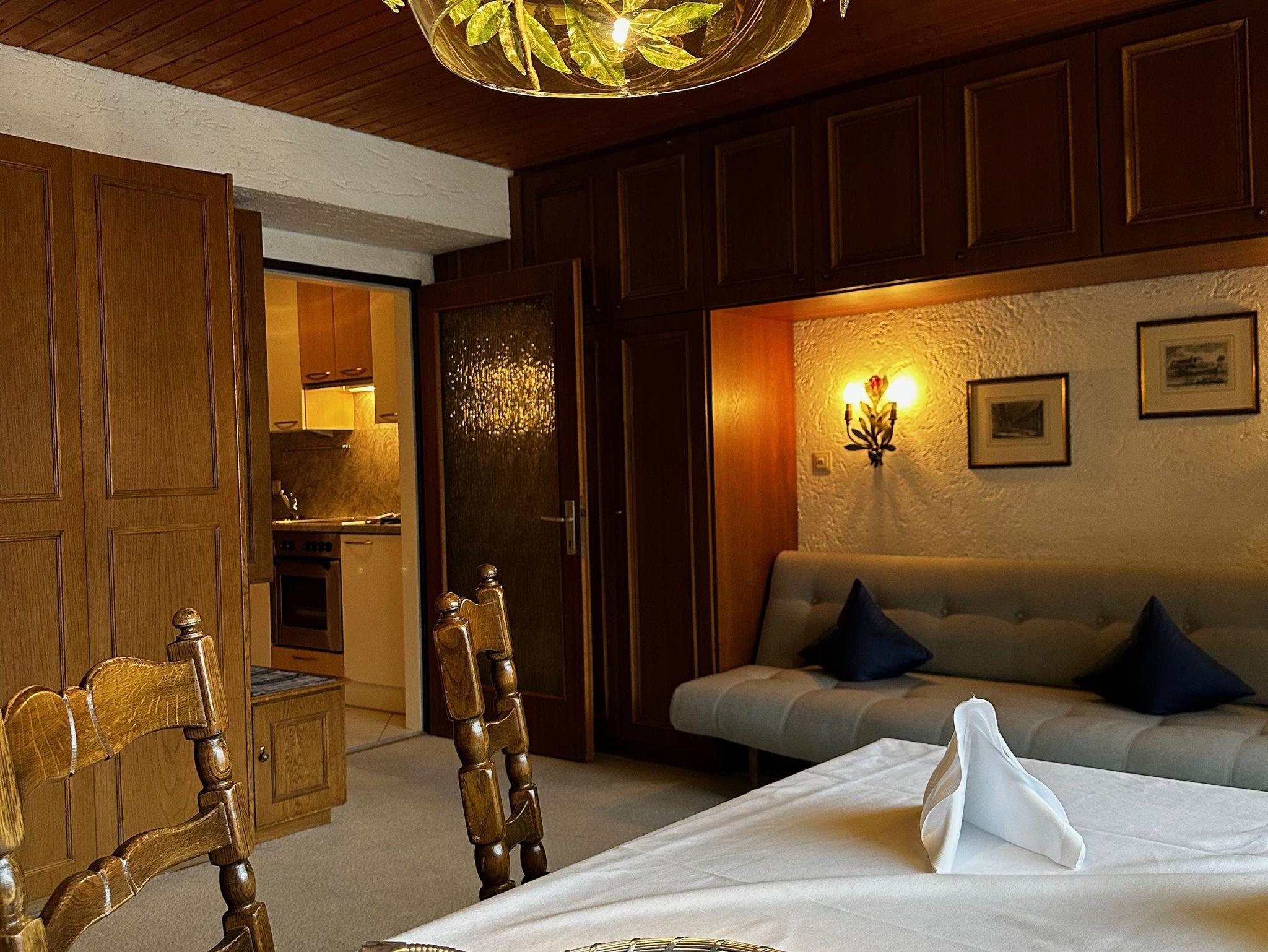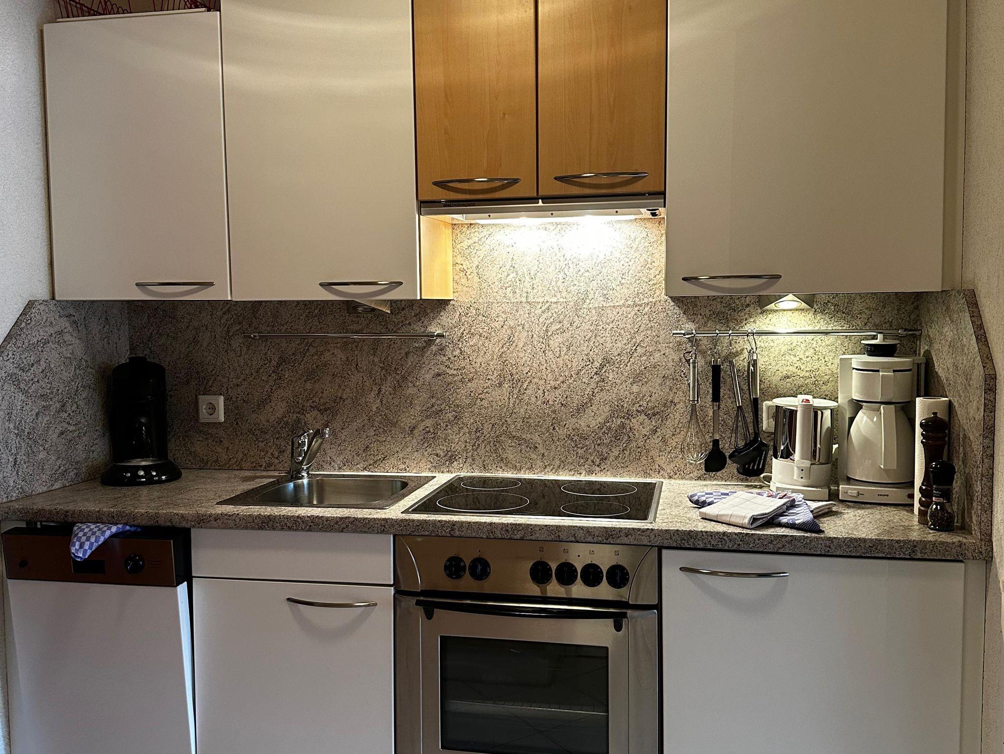 Das etwa 35 m² große Appartement ist ideal für bis zu 2 Personen und bietet einen kombinierten Wohn- und Schlafbereich, eine Küchenzeile, ein Badezimmer und einen Balkon.