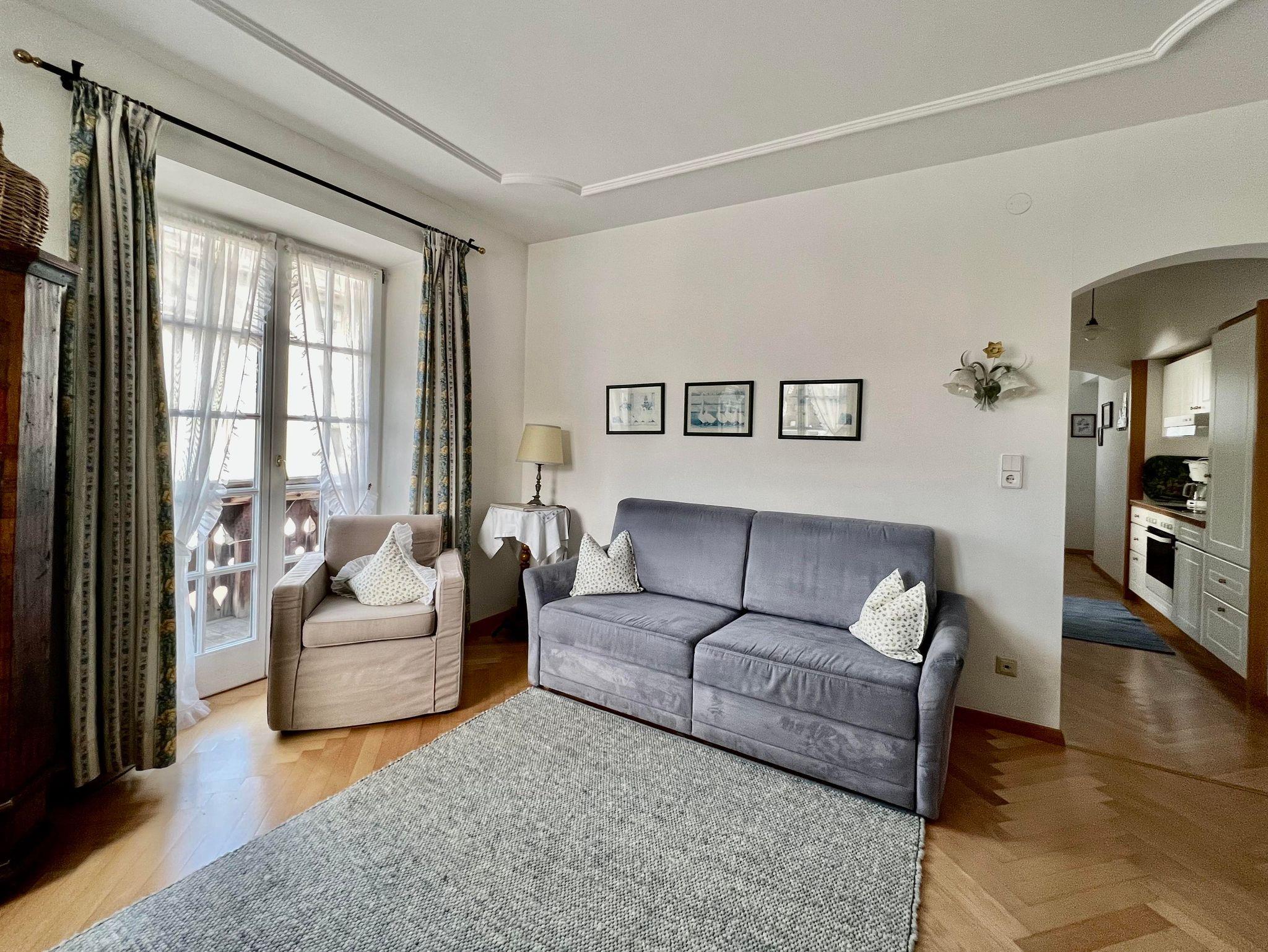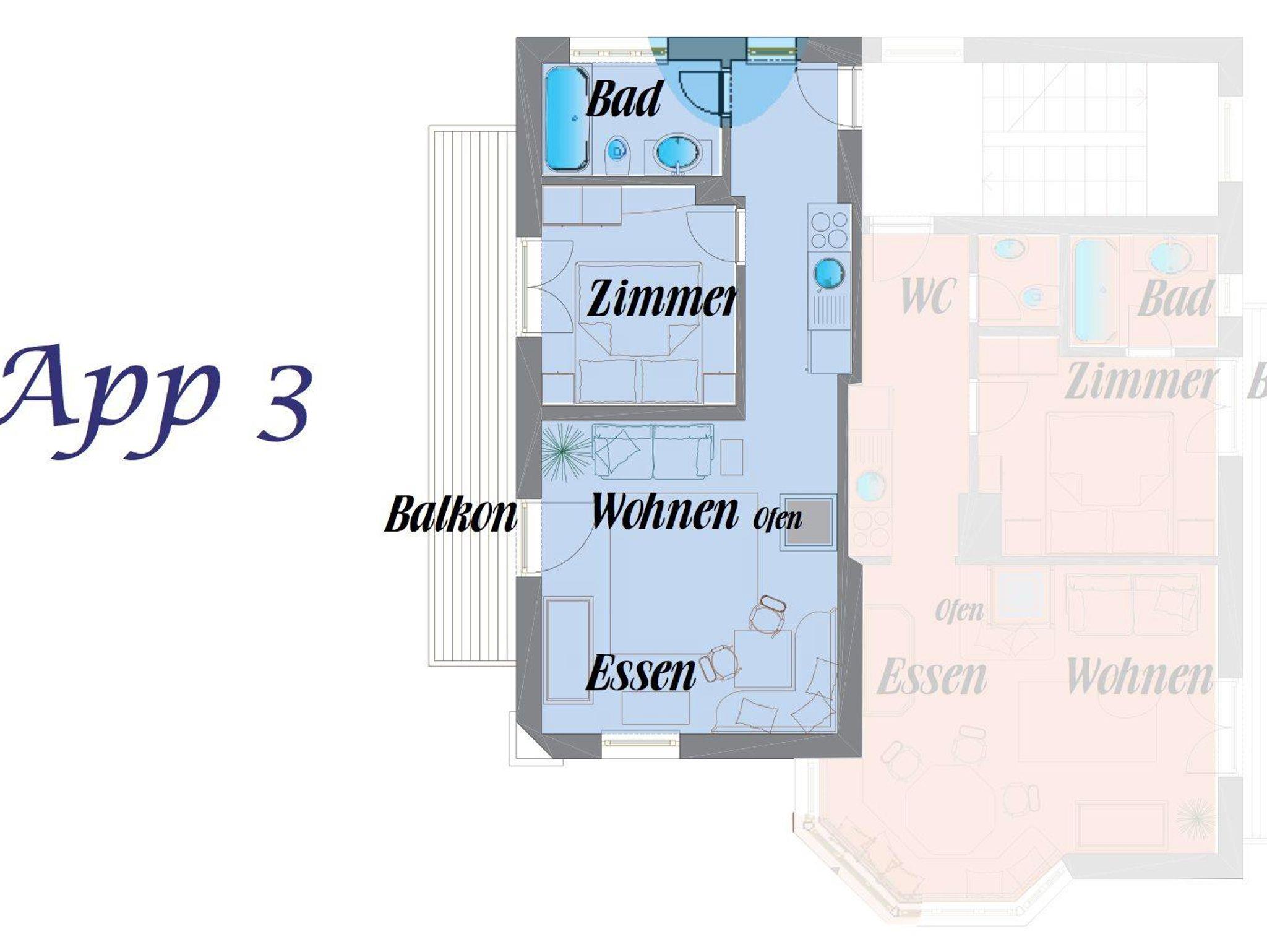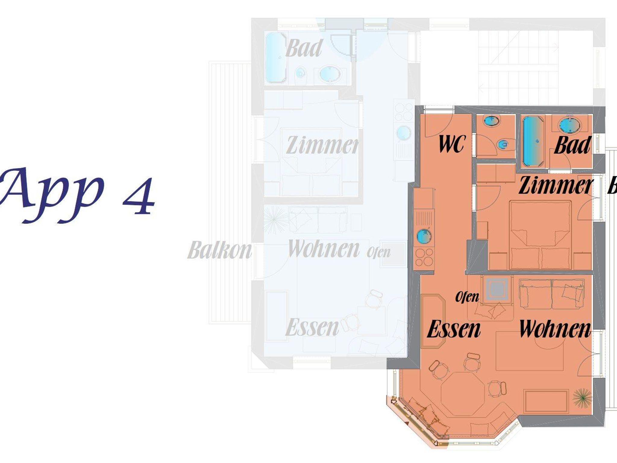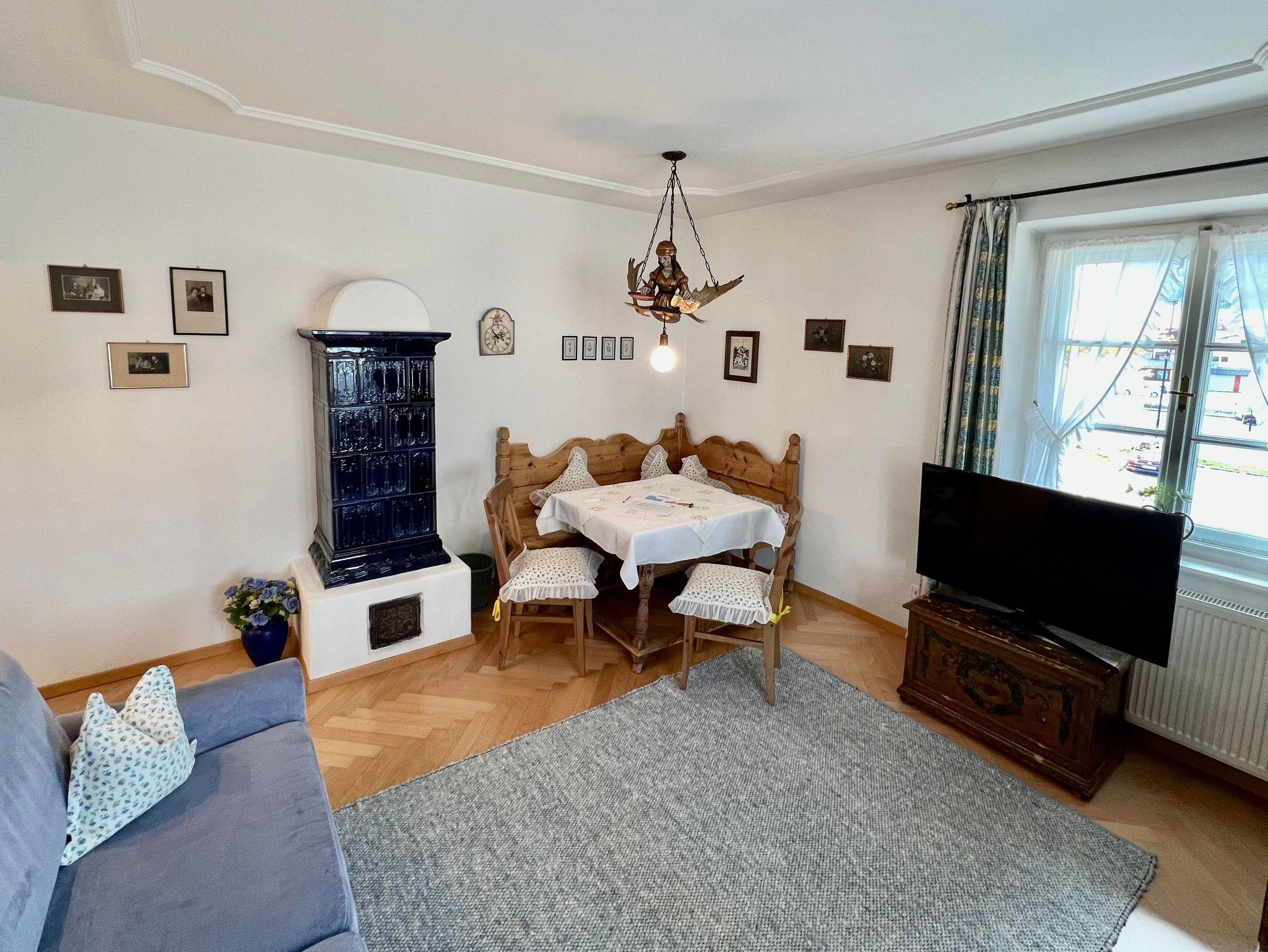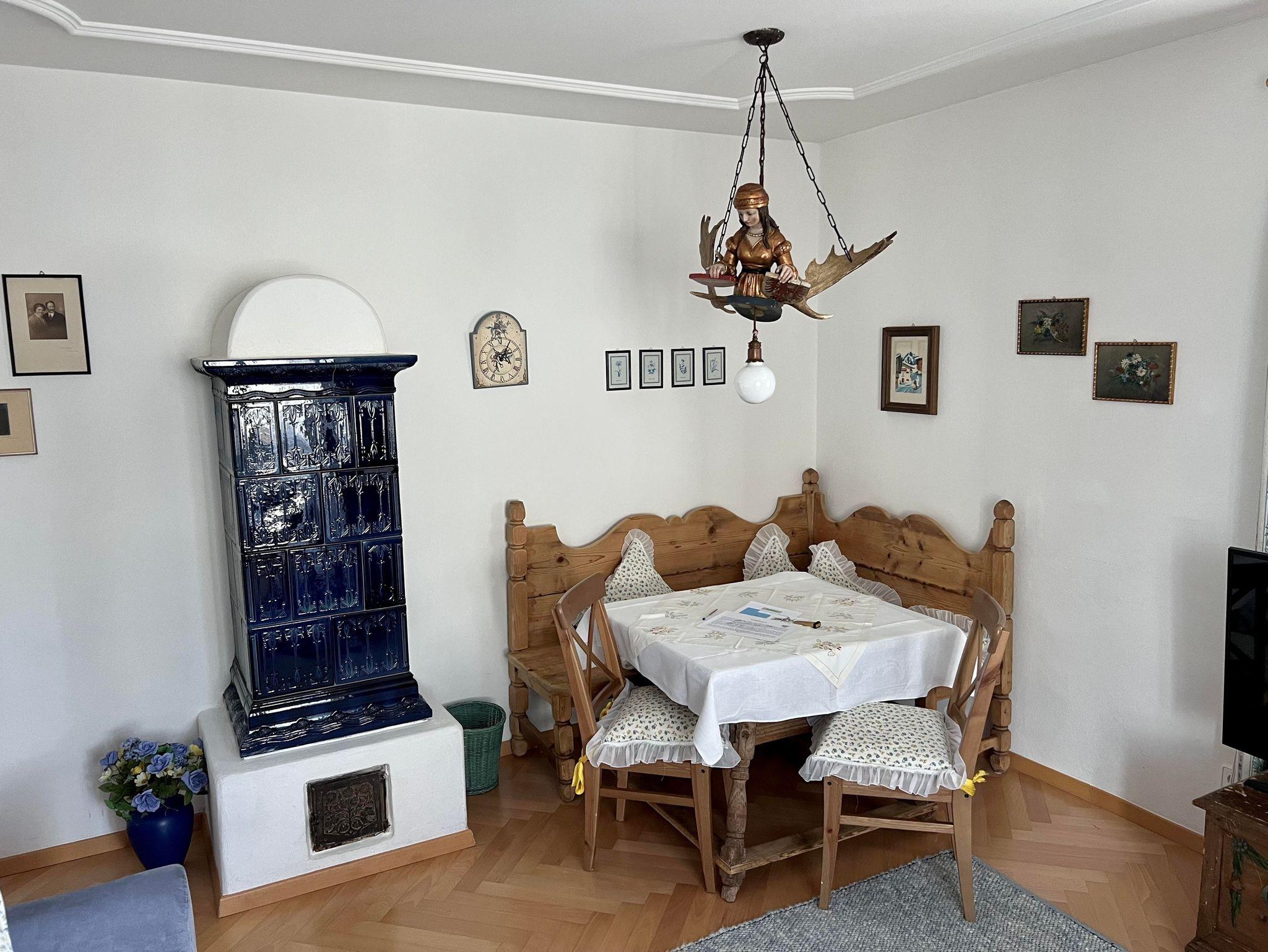Das App. zeichnet sich durch helles, luxuriöses und gemütliches Inventar aus. Es wurde ländlich mit antiken Möbeln, Kachelofen, viel Liebe und Komfort eingerichtet. Es befindet sich im Ersten Stock.