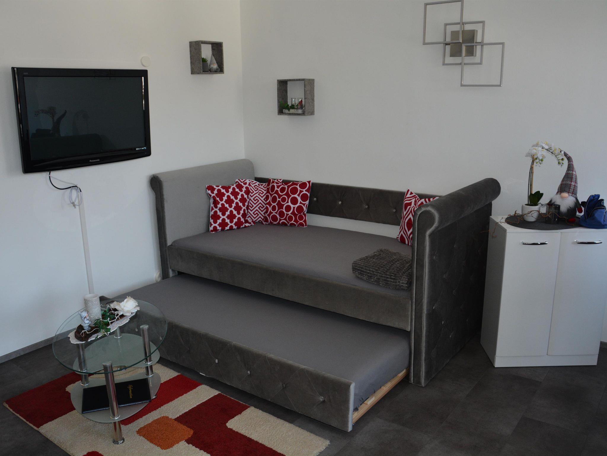 Das Appartement ist 32 m2 groß und besteht aus einem abgetrennten Küchenbereich, einem extra Bad, einem großen Wohn/Ess/Schlafbereich. Ausserdem gibt es einen kleinen Balkon zum Relaxen.