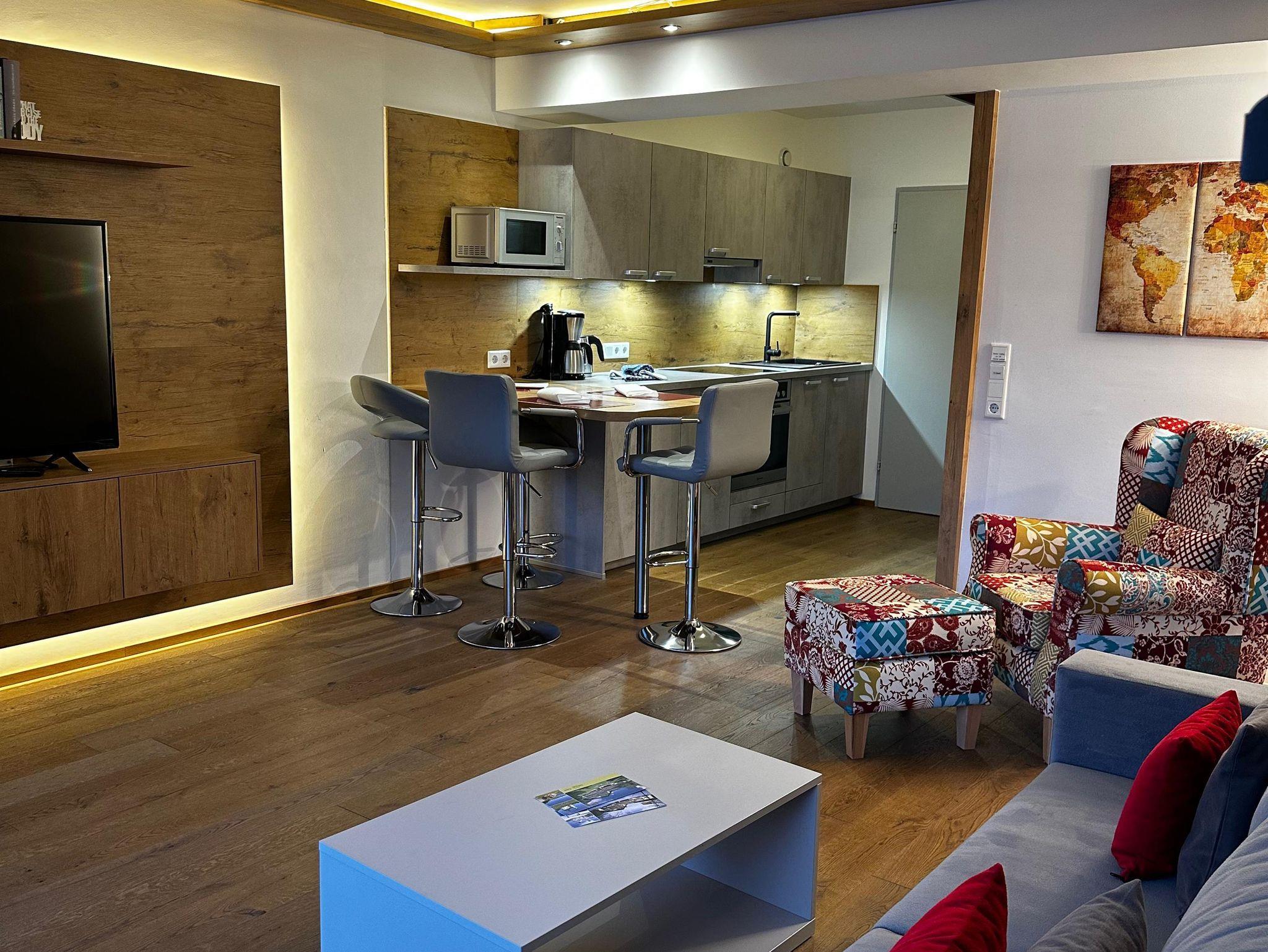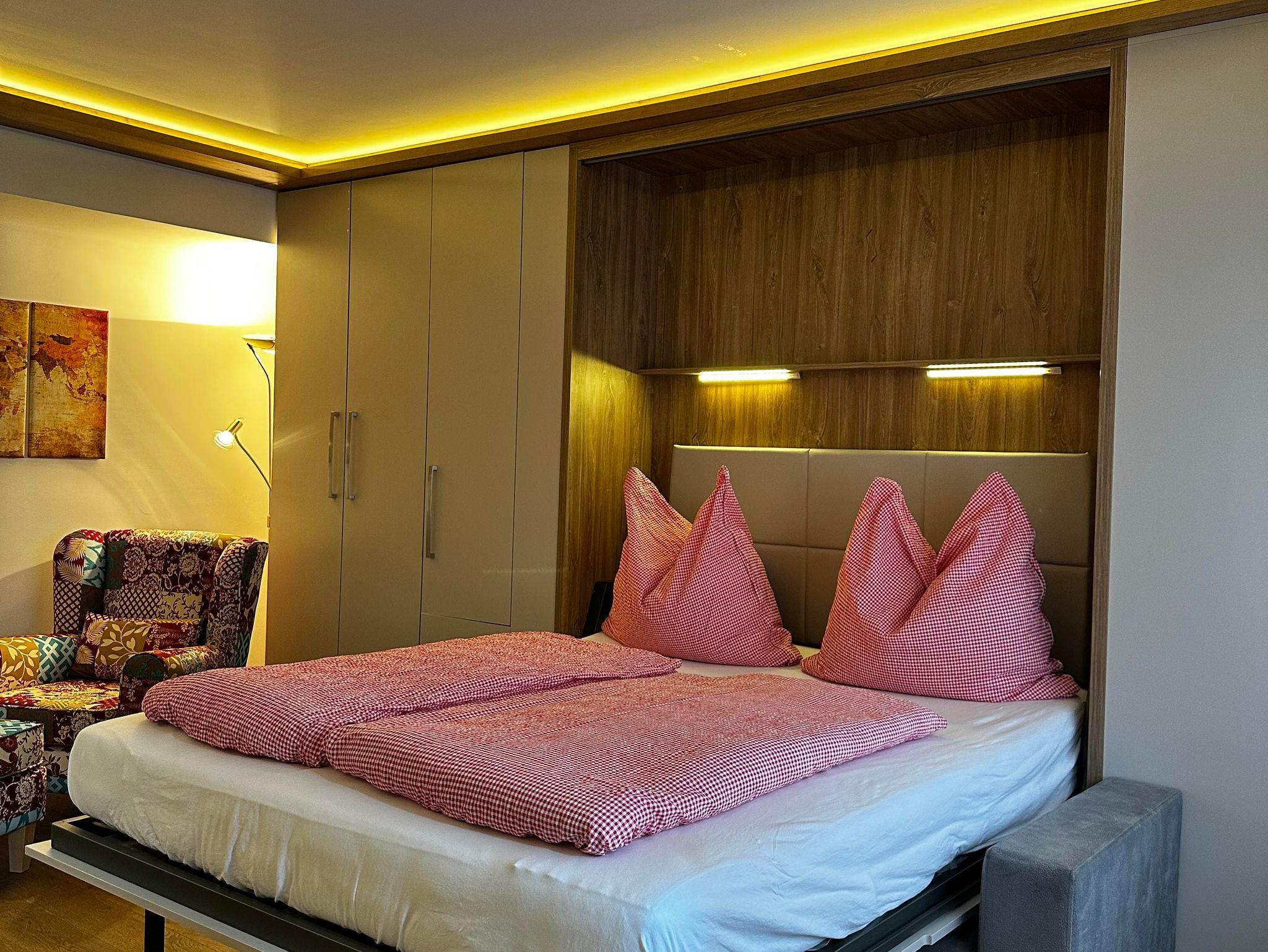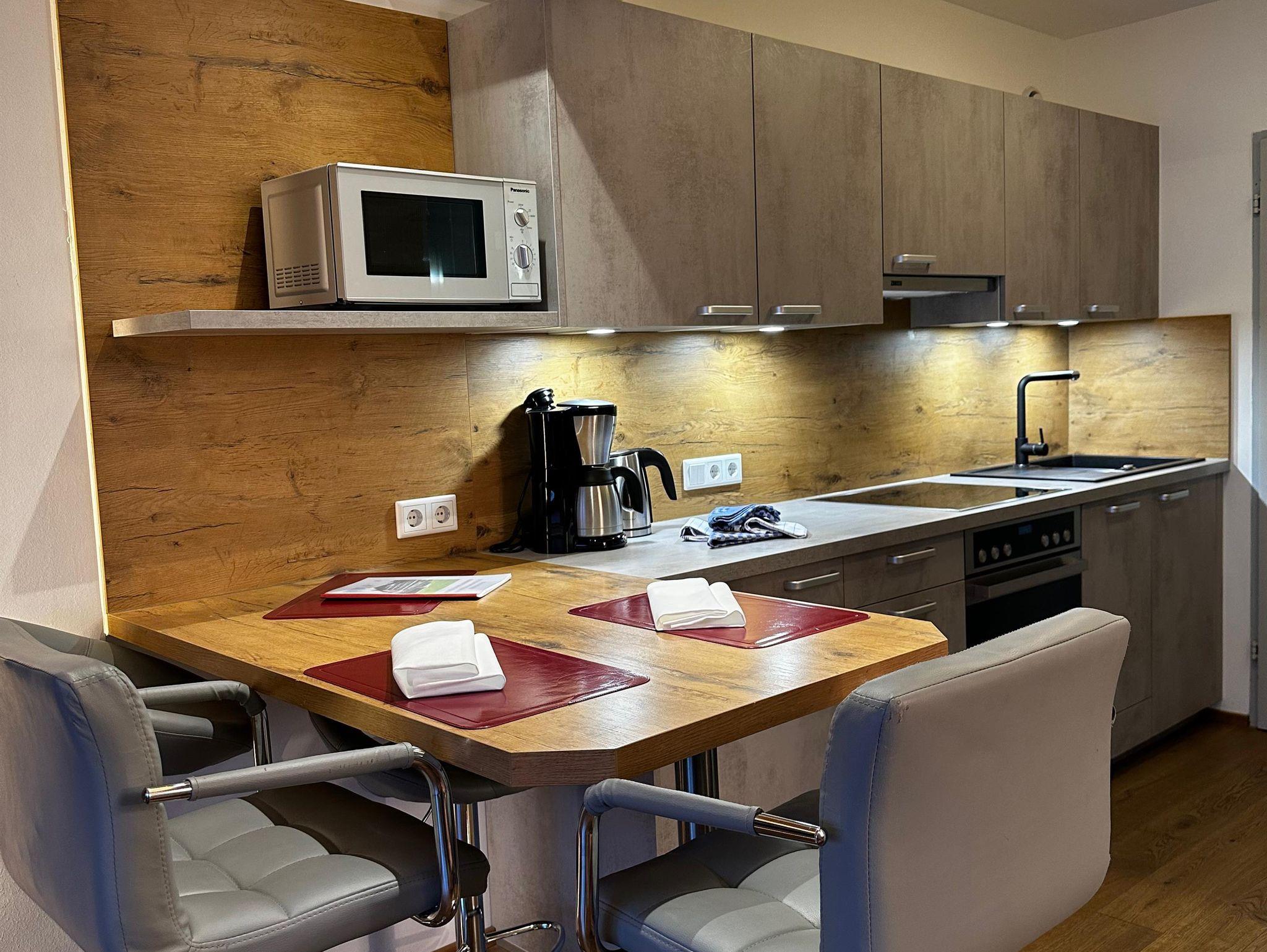 Das etwa 35 m² große Appartement ist ideal für bis zu 2 Personen und bietet einen kombinierten Wohn- und Schlafbereich, eine Küchenzeile, ein Badezimmer und einen Balkon.