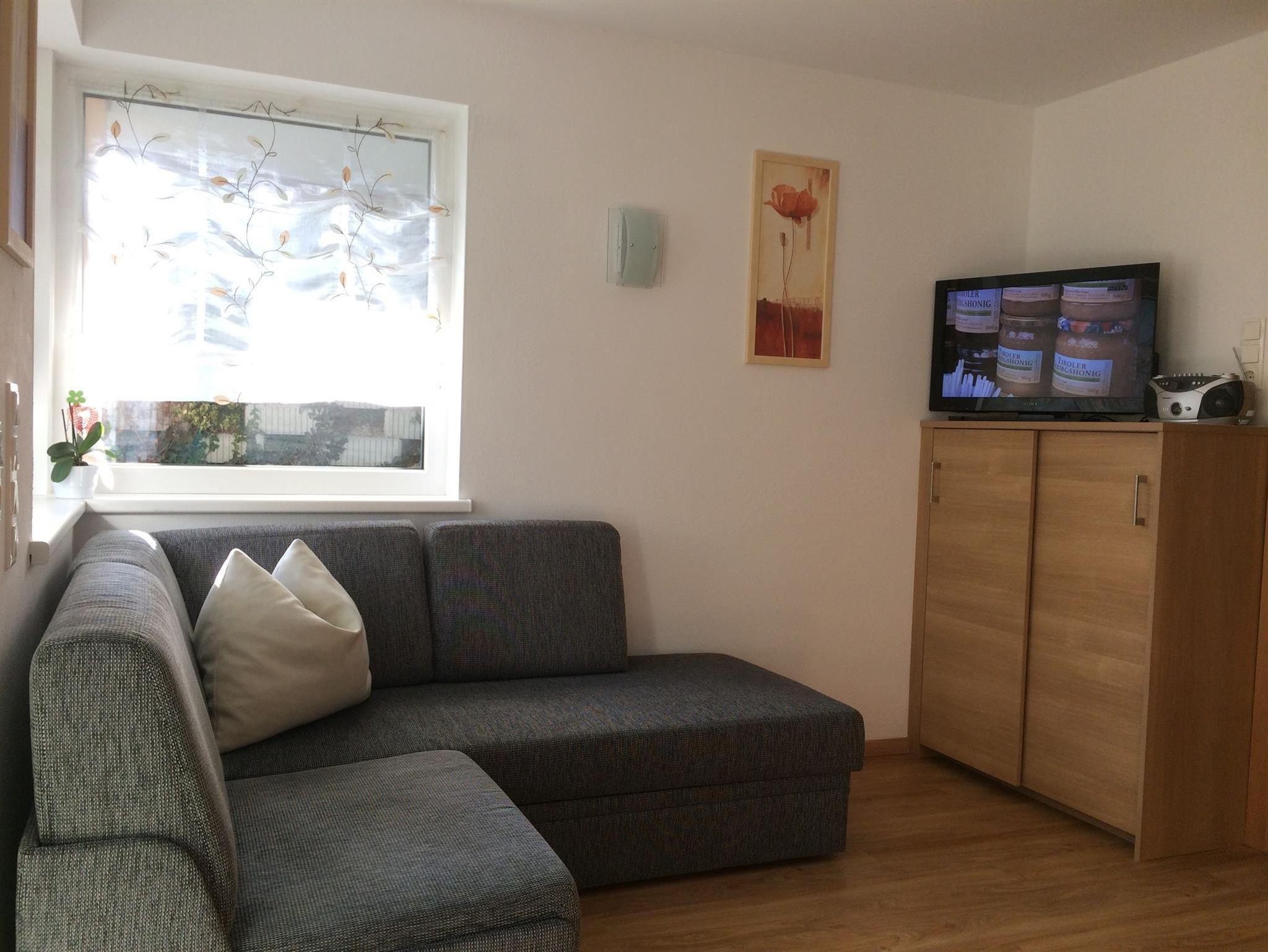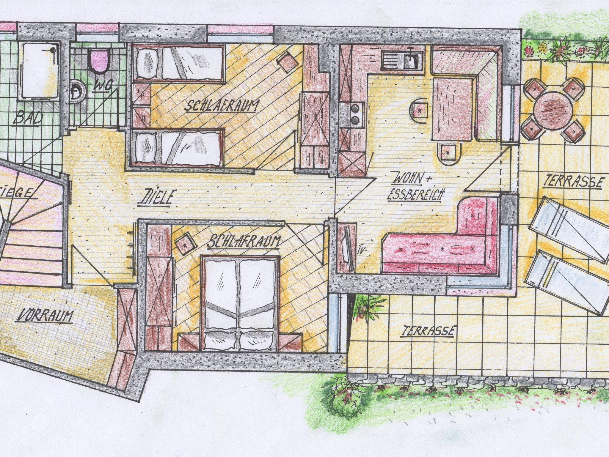 Unsere gemütliche 3-Raum-Ferienwohnung (ca. 54m²) besteht aus 2 getrennten Schlafzimmern, Wohnzimmer mit gemütlichem Sitzbereich und einer voll ausgestatteten Küche mit Backofen, Mikrowelle, Geschirrspüler, Kaffeemaschine (TABS-Eduscho) und Wasserkocher. Dusche/WC getrennt, Haarfön, Kabel-TV und einer eigenen überdachten Südterrasse.
