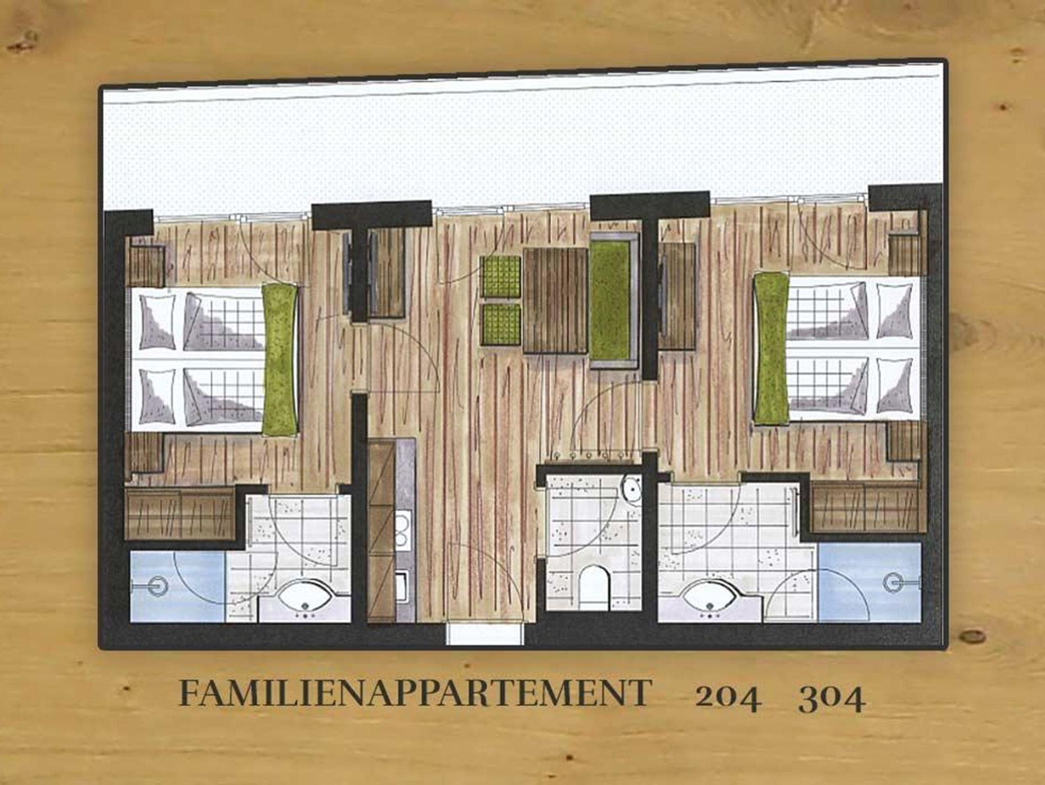 Familien Appartement Wohnraum mit Küche, Essplatz, 2 Schlafzimmer, 2 Bäder mit Dusche, WC separat, Flat TV, Balkon