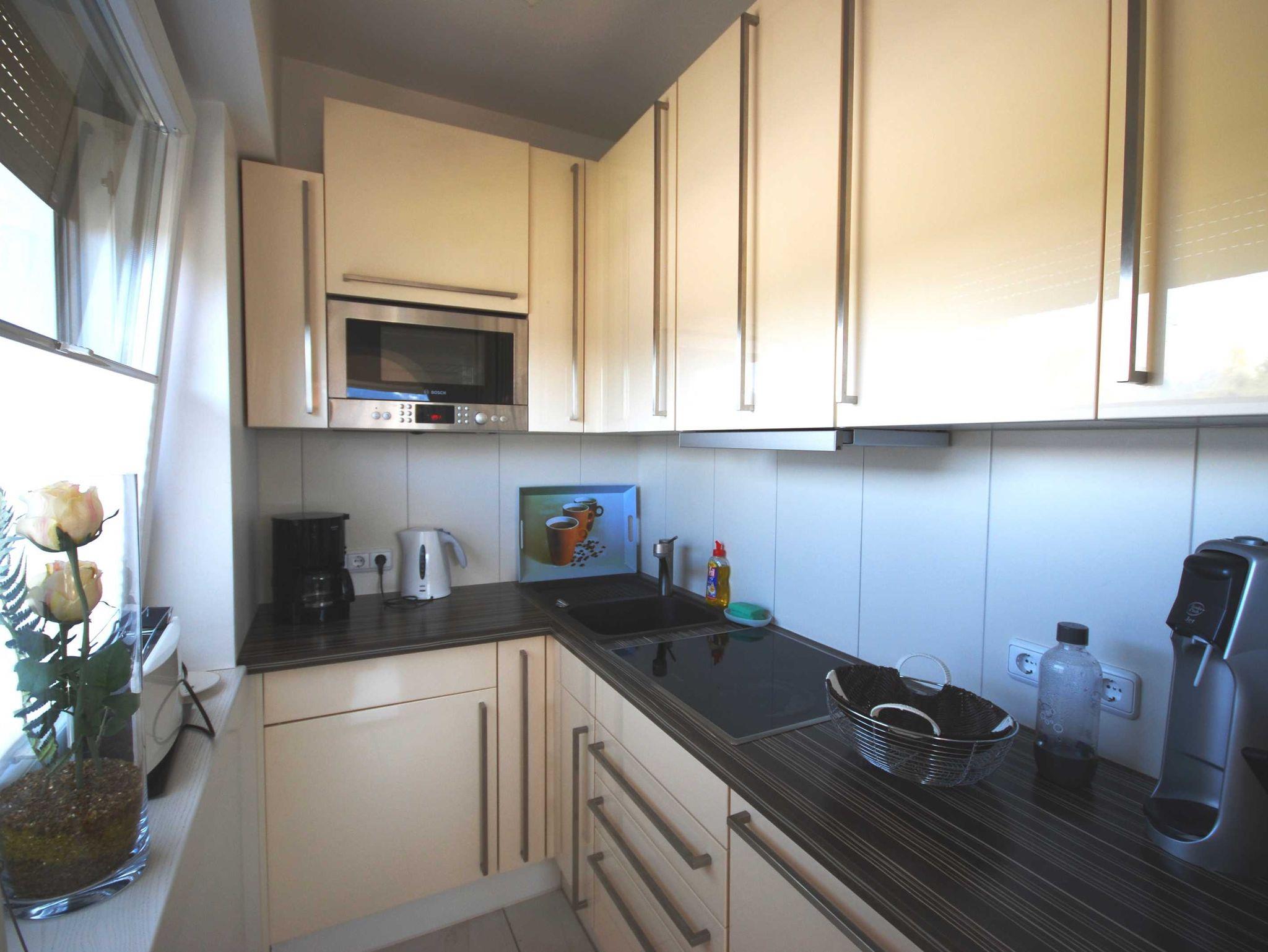Küche: voll ausgestattete Einbauküche mit Esstisch mit Stühlen, Mikrowelle mit Grillfunktion, Spülmaschine, Kühlschrank mit Gefrierfach, Cerankochfeld, Kaffeemaschine, Wasserkocher, Toaster und zahlreiche weitere Küchenutensilien.