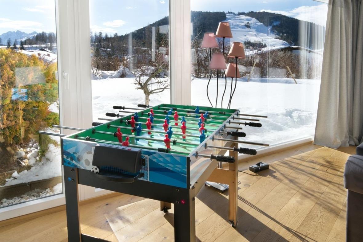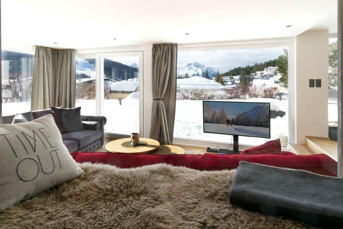 Große Panoramafenster spenden Licht und bieten einen schönen Blick auf die Bergwelt.