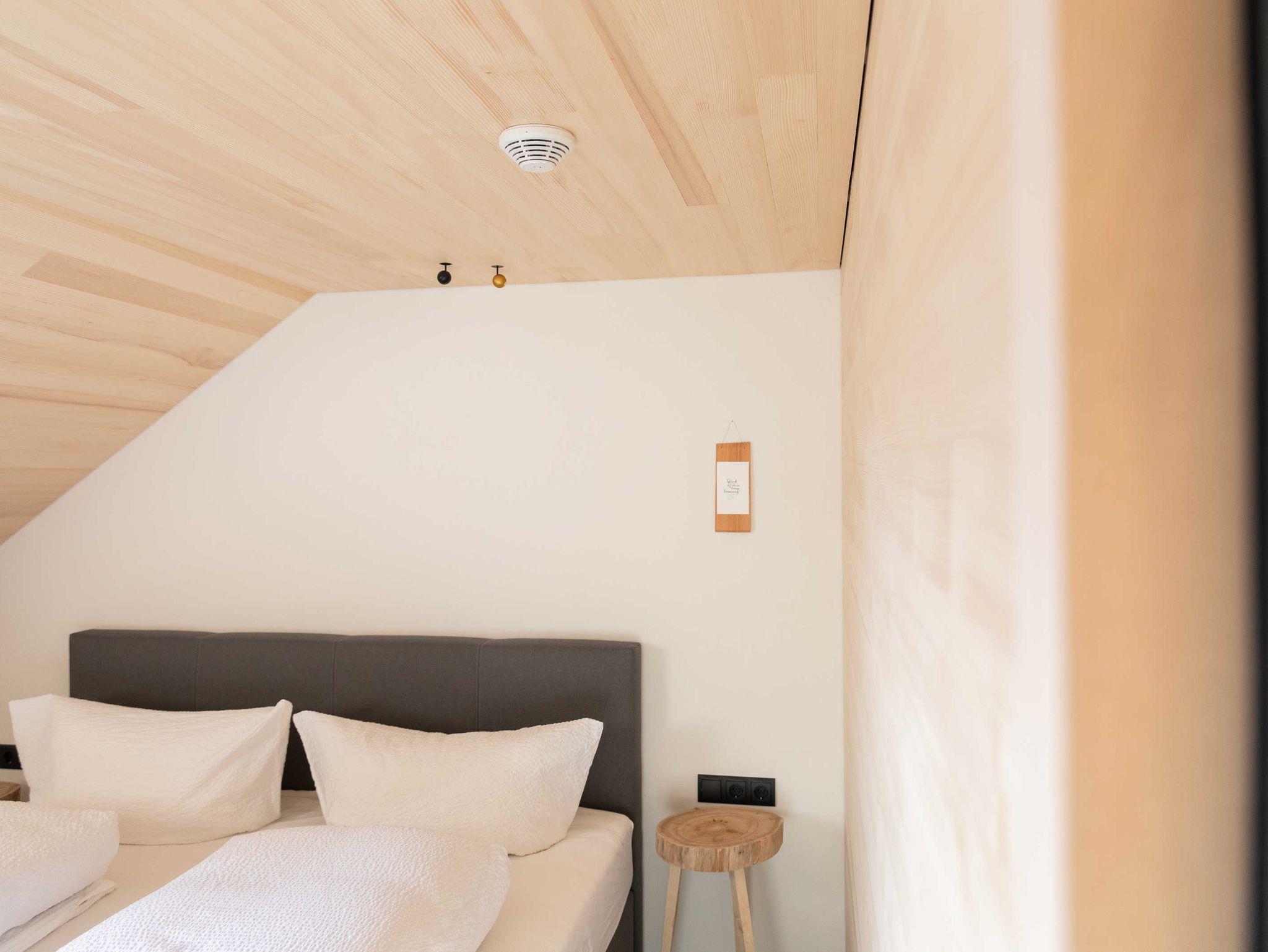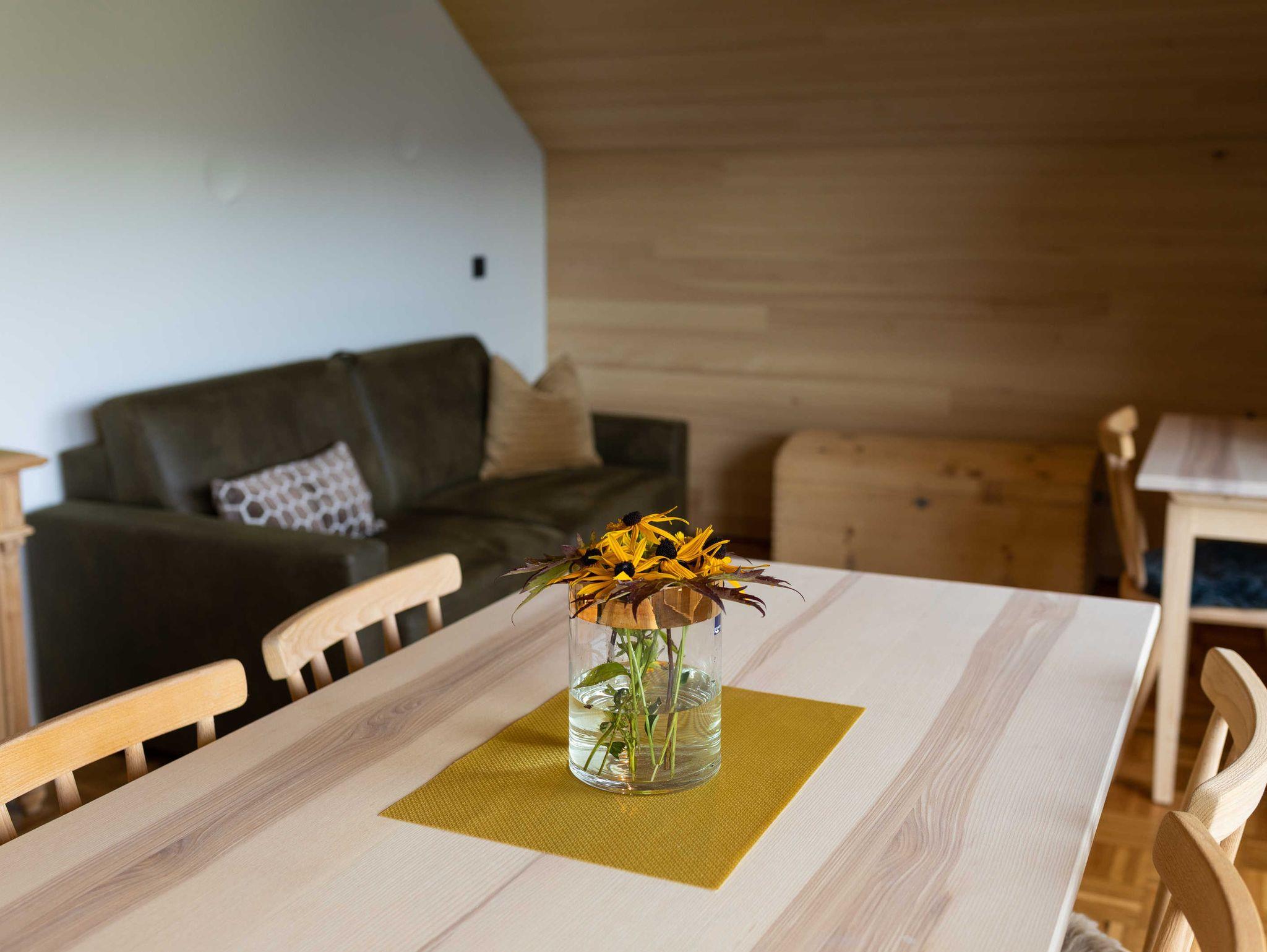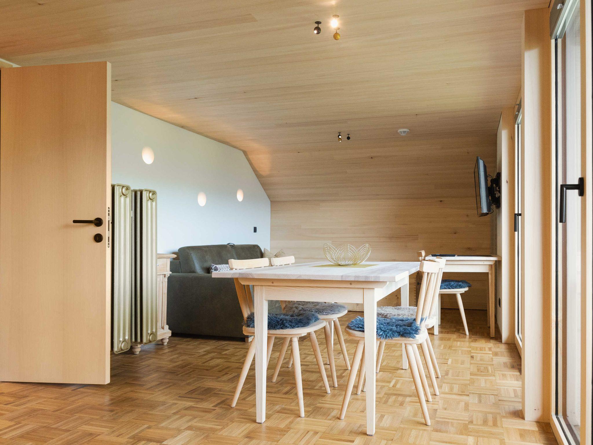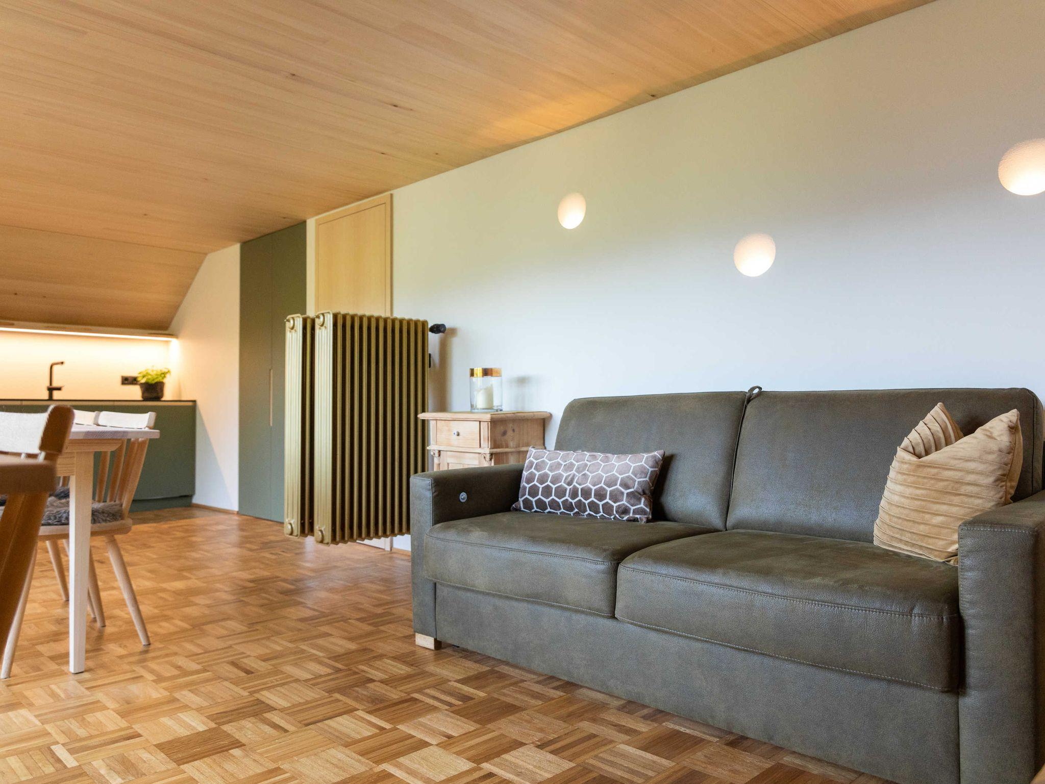 Die Küche ist mit Geschirrspüler, Herd, Backofen, Geschirr, Geschirrtüchern und mit einer Kaffeemaschine (Filtermaschine und Senseo-Pad) ausgestattet. Im Wohnraum steht ein Qualitätsschlafsofa für ein bis zwei Erwachsene zur Verfügung. Zur Ausstattung des Wohnraumes gehört ein Fernseher mit Smart-TV-Funktionen, sowie kostenfreies WLAN. Das separate südseitig ausgerichtete Schlafzimmer mit einem Doppelboxspringbett und das Badezimmer sind ebenfalls von qualitativer Bregenzerwälder Handarbeit gekennzeichnet. Handtücher und Bettwäsche sind ausreichend und zum Wechseln vorhanden. Der Zugang und der Vorraum sind großzügig gestaltet.