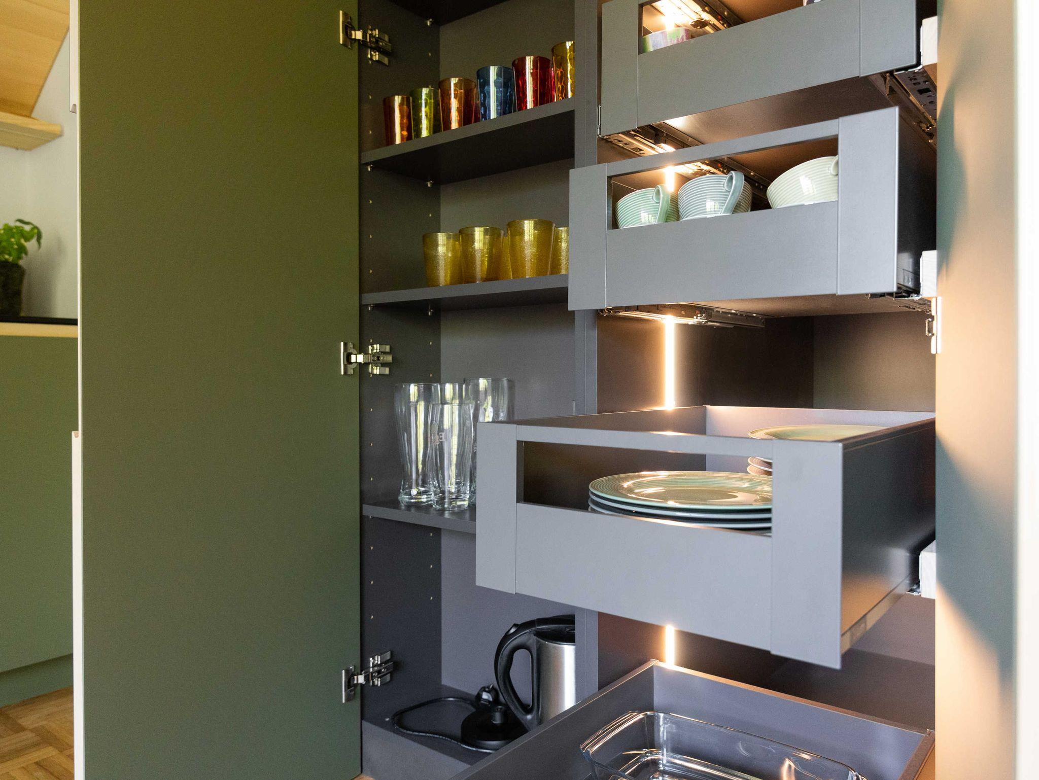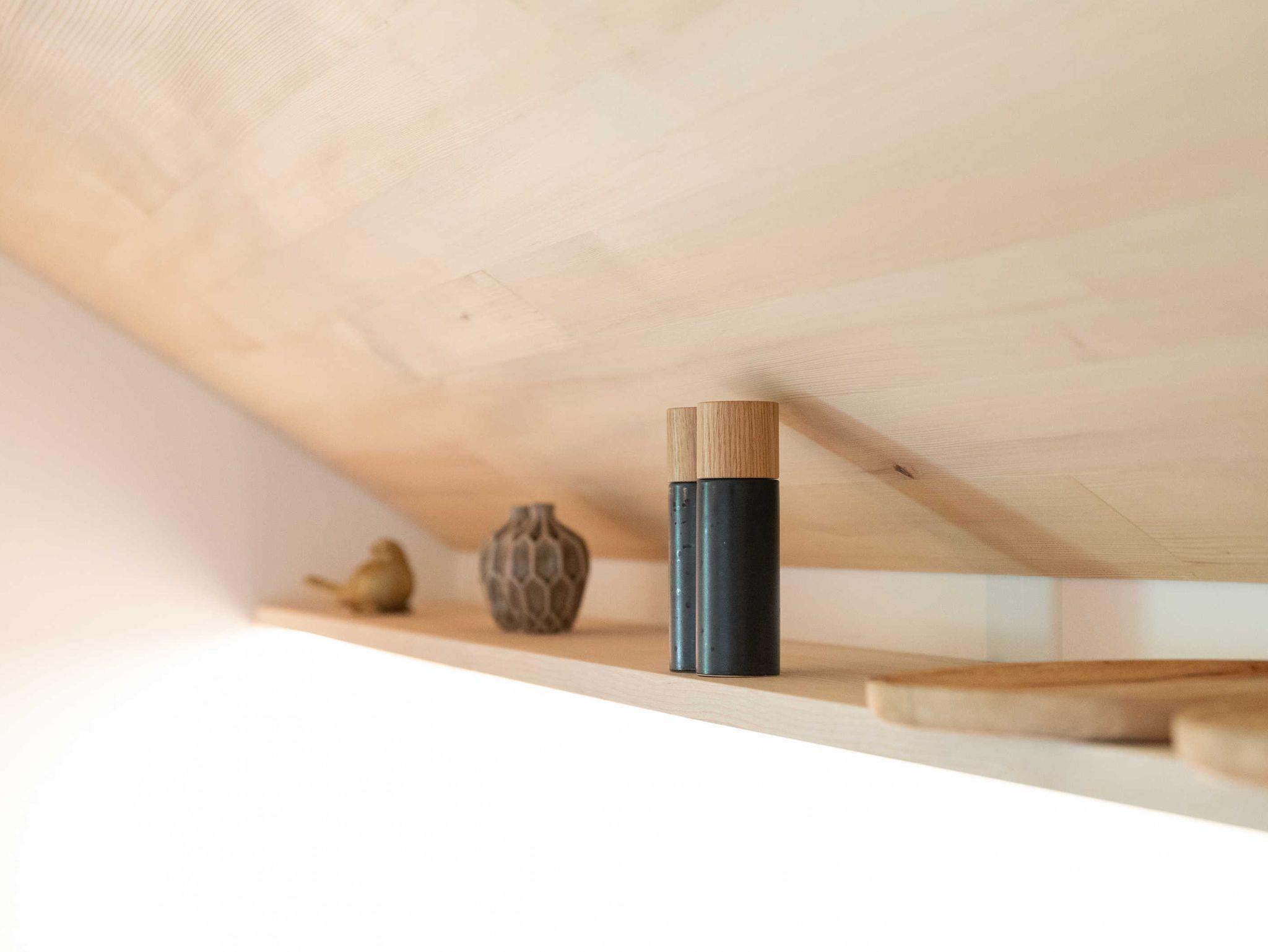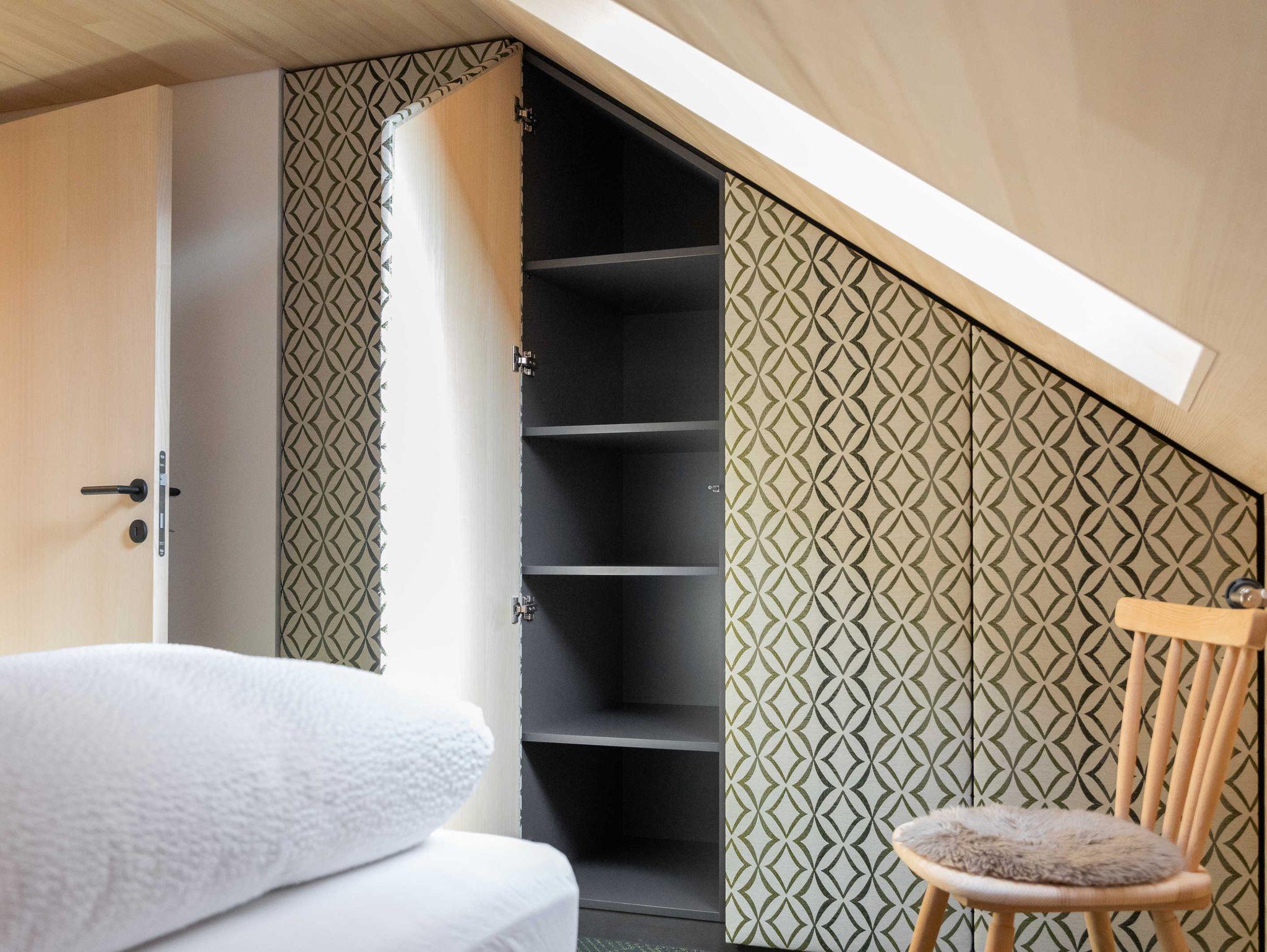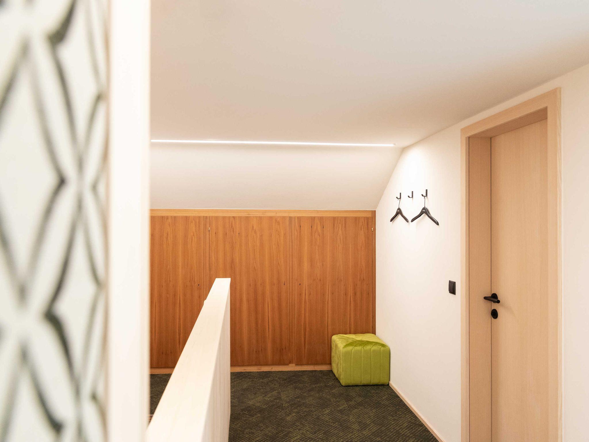 Die Küche ist mit Geschirrspüler, Herd, Backofen, Geschirr, Geschirrtüchern und mit einer Kaffeemaschine (Filtermaschine und Senseo-Pad) ausgestattet. Im Wohnraum steht ein Qualitätsschlafsofa für ein bis zwei Erwachsene zur Verfügung. Zur Ausstattung des Wohnraumes gehört ein Fernseher mit Smart-TV-Funktionen, sowie kostenfreies WLAN. Das separate südseitig ausgerichtete Schlafzimmer mit einem Doppelboxspringbett und das Badezimmer sind ebenfalls von qualitativer Bregenzerwälder Handarbeit gekennzeichnet. Handtücher und Bettwäsche sind ausreichend und zum Wechseln vorhanden. Der Zugang und der Vorraum sind großzügig gestaltet.