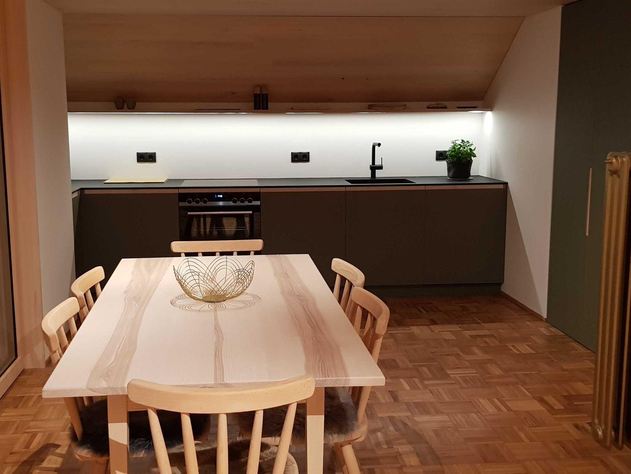 Die Ferienwohnung Ifen wurde 2021 vollständig renoviert und umgestaltet. Es steht nun ostseitig ein großzügiger Wohn-, Ess- und Schlafraum mit integrierter Küche und Balkon und ein Schlafzimmer zur Verfügung. Die Räume sind hochwertig mit heimischem Holz aus Weißtanne getäfert. Die Möbel und die Küche stammen vom Bregenzerwälder Tischlermeister. Die Planung und die Beleuchtung stammt von Georg Bechter Licht und Architektur aus Hittisau.