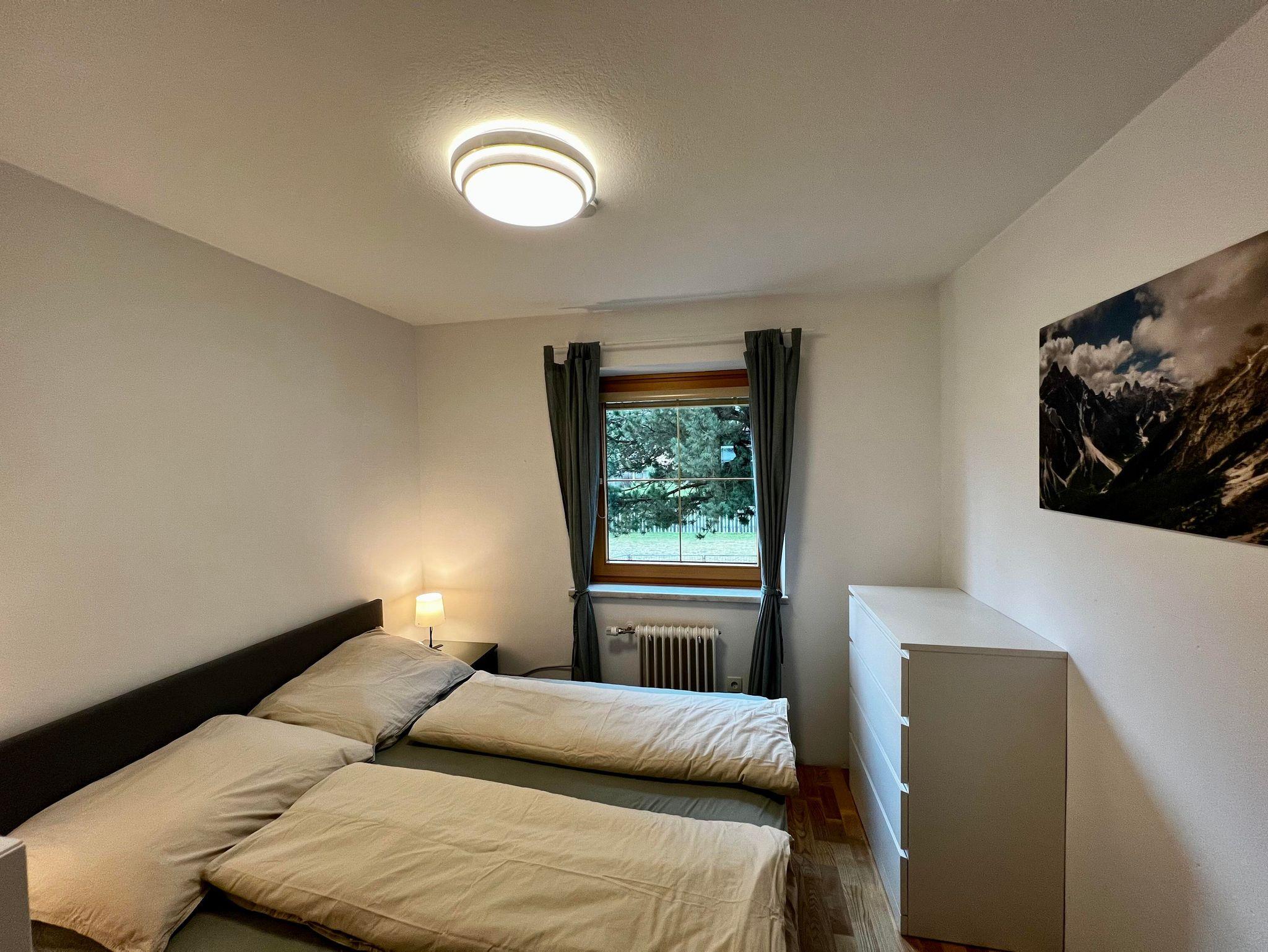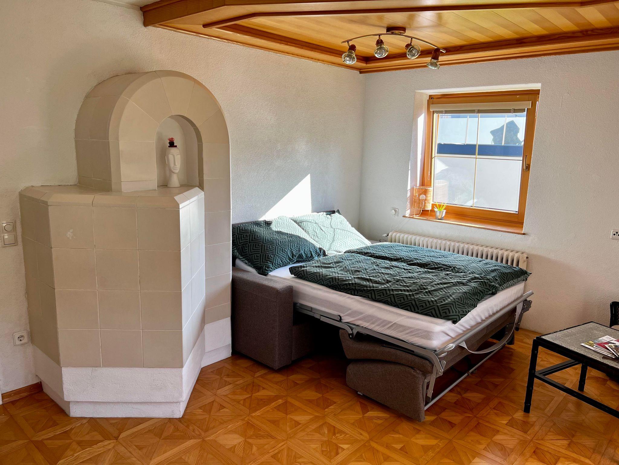 2 Schlafzimmer mit modernen Betten und 1 Wohnzimmer mit Ausziehcouch + Kamin bieten Platz für Entspannung auf ingesamt 70m², Gitterbett auf Anfrage kostenlos.