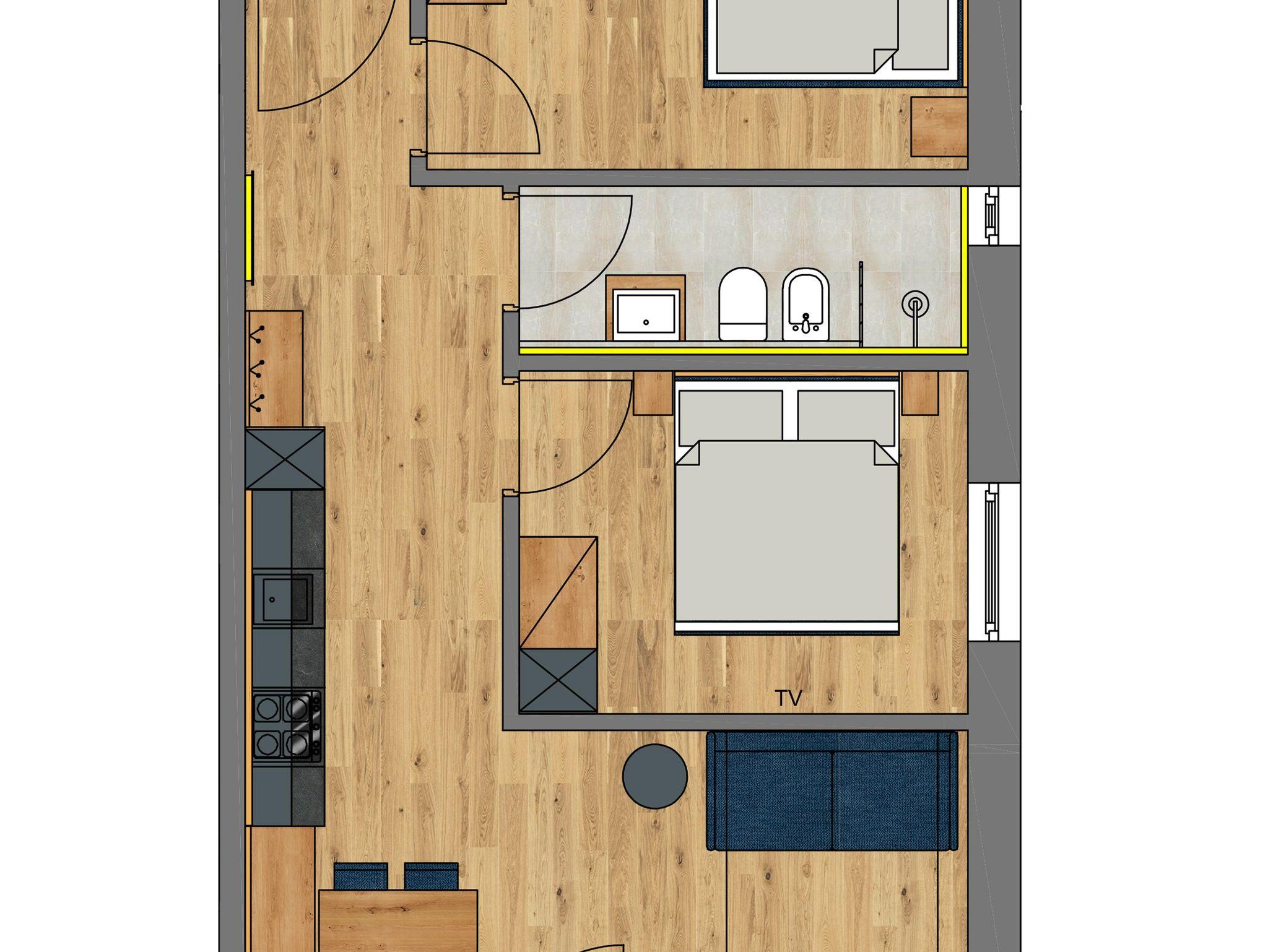 Hier findest du einen kompletten Wohnraum mit Ausziehsofa, Essecke und eine ausgestattete Küche, zwei geräumige Schlafzimmer (eines ev. mit Stockbett) sowie ein helles Bad.