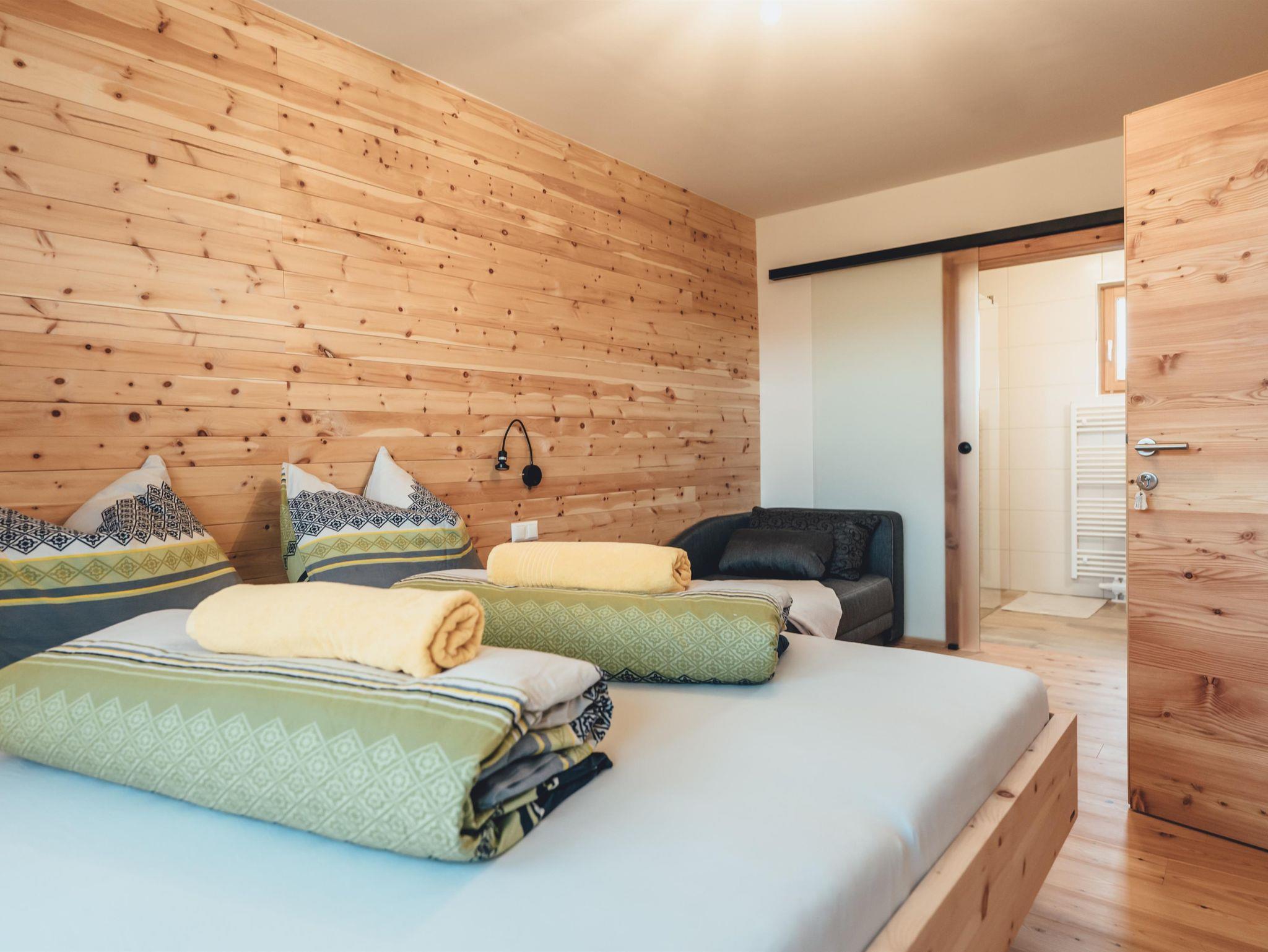 Zirben – Schlafzimmer Nr. 1 mit Doppelbett, Sofaliege; Bad Nr. 1 mit Dusche/WC. Gemeinsamer Vorraum.
